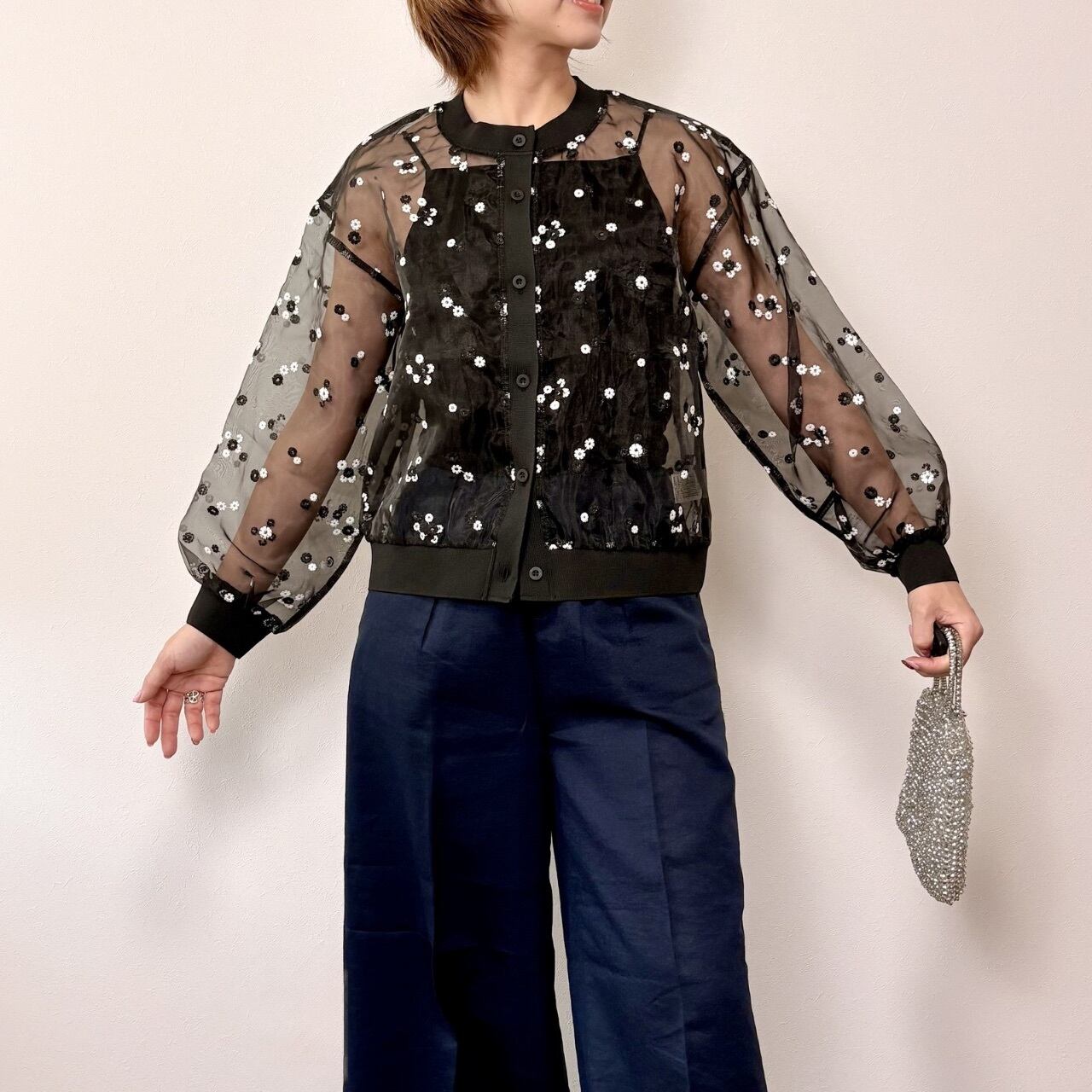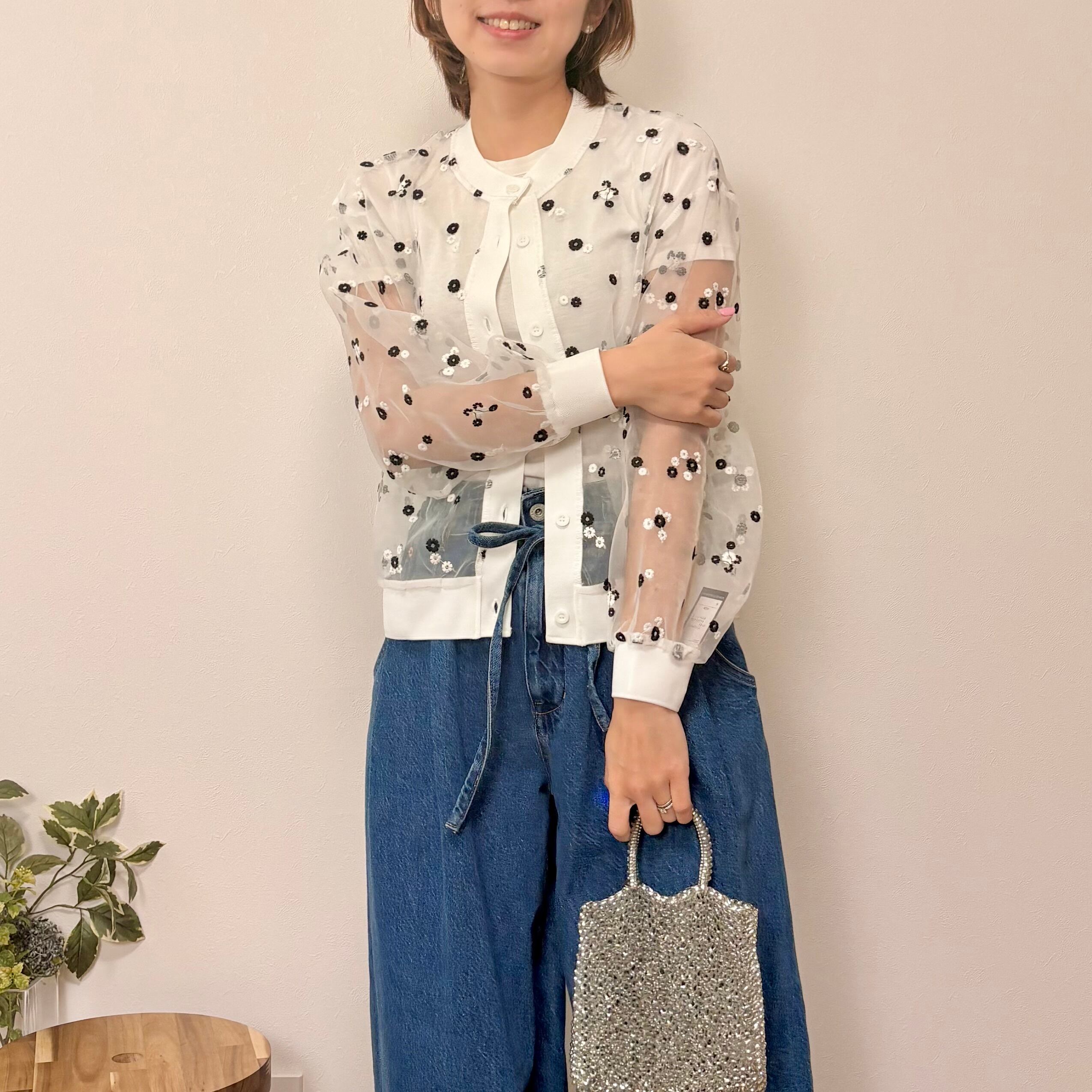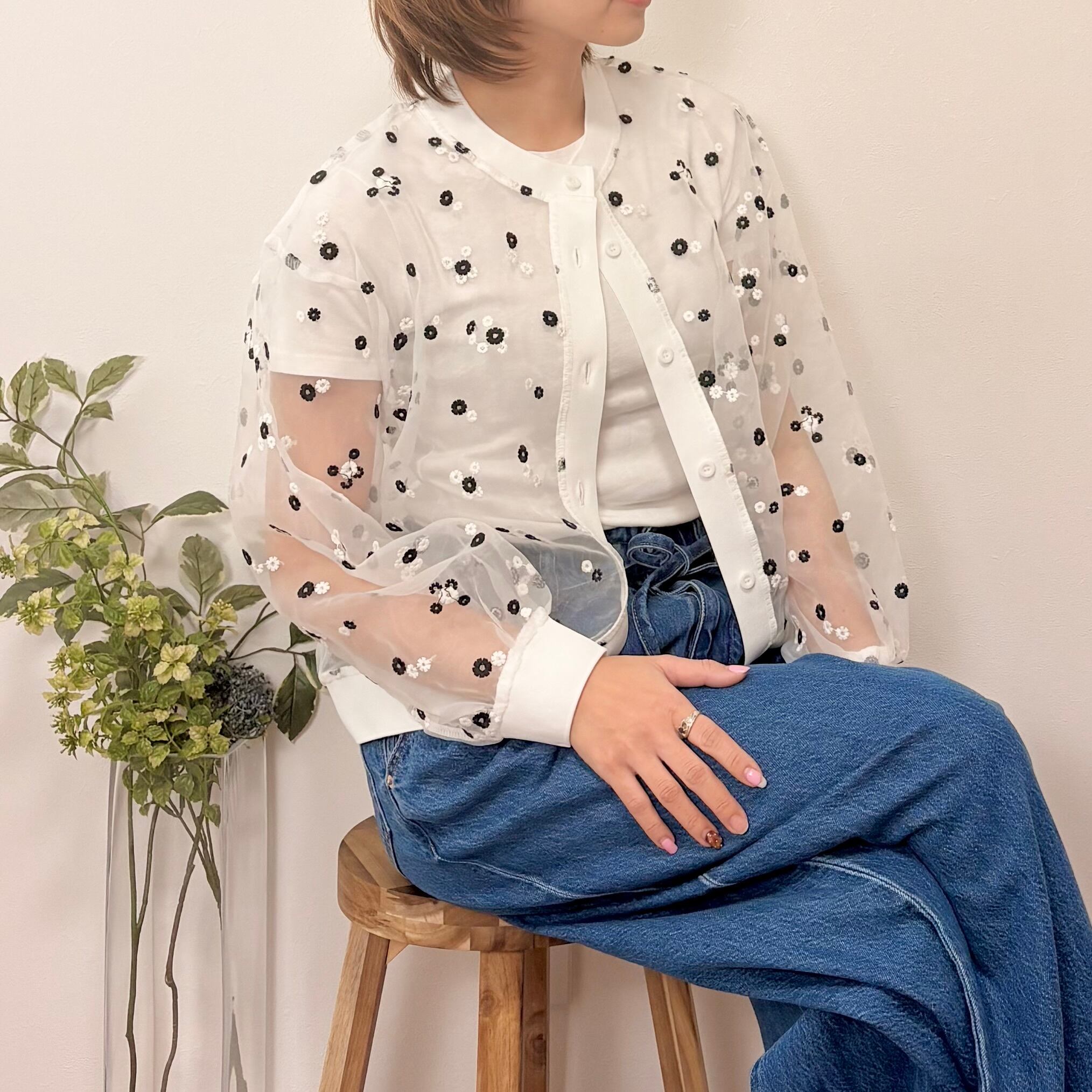 繊細な花柄刺繍が目を惹く、シアーカーディガン。