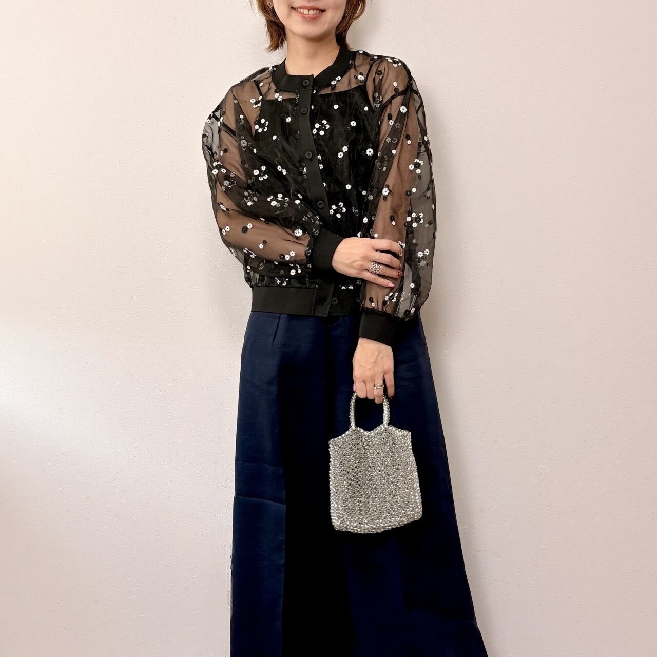 フラワー刺繍が立体的に浮かび上がり、シンプルなコーディネートにも華やかさをプラスしてくれます。