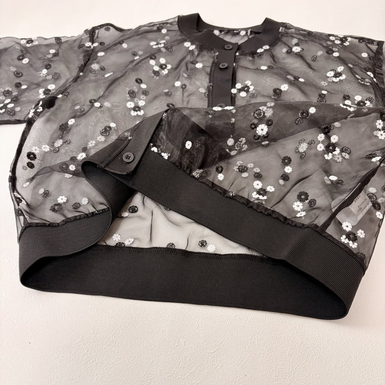 透け感のある軽やかな素材に、立体感のあるフラワー刺繍を散りばめた華やかなデザインです。