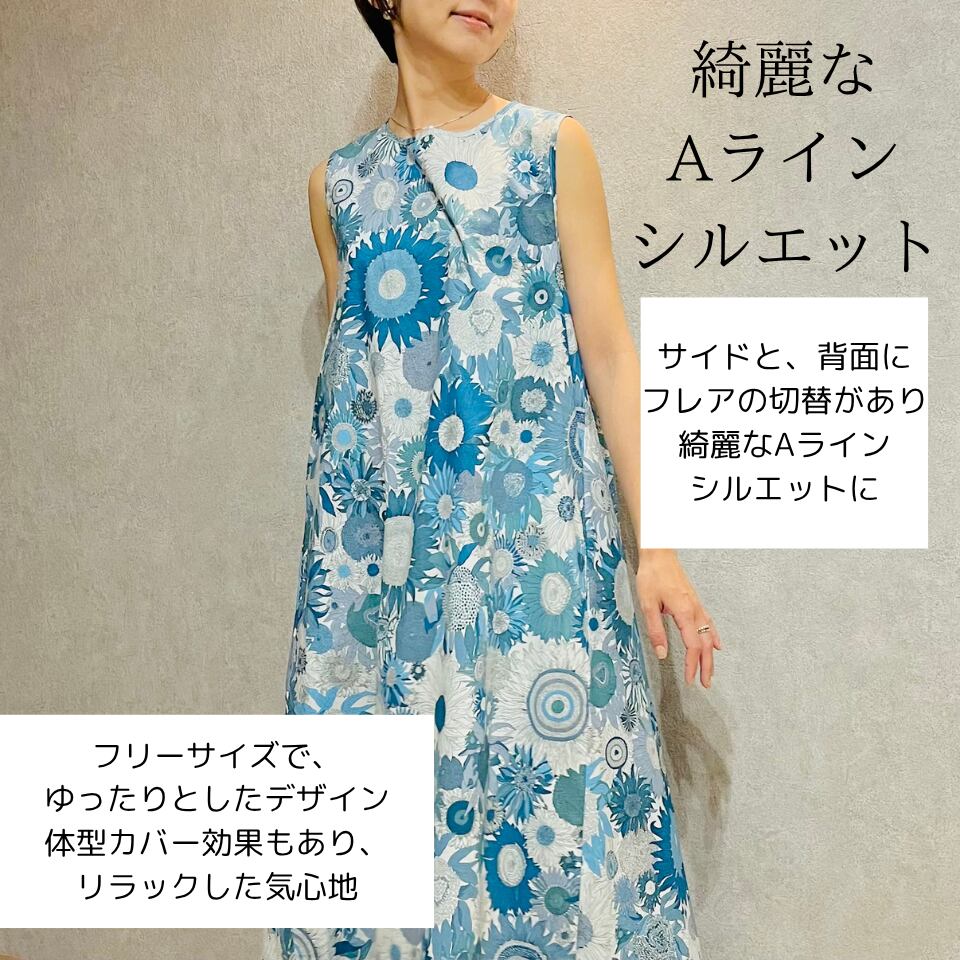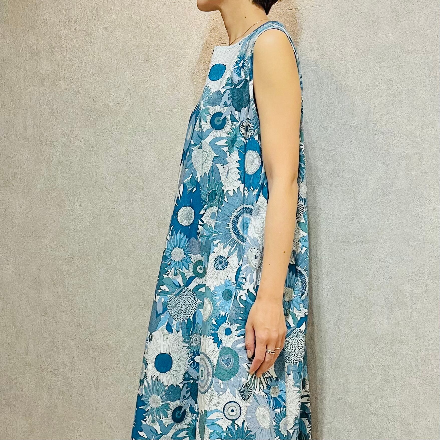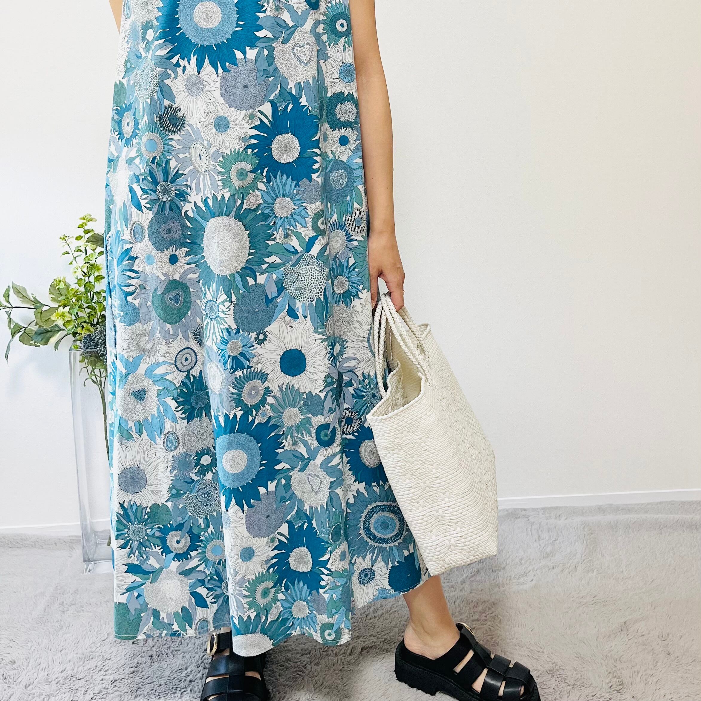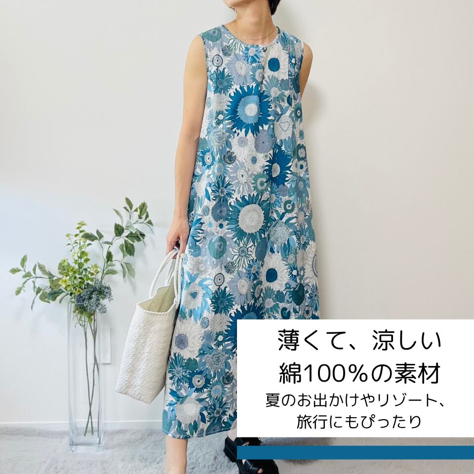 リバティ柄ひまわりマキシ丈ワンピース / リゾートワンピ 花柄 華やか 涼しい 綿100% おしゃれ 大人カジュアル 着回し ゆったり 体型カバー リラックス 動きやすい 送料無料(フリーサイズ / ブルー、グリーン)85850