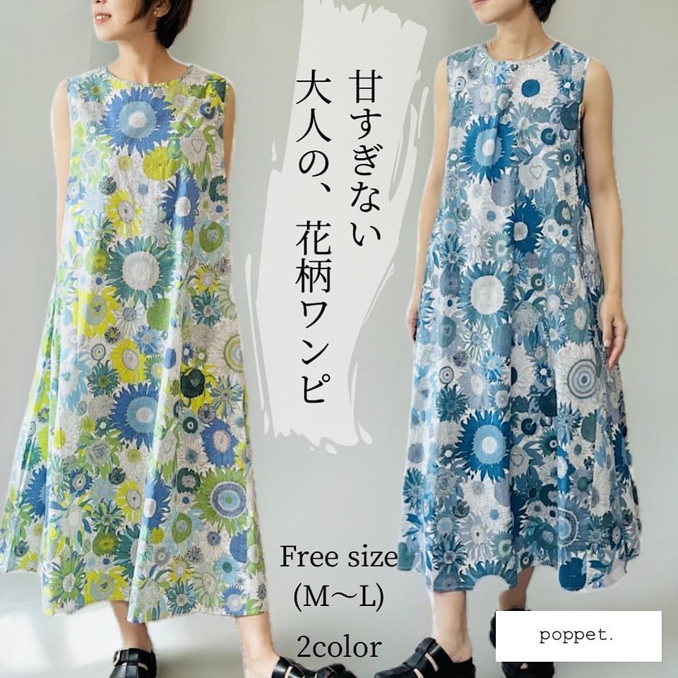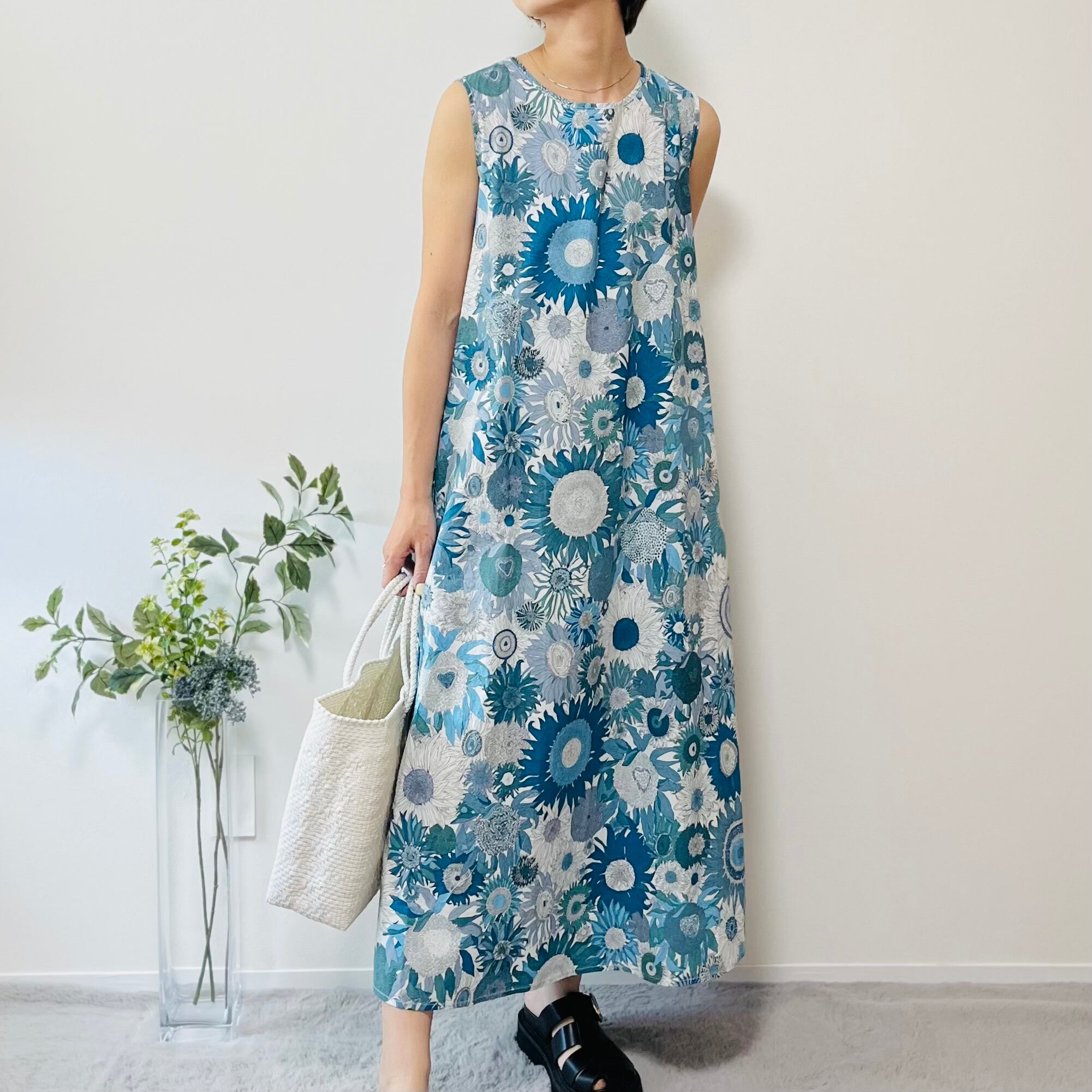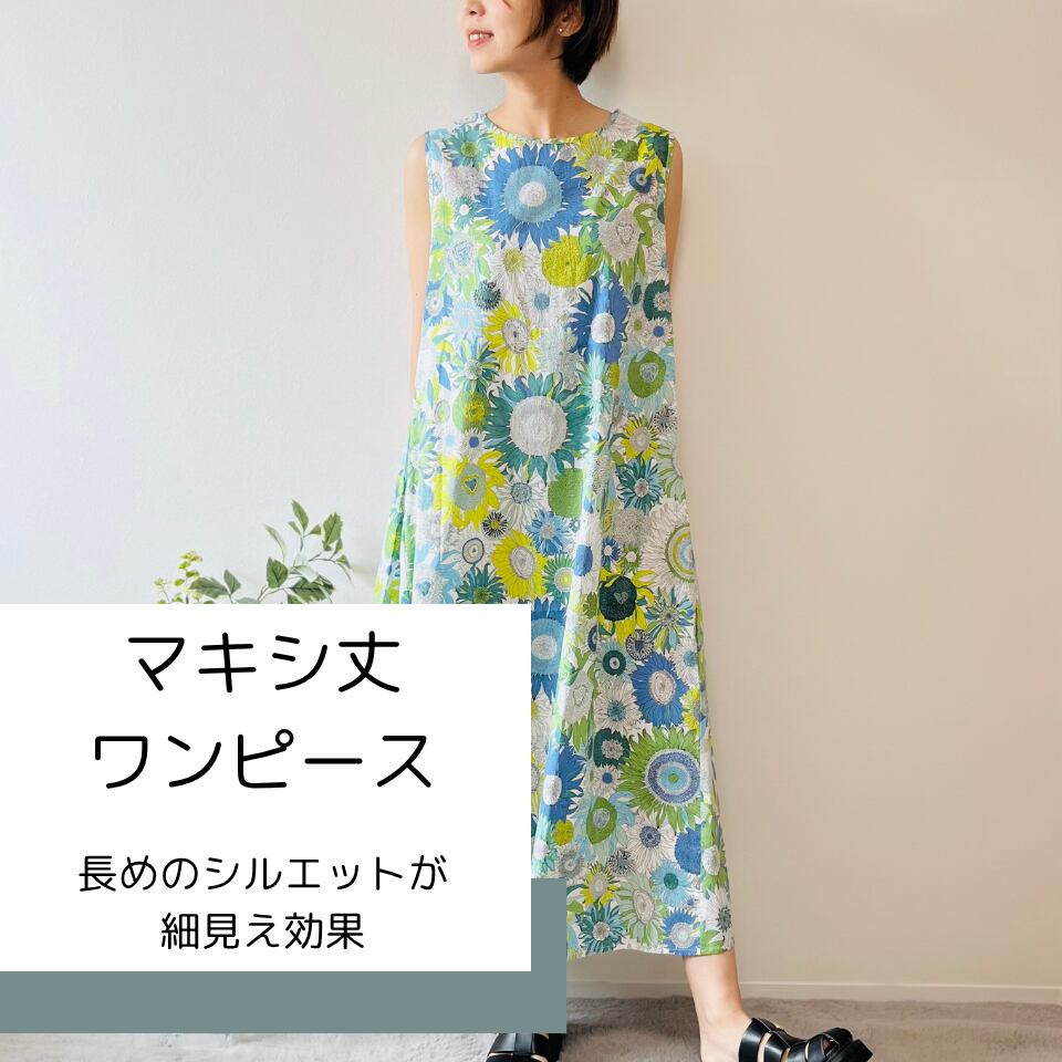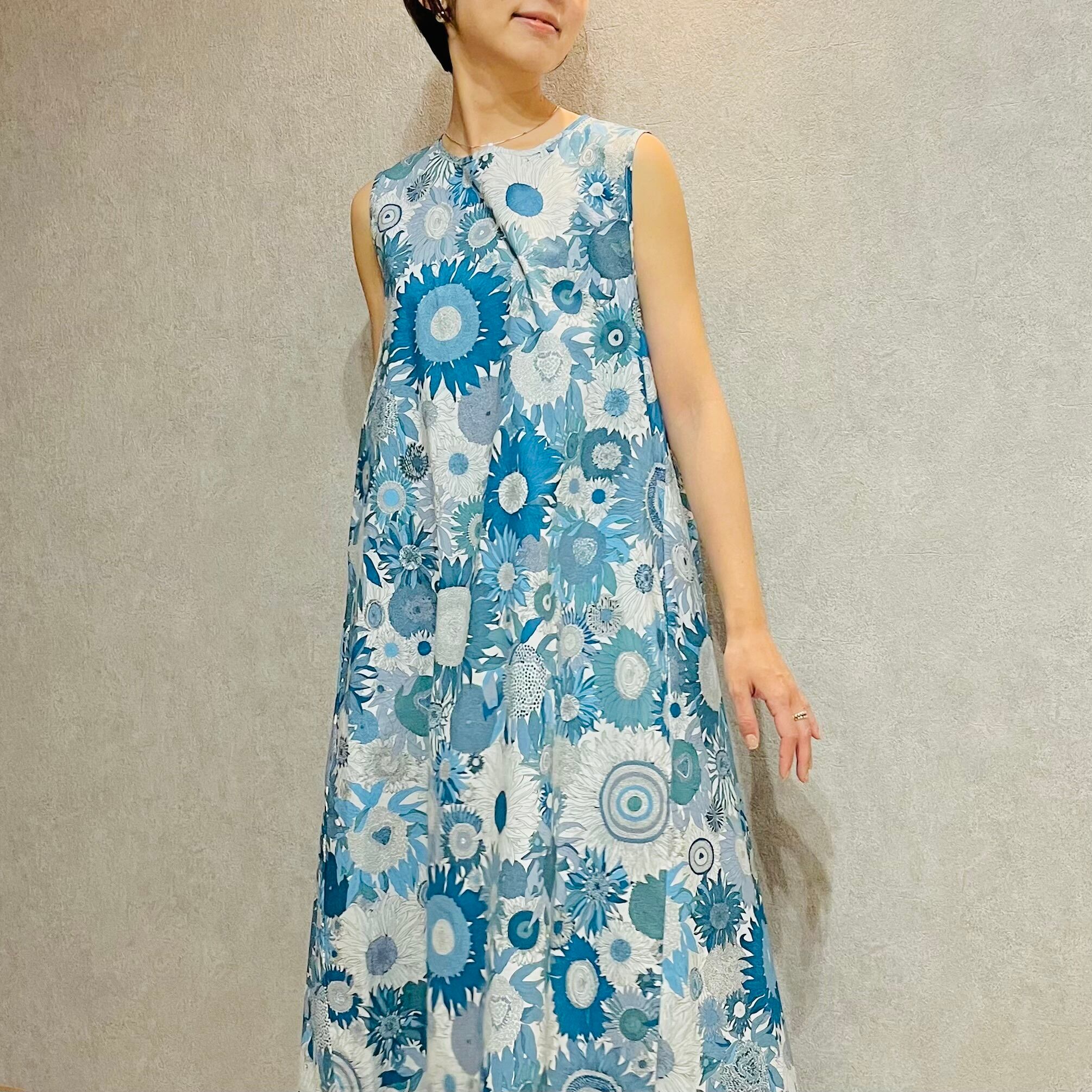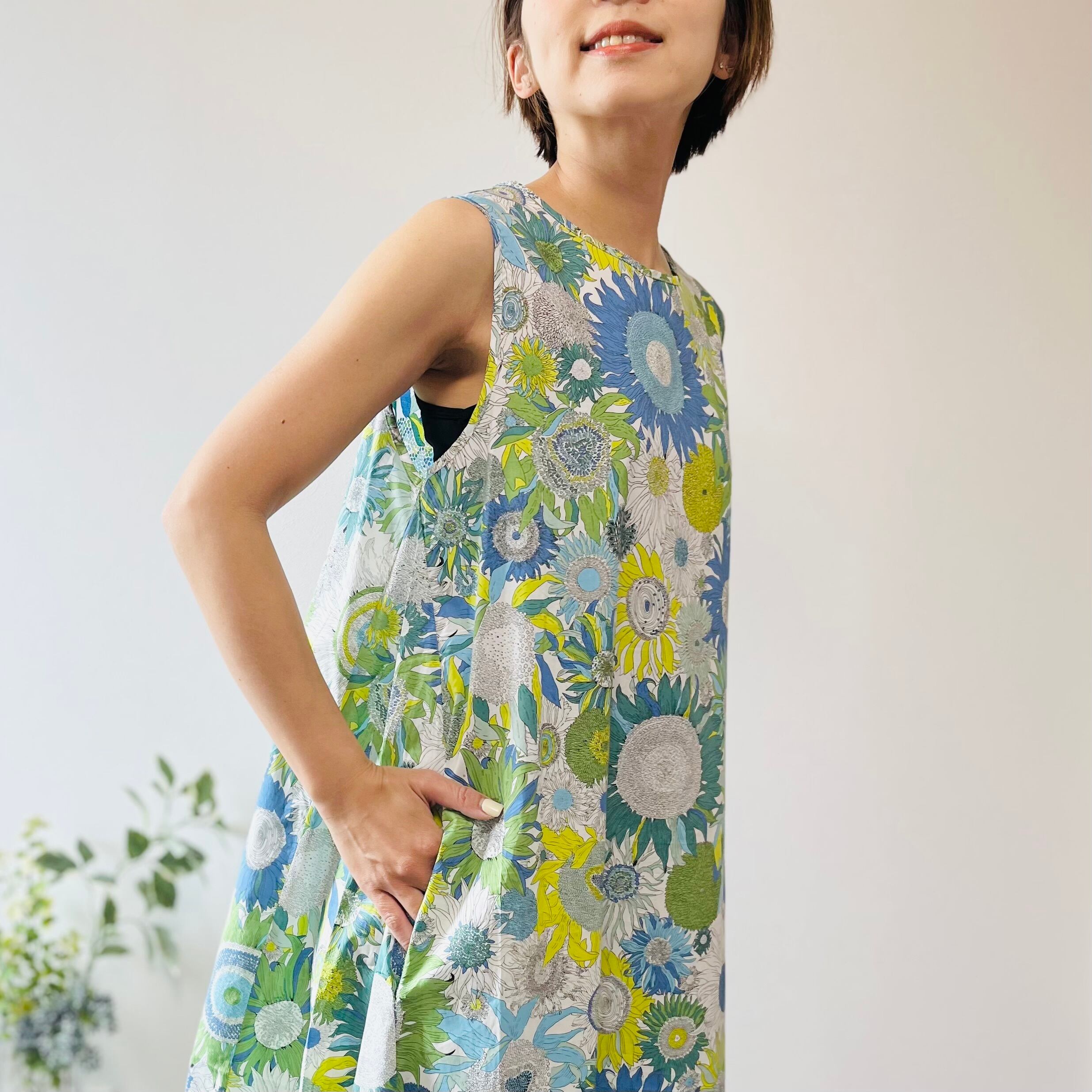 リバティ柄ひまわりマキシ丈ワンピース / リゾートワンピ 花柄 華やか 涼しい 綿100% おしゃれ 大人カジュアル 着回し ゆったり 体型カバー リラックス 動きやすい 送料無料(フリーサイズ / ブルー、グリーン)85850
