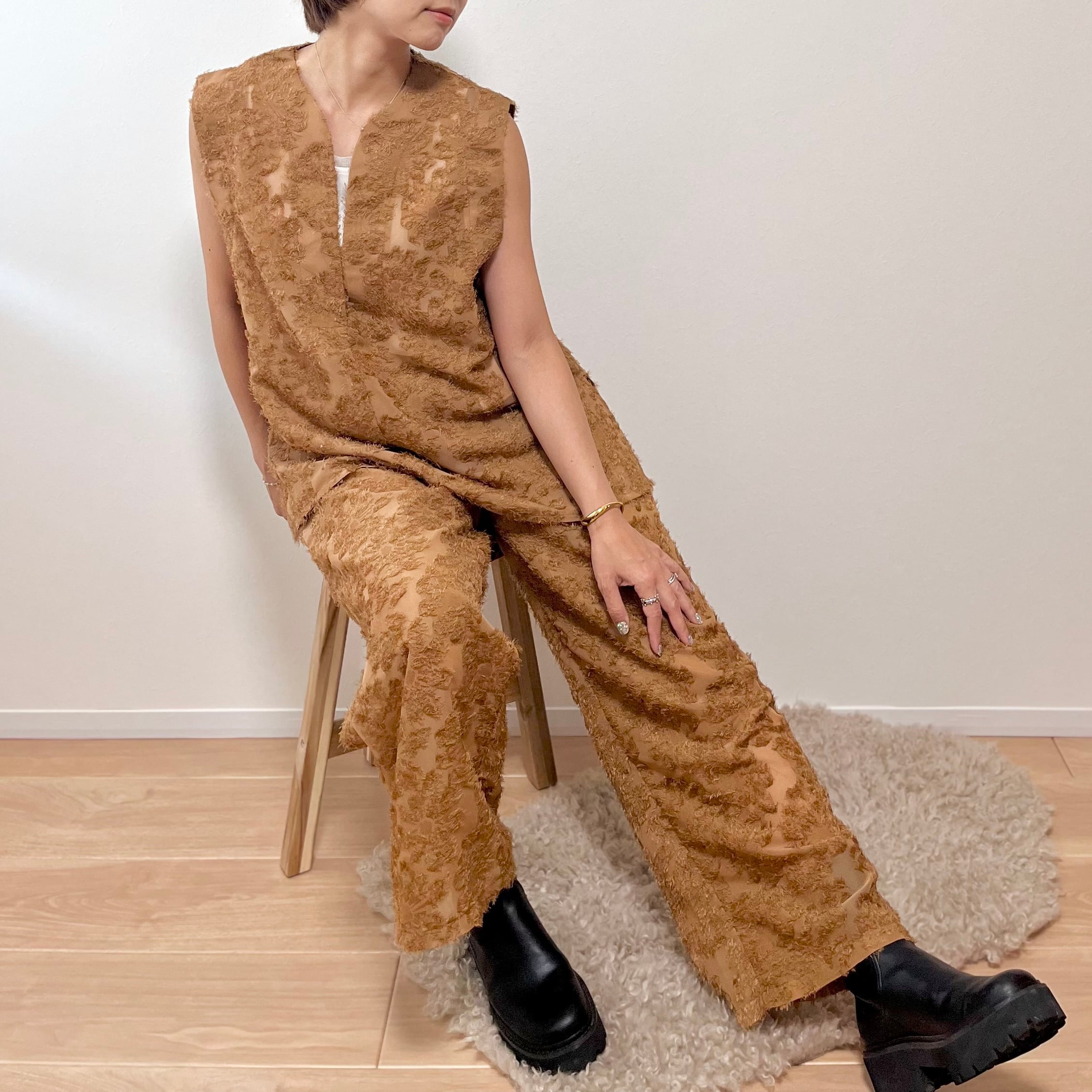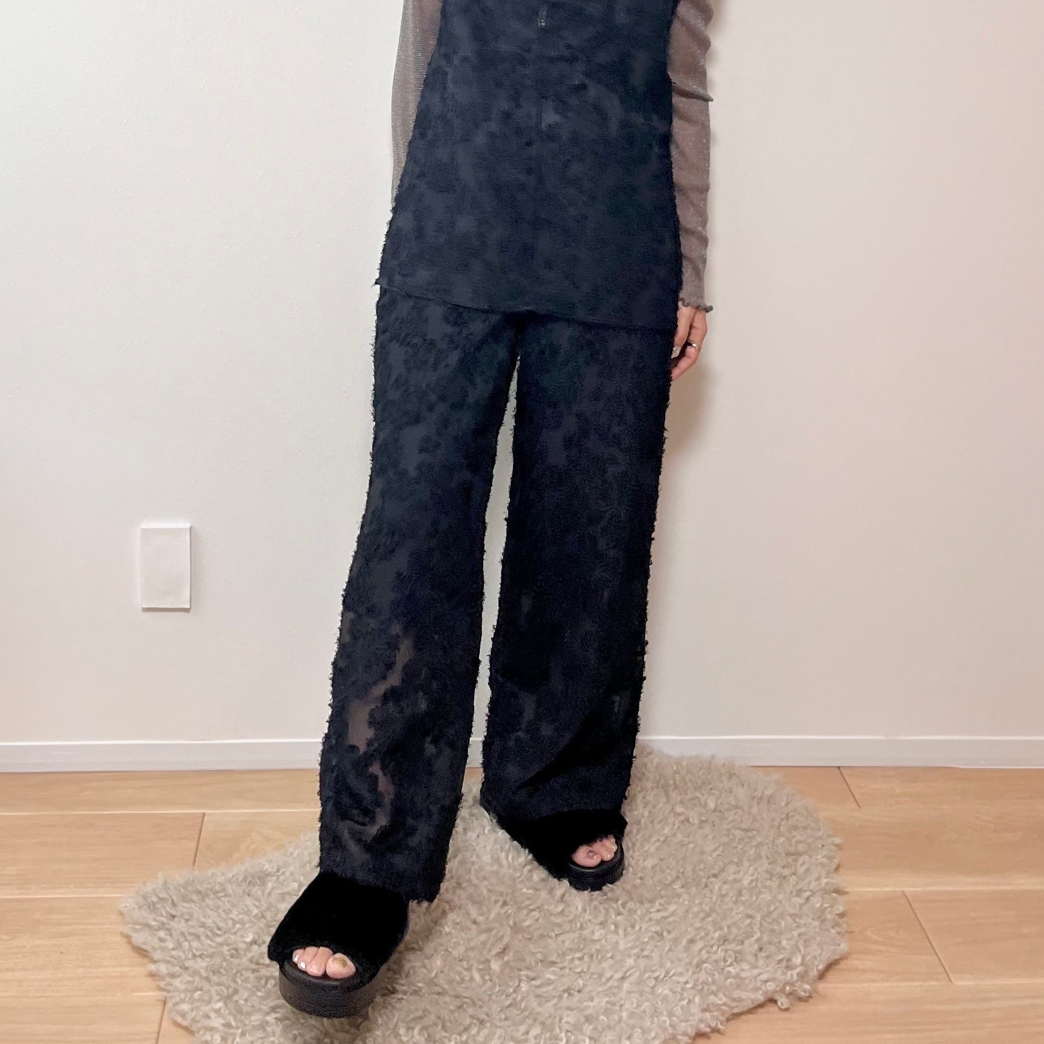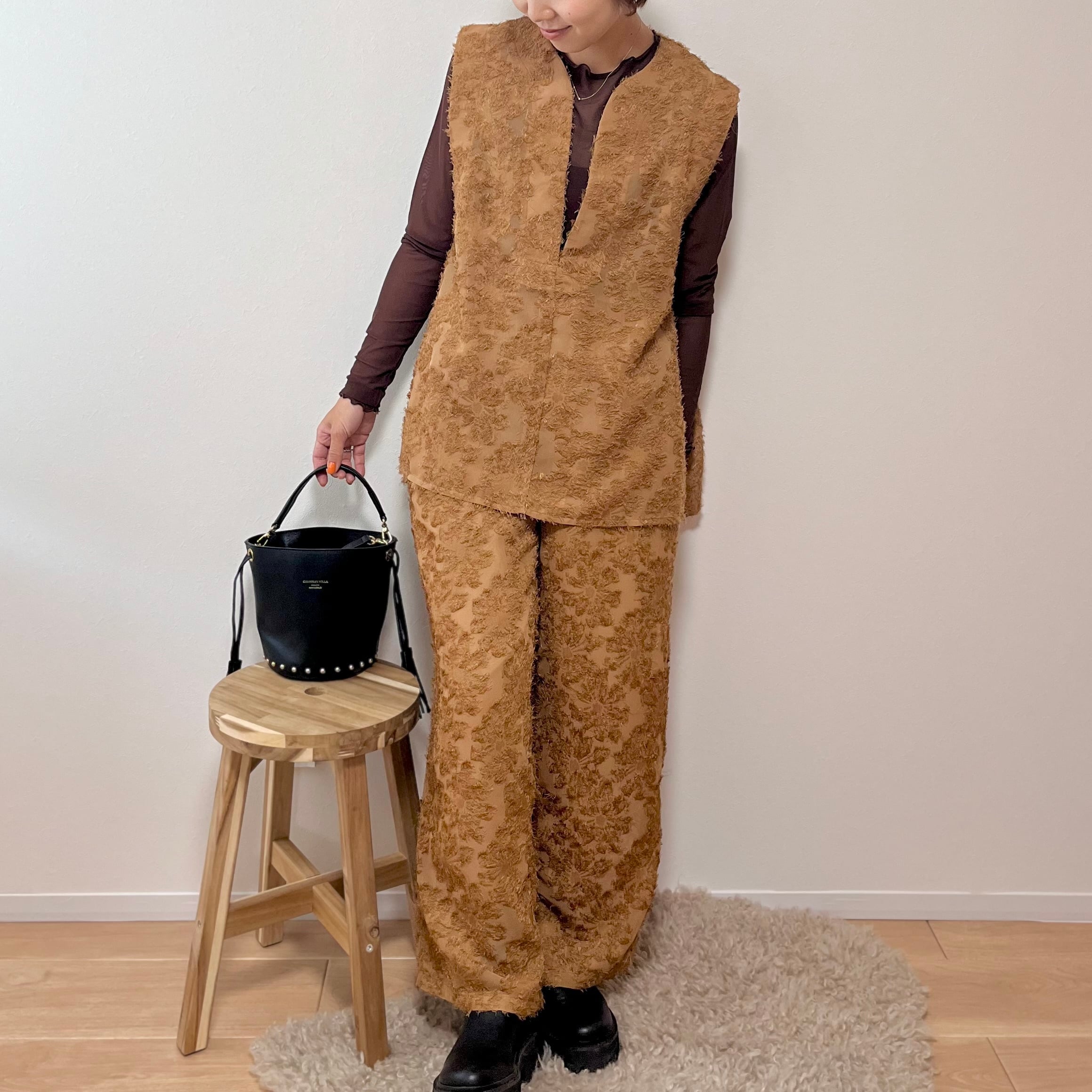 フリンジジャガードパンツ/《セットアップ対応》2way piacere ピアッチェーレ アンサンブル ウエストゴム ロング丈 長ズボン デザインパンツ ジャガード生地 フリンジ生地 透けデザイン フリーサイズ M L ブラック くろ 黒 ブラウン キャメル 茶 ベージュ 夏 秋 春/P65511 | poppet online◇instagramで商品紹介中♪