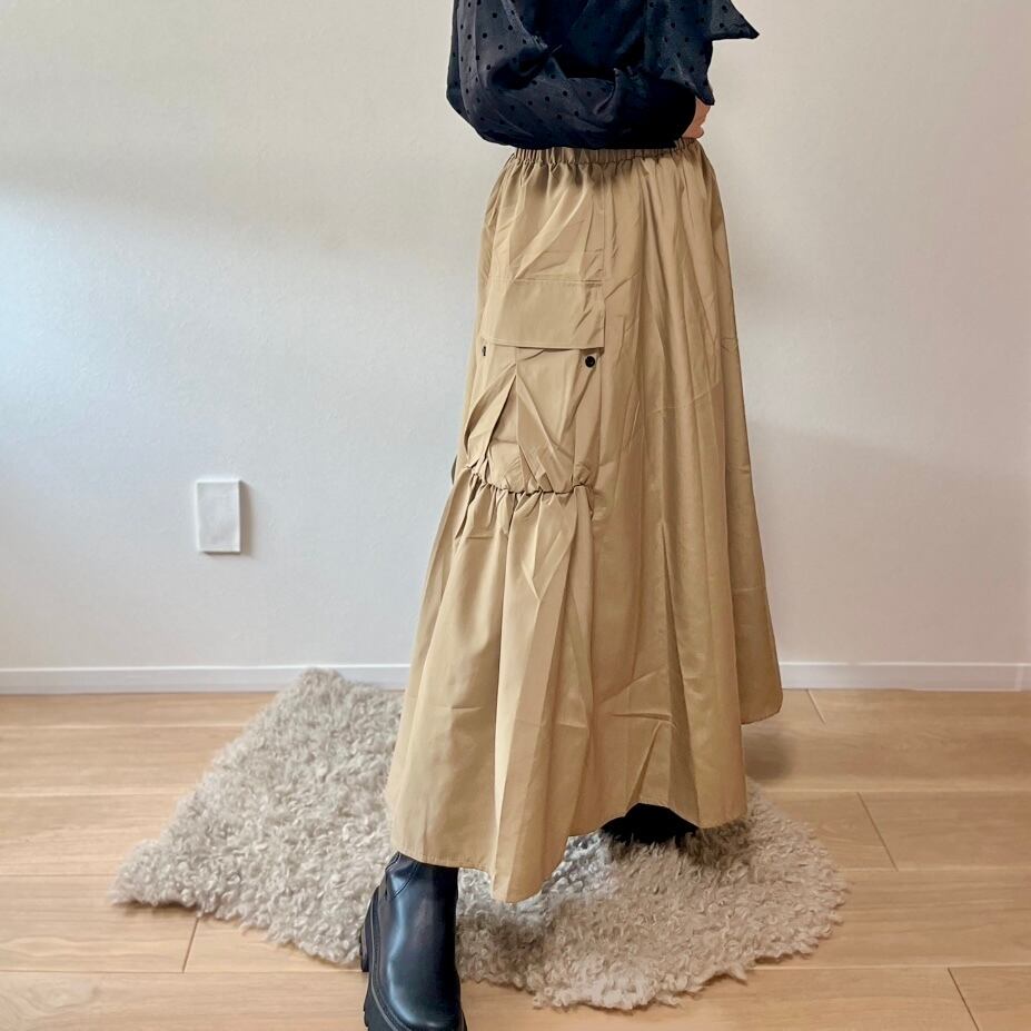 ◇両サイドにデザインされたデザインポケット。ポケット下に寄せられたギャザーから広がるフレアデザインがおしゃれなアイテム。