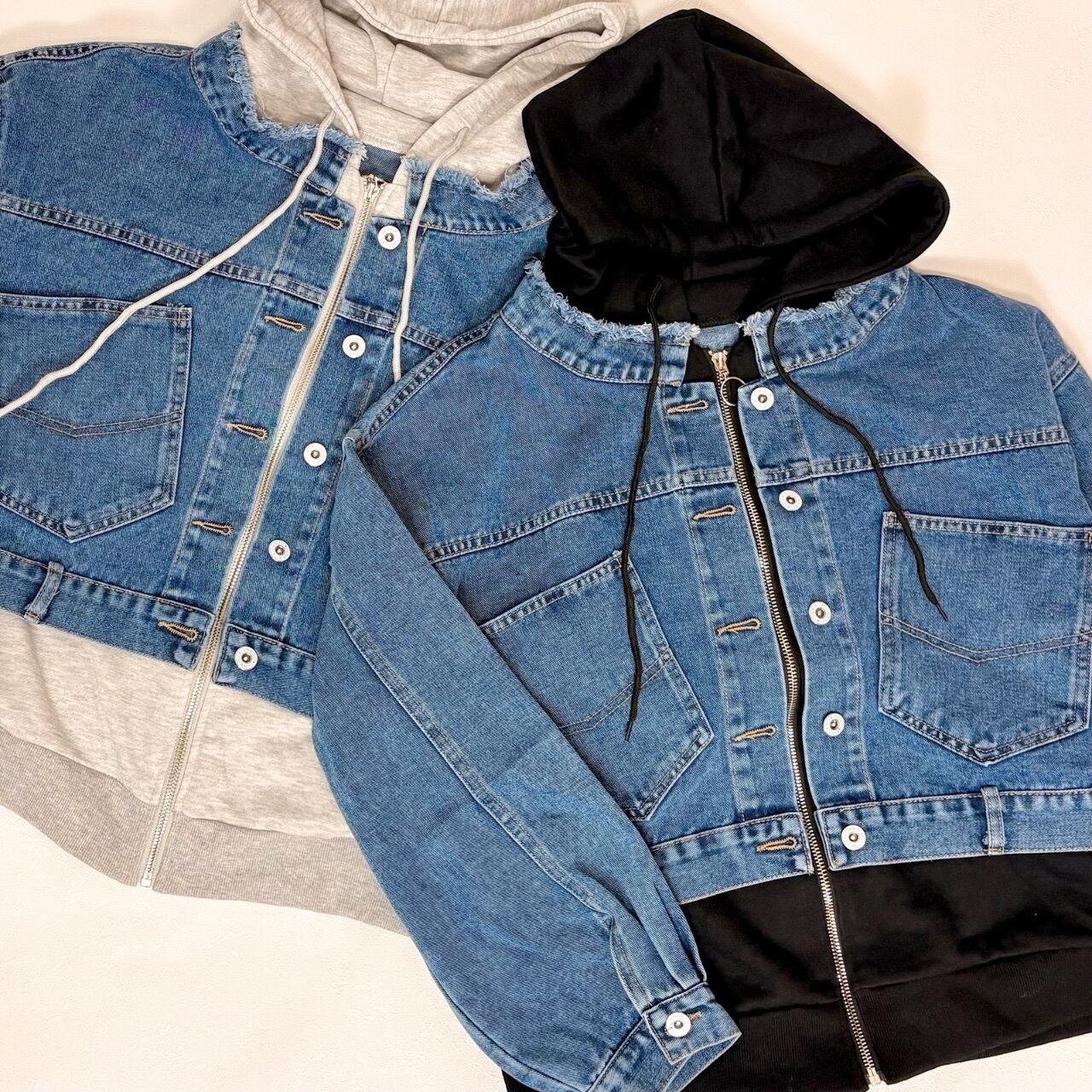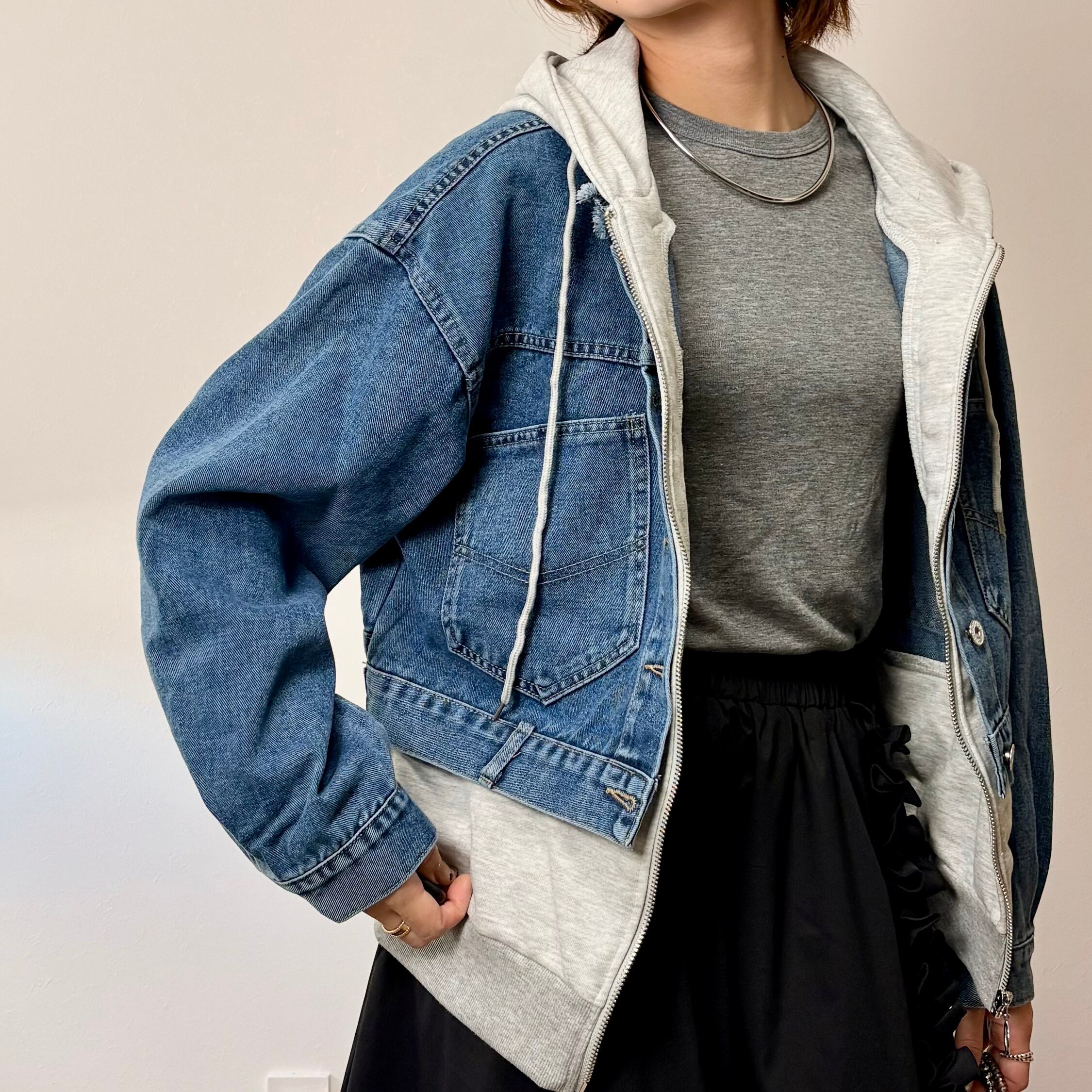 スウェット×デニムドッキングジャケット/piacere ピアッチェーレ アウター ジャケット ブルゾン デニムジャケット ジージャン Gジャン スウェット パーカー トレーナー フード 異素材 一枚映え グレー ライトグレー ダークグレー ブラック 黒 フリーサイズ M L p46033