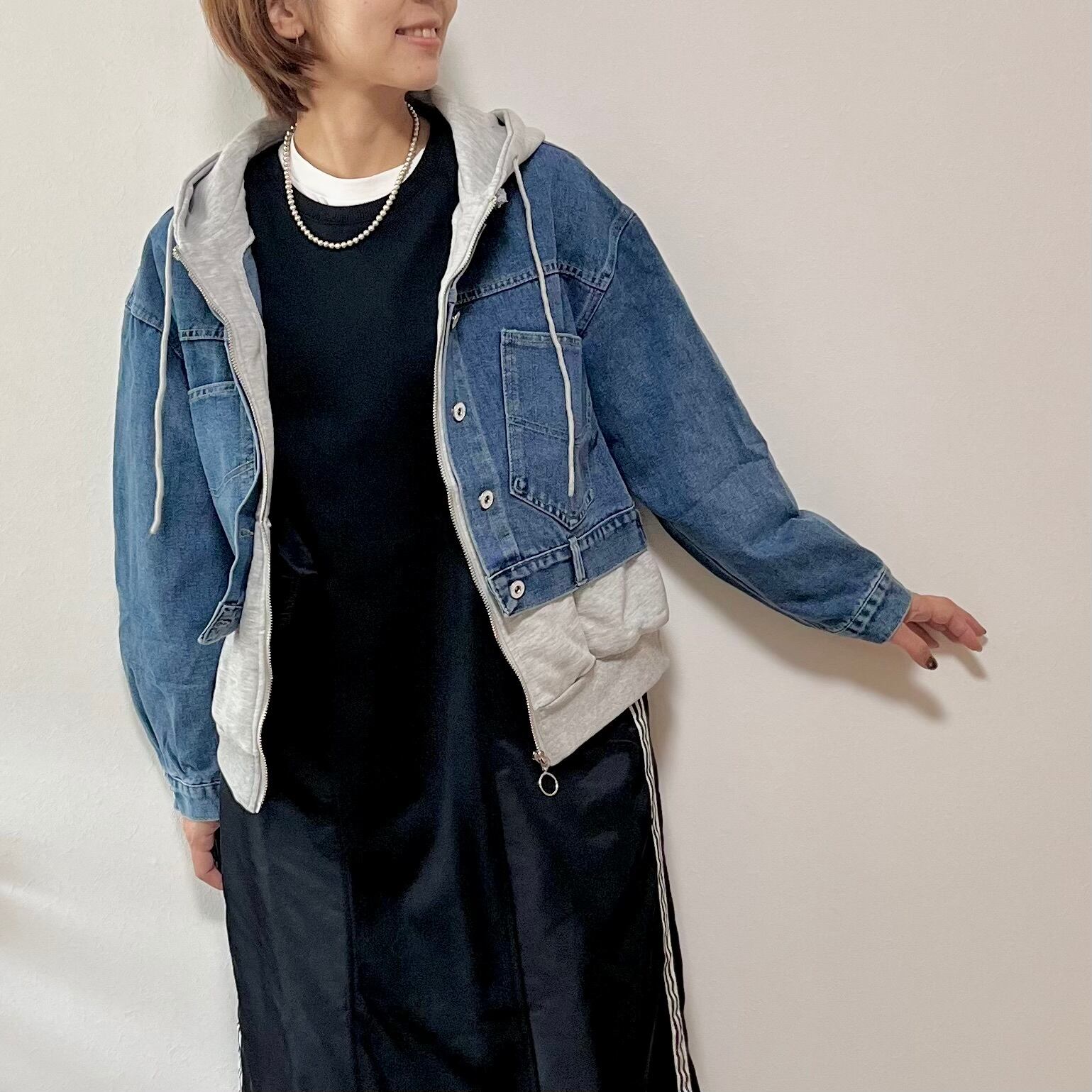 ◇異素材の組み合わせによって、一枚でしっかり映えるアイテム。デニムのカジュアルさとスウェットの柔らかさが、それぞれの魅力を引き立てます。