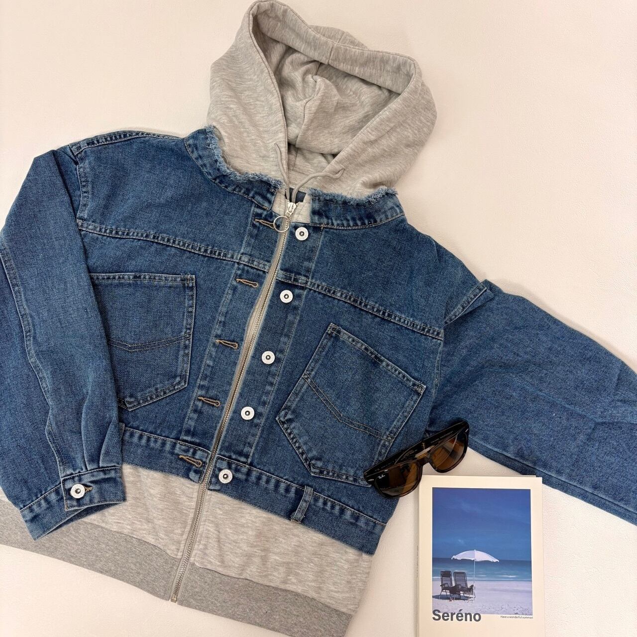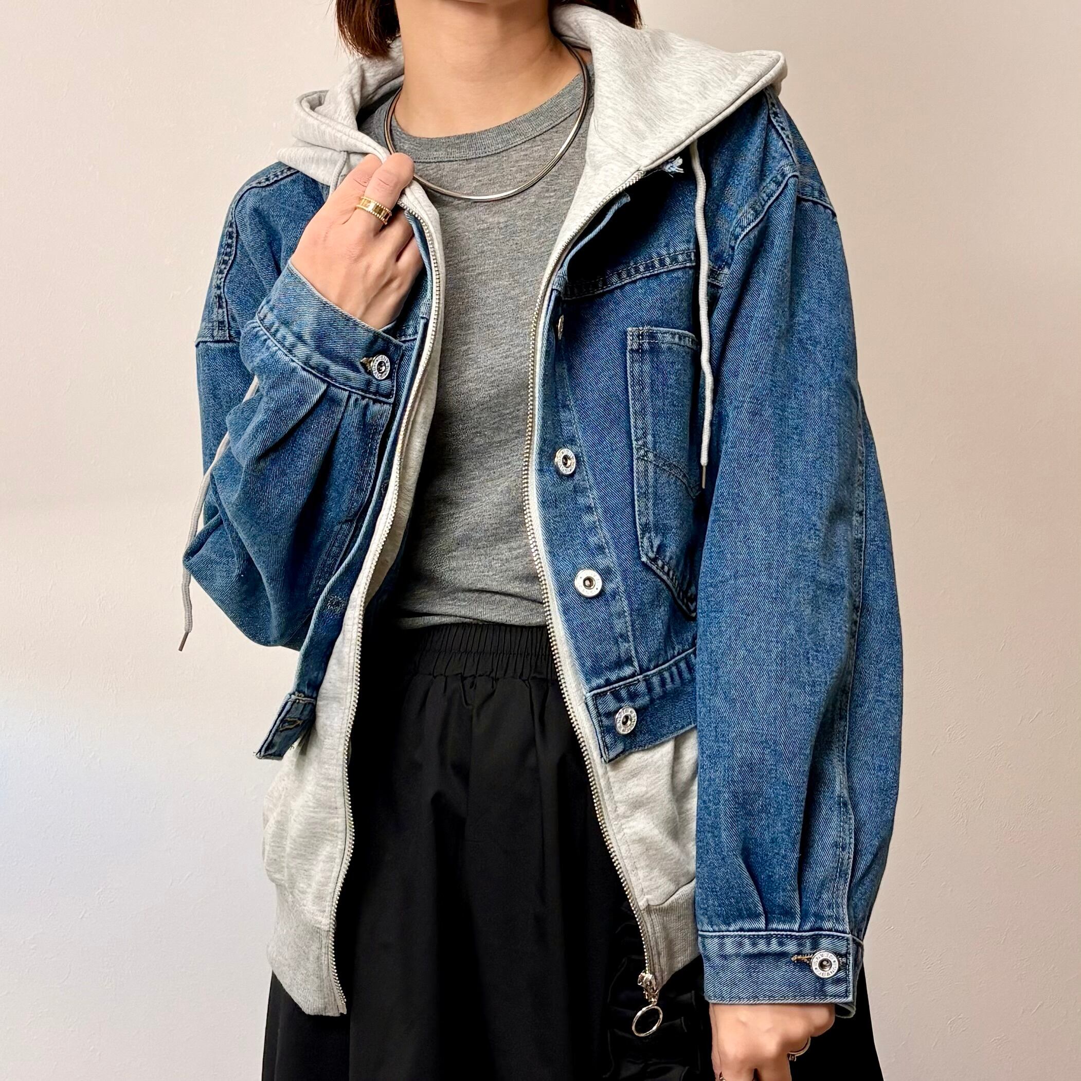◇スウェットとデニムの異素材ドッキングジャケット。カジュアルさと個性が見事に融合したデザインで、一枚持っていればスタイリングの主役になるアイテムです。