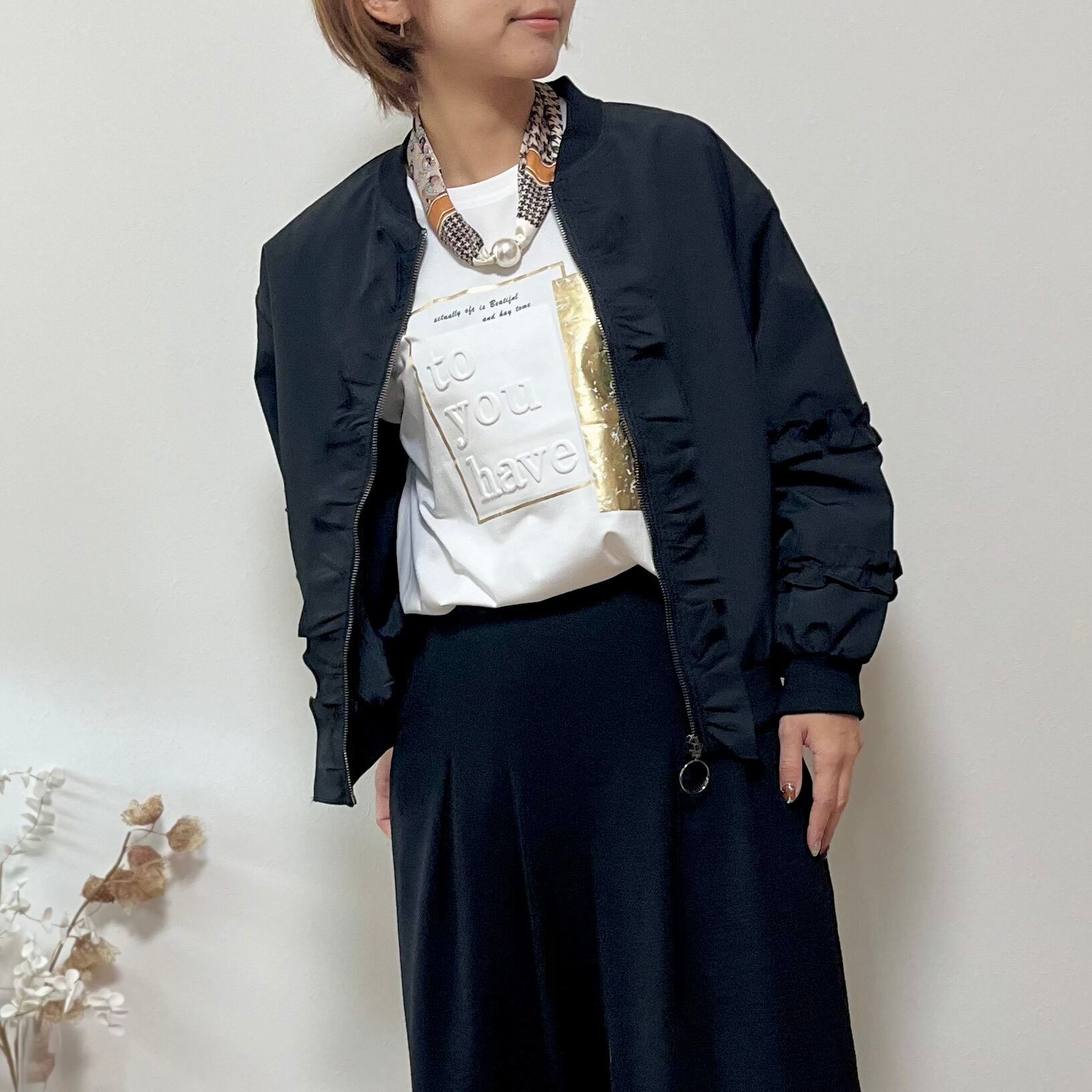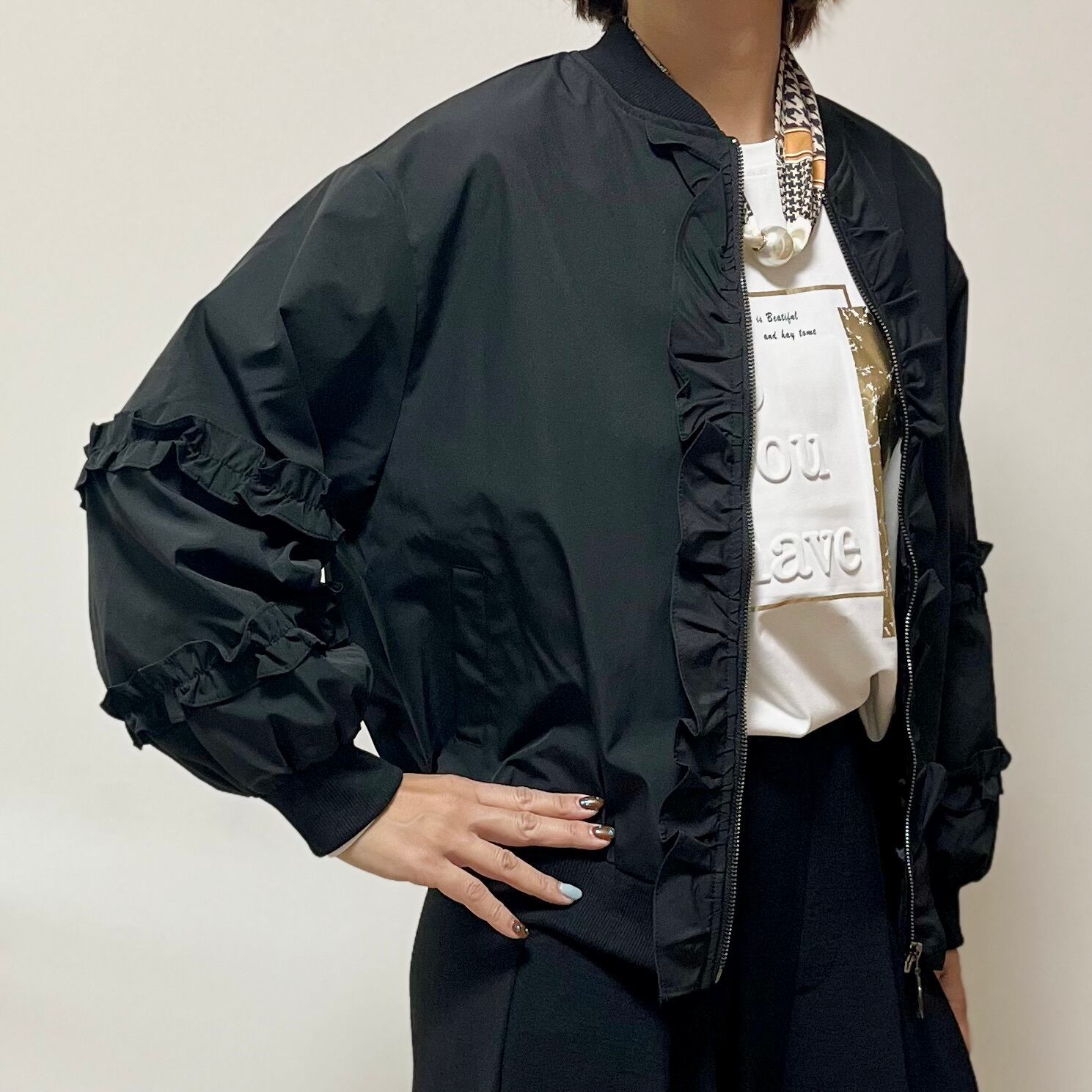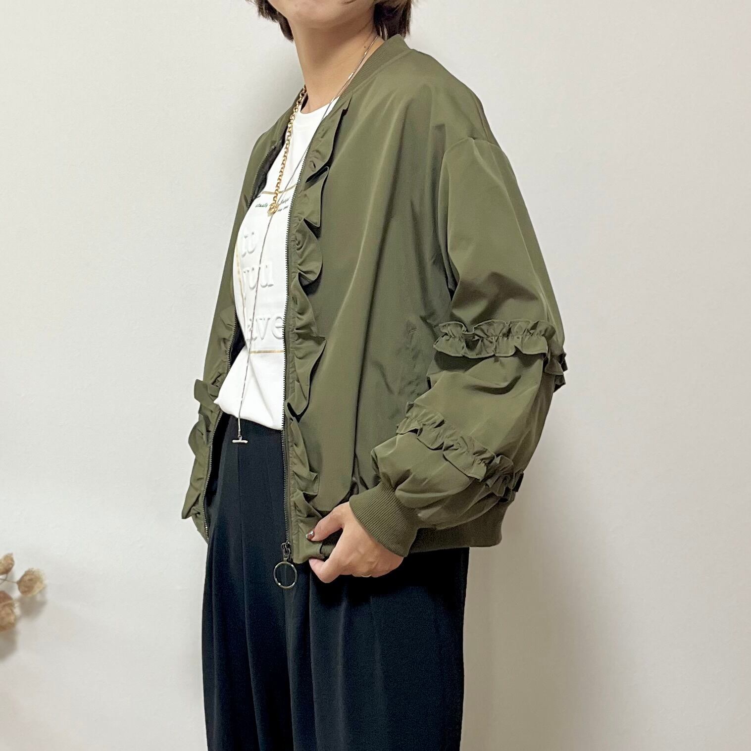 ◇MA-1のカジュアルシルエットと、大胆フリルの可愛さが絶妙にマッチしたアイテム。他にないデザインでおしゃれにコーディネートをまとめてくれます。