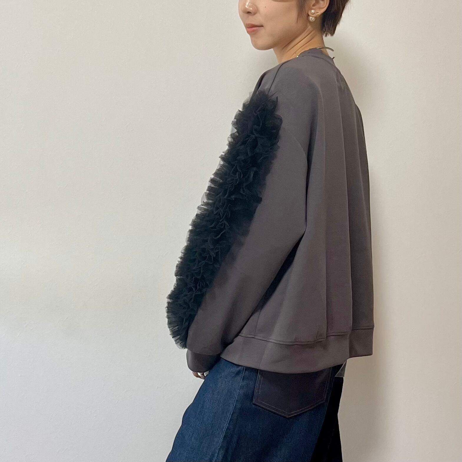 ◇袖チュールトレーナーは、トレンド感満載のデザイン袖が特徴のトップスです!スウェット生地にボリューム感のあるチュールフリルをプラスすることで、遊び心溢れる可愛らしさを演出しています。