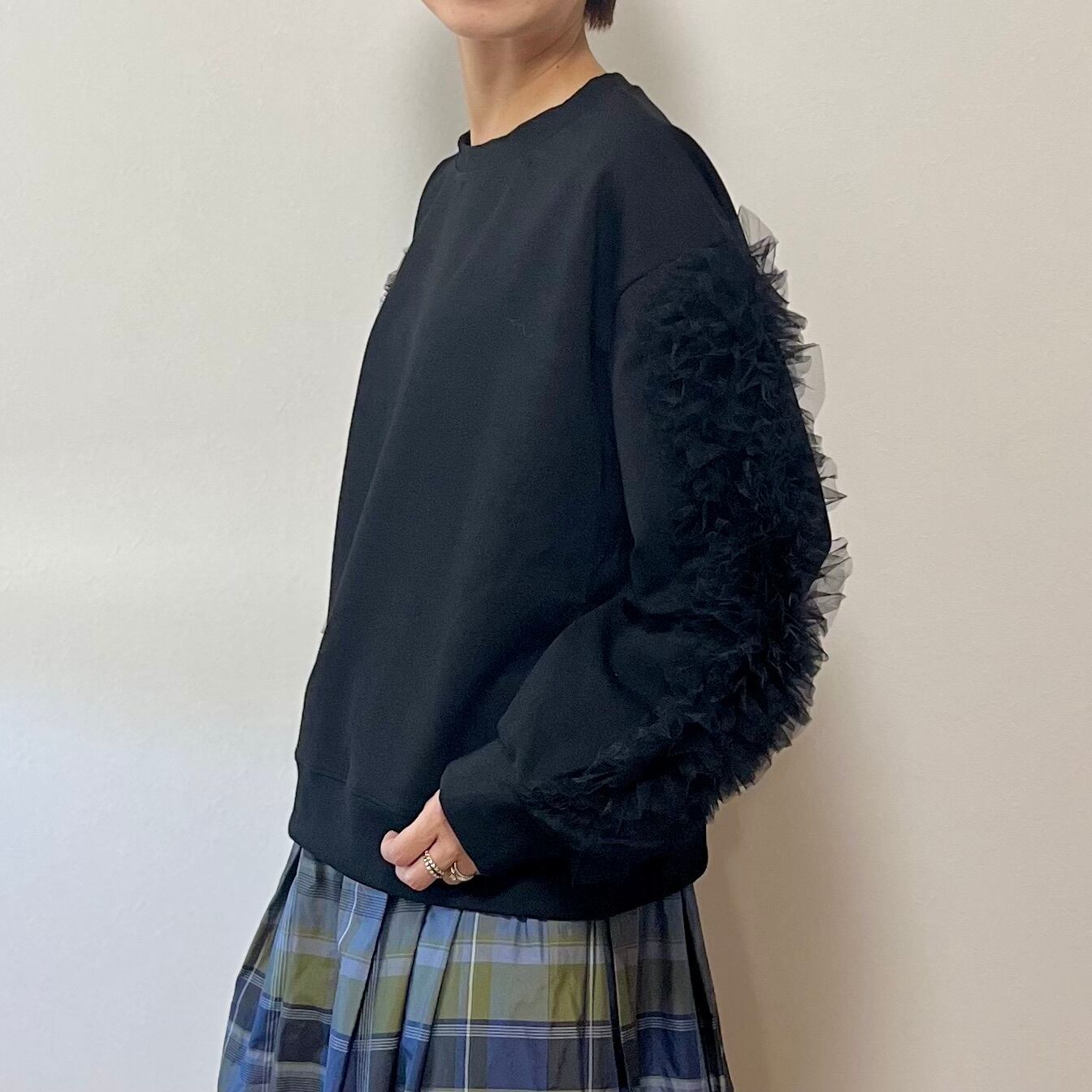 チュールフリル袖トレーナー / piacere ピアッチェーレ トップス トレーナー スウェット 長袖 ハリ感 ボンディング オーバーショルダー ドロップショルダー デザイン袖 ボリューム袖 チュール フリル ゆったり リラックス 大きめ 着痩せ オーバーサイズ フリーサイズ M L P15535 | poppet online◇instagramで商品紹介中♪