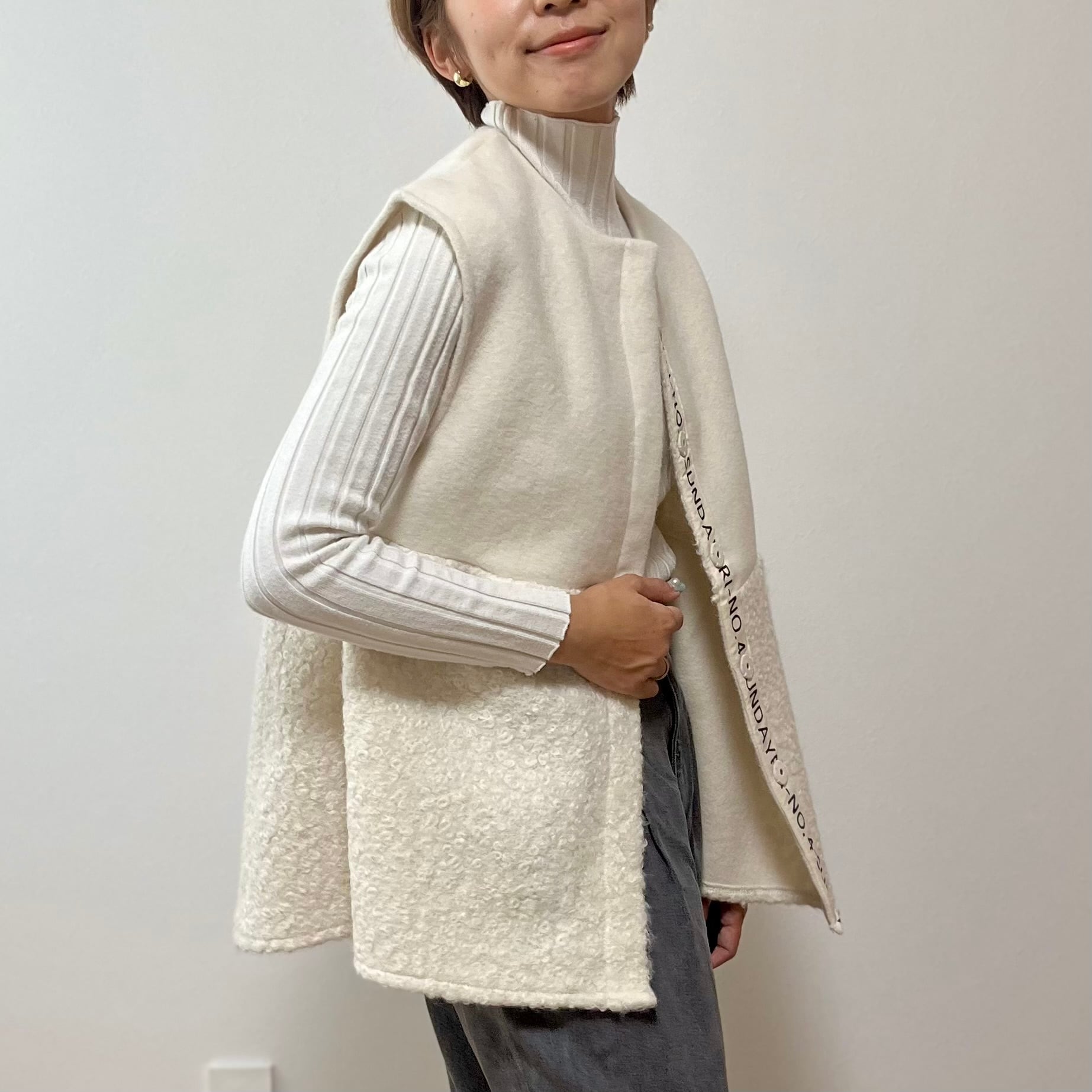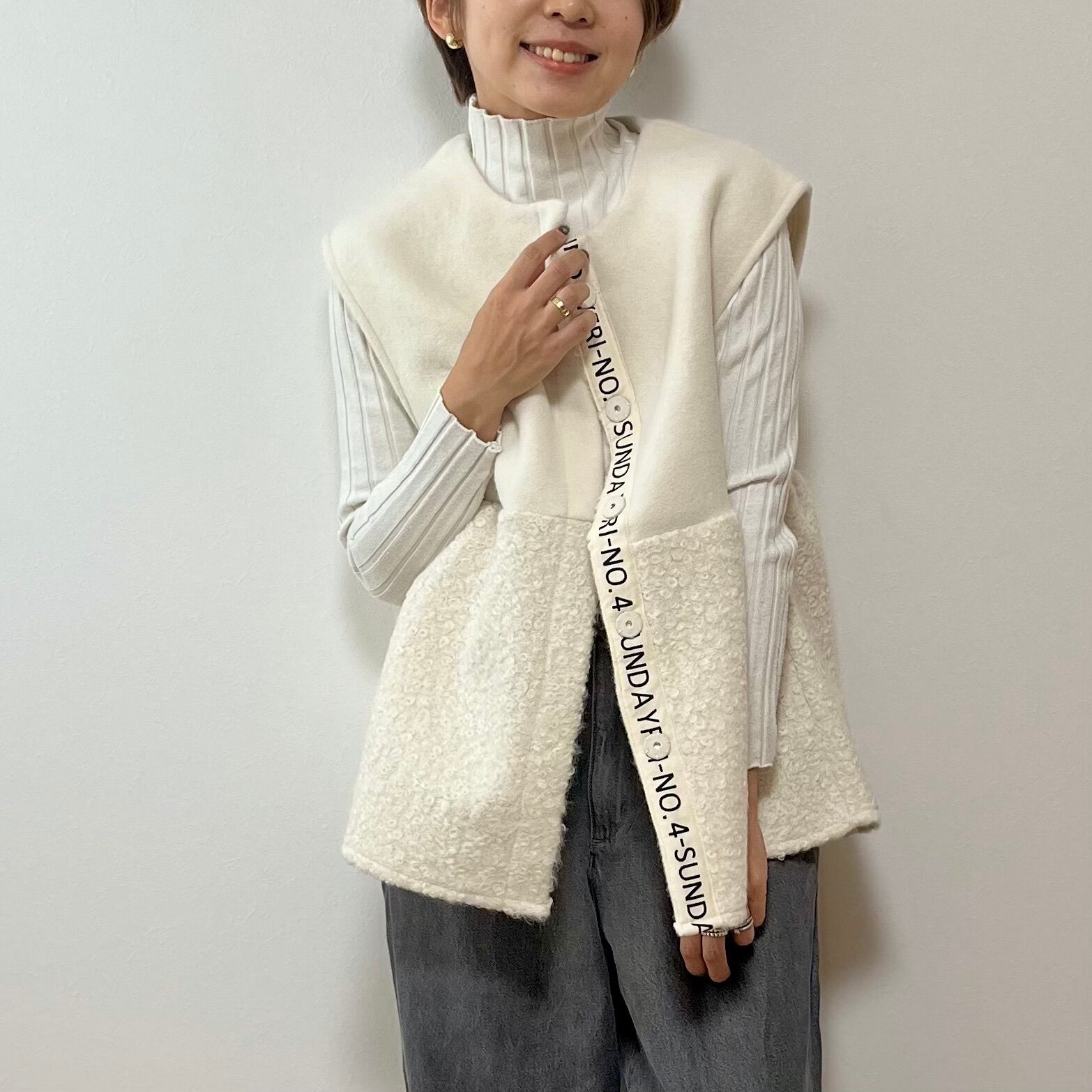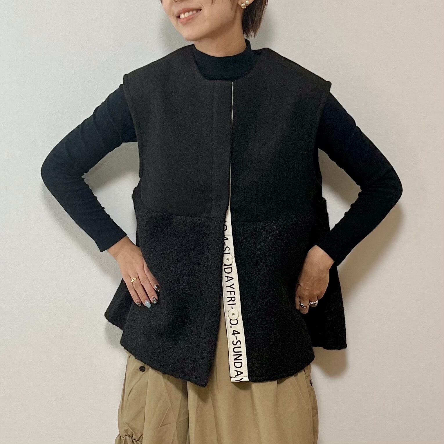 ◇ウール生地に、切替部分から下がボアファーをドッキングしたベスト。