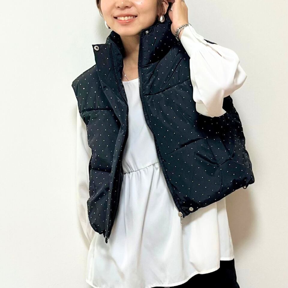 ◇ラインストーンが散りばめられた、キラキラ輝くダウンベスト。華やかさをプラスするビジューがおしゃれで可愛い。