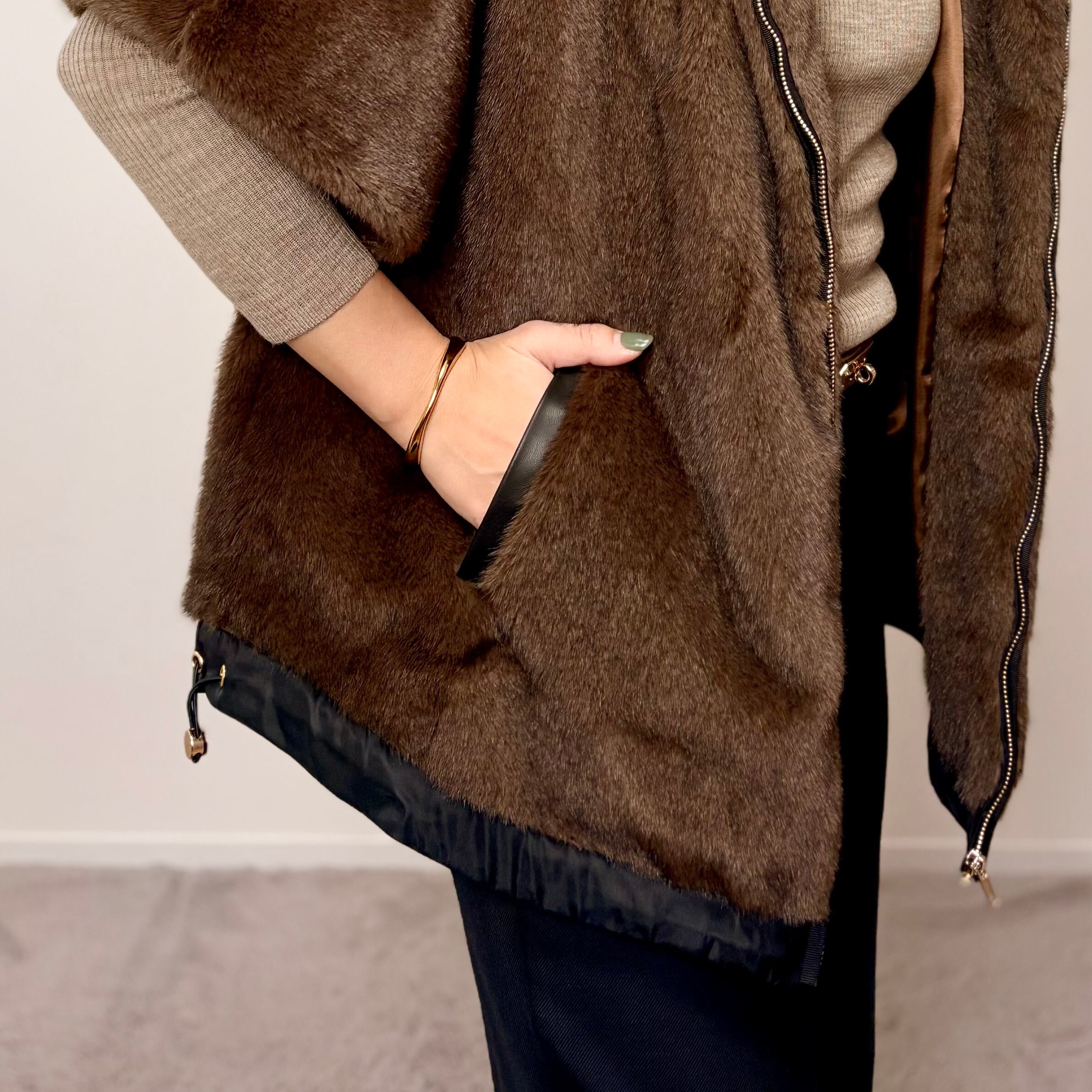 ミンクエコファーフーディーベスト / piacere ピアッチェーレ アウター ジャケット トップス ベスト ジレ ファーベスト ミンクファー エコファー フェイクファー ロング フーディー フード 前開き ドロスト ドローストリング ポケット エコレザー ジップ P75511