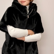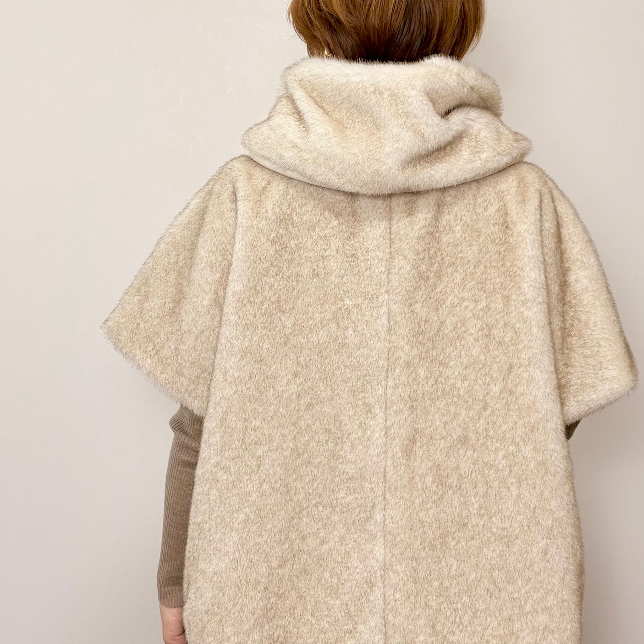 ◇大きめの襟から繋がったフードがボリューム感を演出。後ろ側のフード自体は小さめで、ボリューミーな襟のようなデザインになっています。このフードの裏側にはエコレザーを使用し、綺麗な形を保つことで立体感あるおしゃれなデザインに。