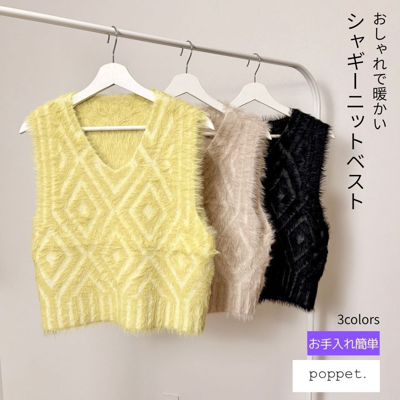 シャギーニットベスト / トップス ベスト ジレ ニットベスト ニット シャギーニット ふわふわニット ダイヤ柄 ひし形柄 ストライプ柄 ベージュ アイボリー ブラック 黒 イエローグリーン 緑 黄緑 3カラー ミックスニット カラフルニット デザインニット カラーニット 45989 | poppet online◇instagramで商品紹介中♪