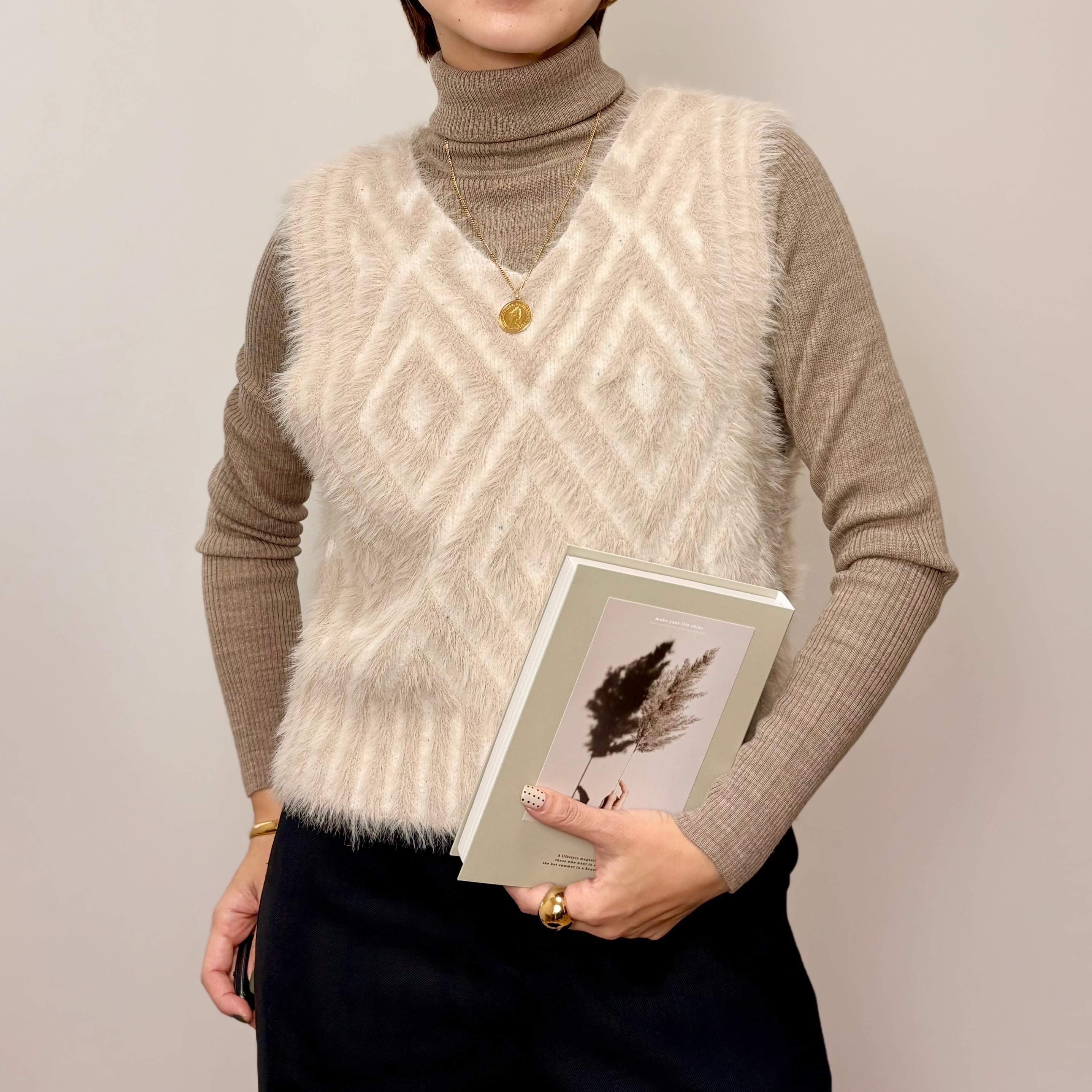 ◇ふわふわとした肌触りが心地よい、今年のトレンド、シャギーニットベスト。ユニークなひし形柄とストライプ柄の組み合わせデザインで、コーディネートに華やかさをプラスします!