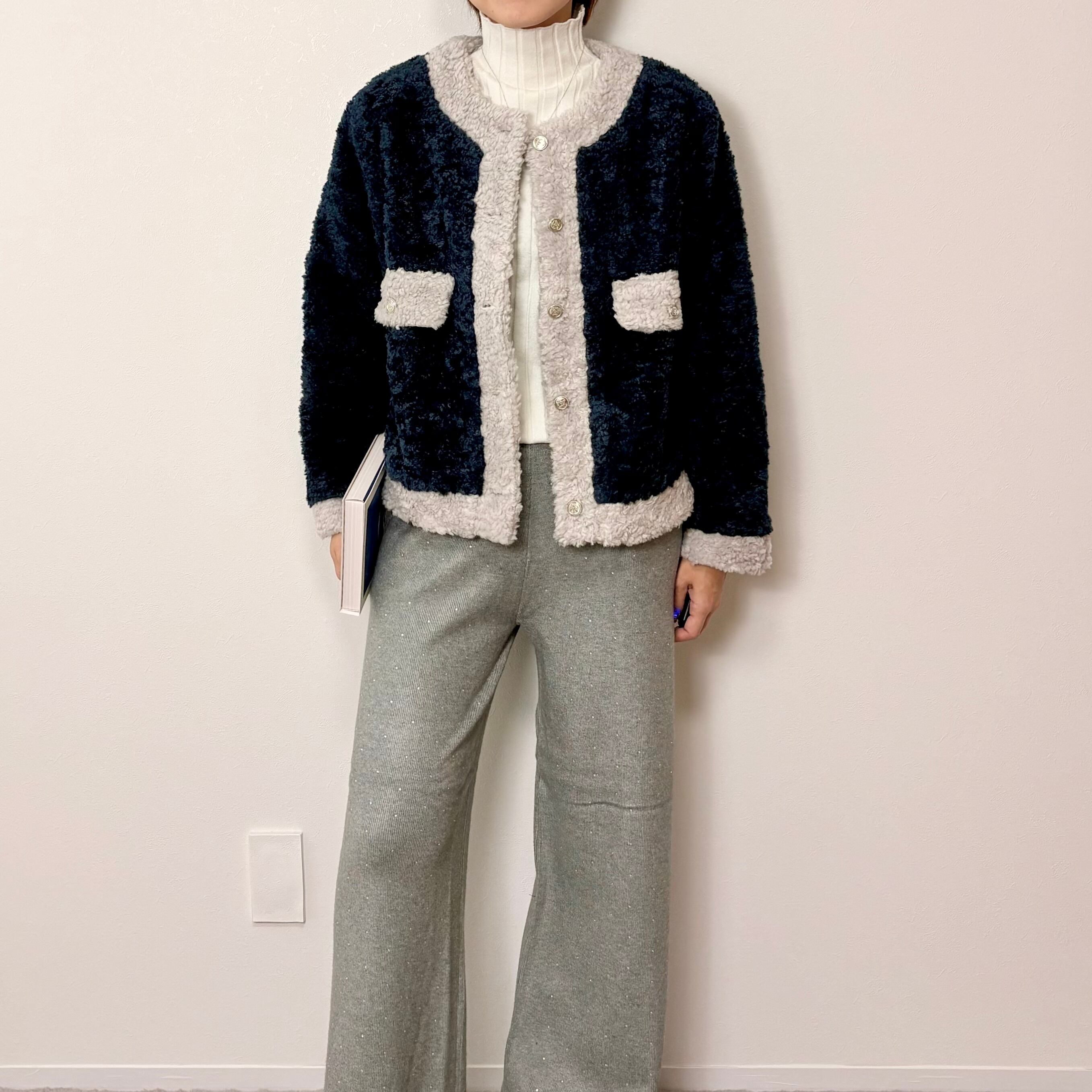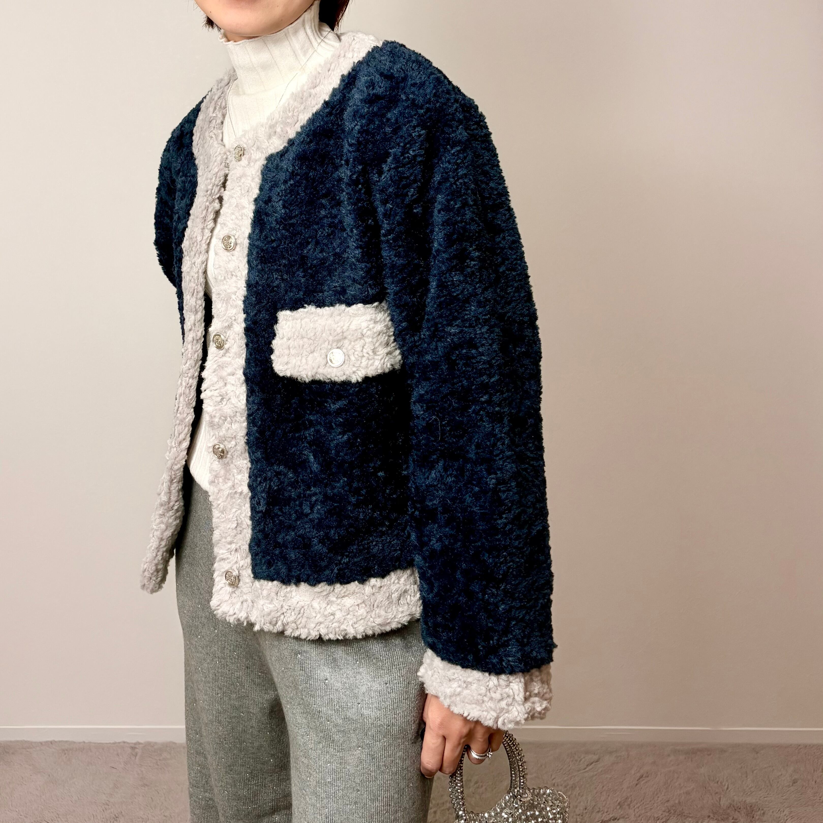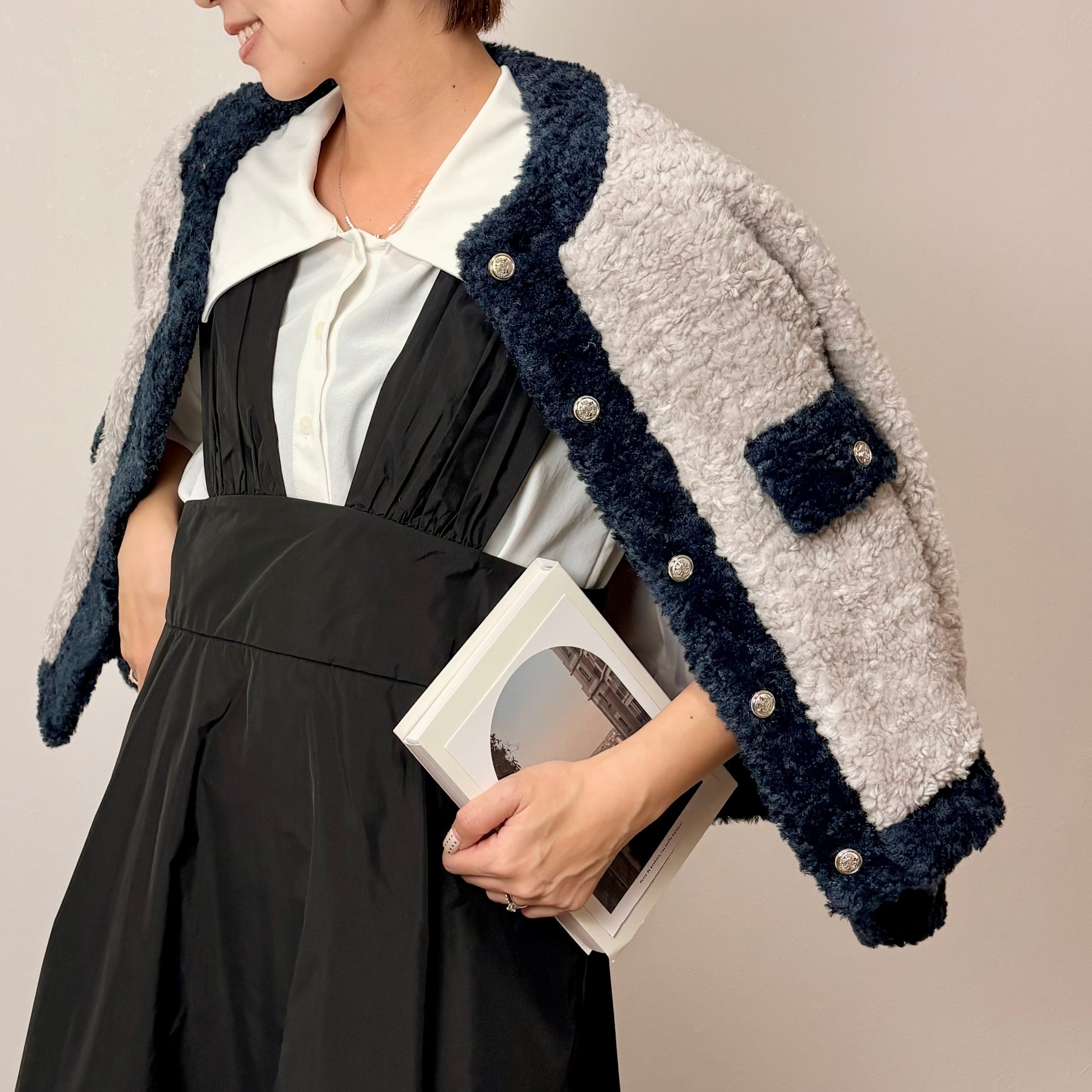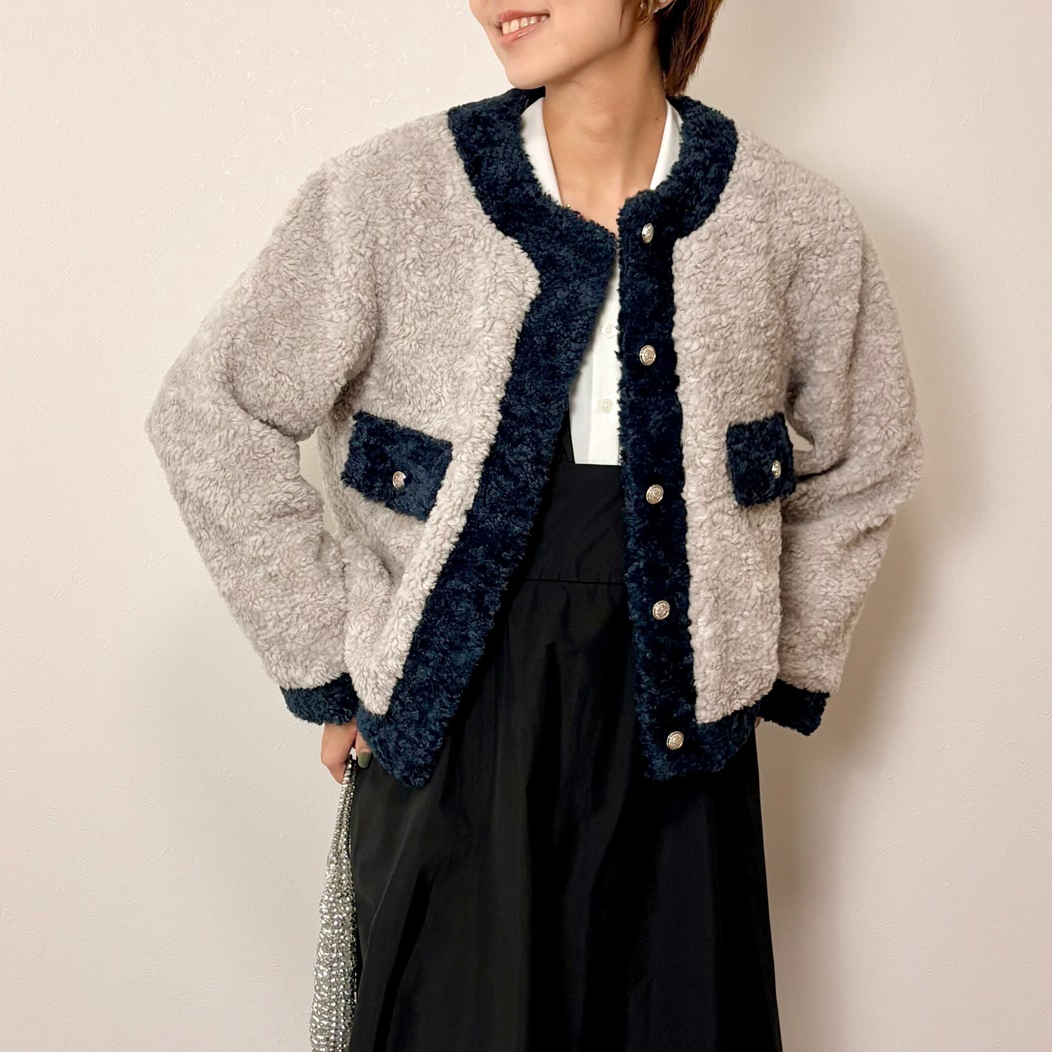 ◇クラシックなデザインが目を惹くボアコーディガン。グレーとネイビーのバイカラーがおしゃれでかわいい組み合わせです。