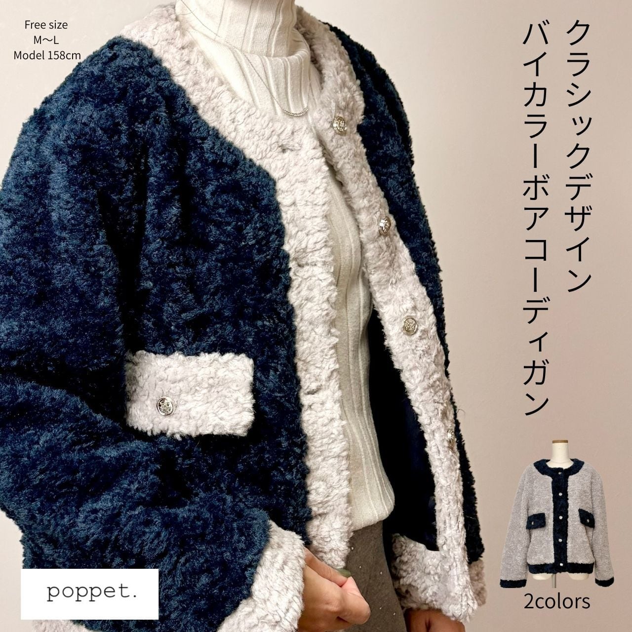 クラシックバイカラーボアコーディガン /piacere ピアッチェーレ アウター ジャケット ブルゾンコート トップス カーディガン ボア エコファー シープボア プードルボア モコモコ ふわふわ 金具ボタン ポケットデザイン バイカラー コーディガン 暖かい 長袖 P45583 | poppet online◇instagramで商品紹介中♪