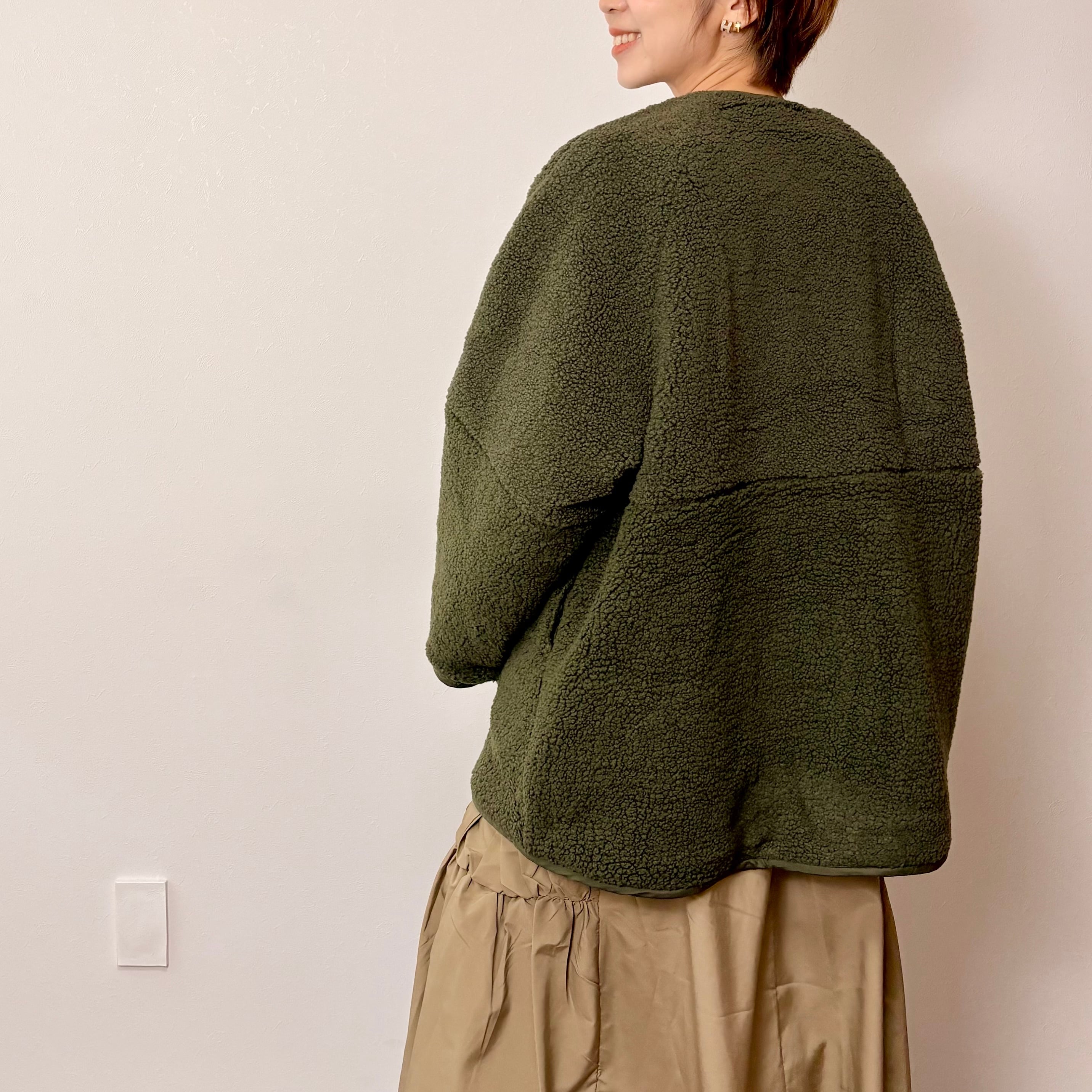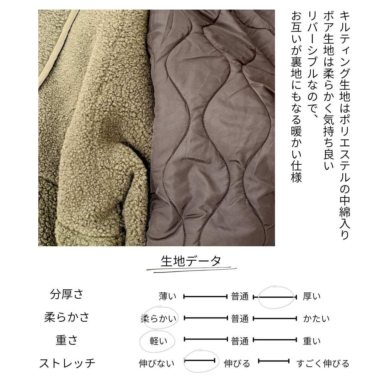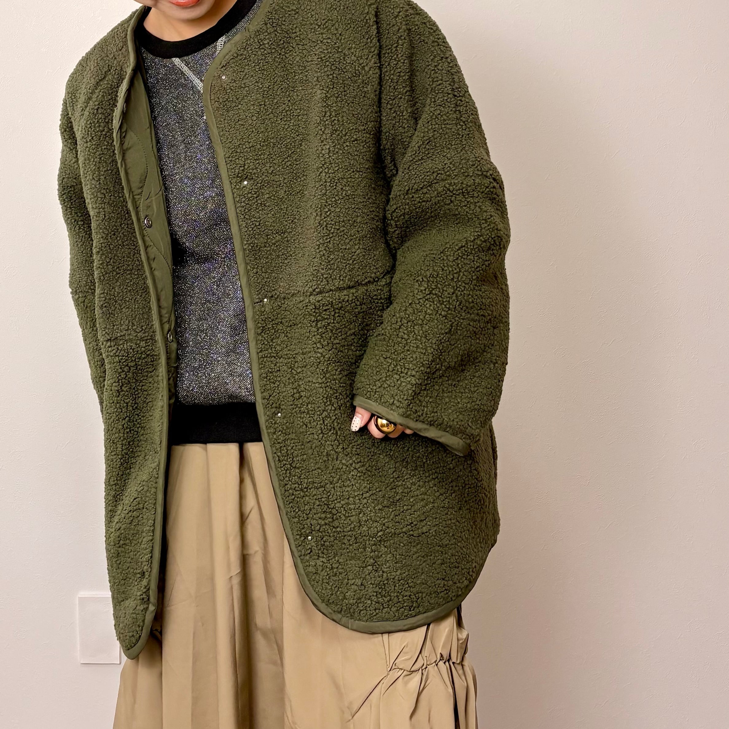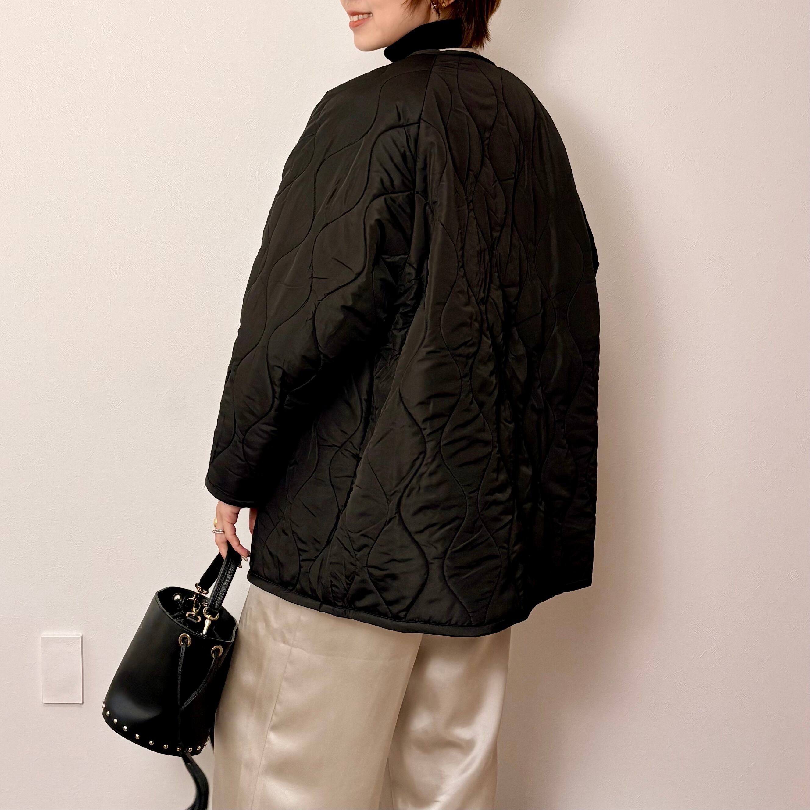 ◇キルティング中綿生地と、ボア生地のリバーシブルで楽しめる2wayのアウター。表裏どちらの素材感も魅力的で、ノーカラーのデザインが、シンプルでありながら洗練された印象を与えます。