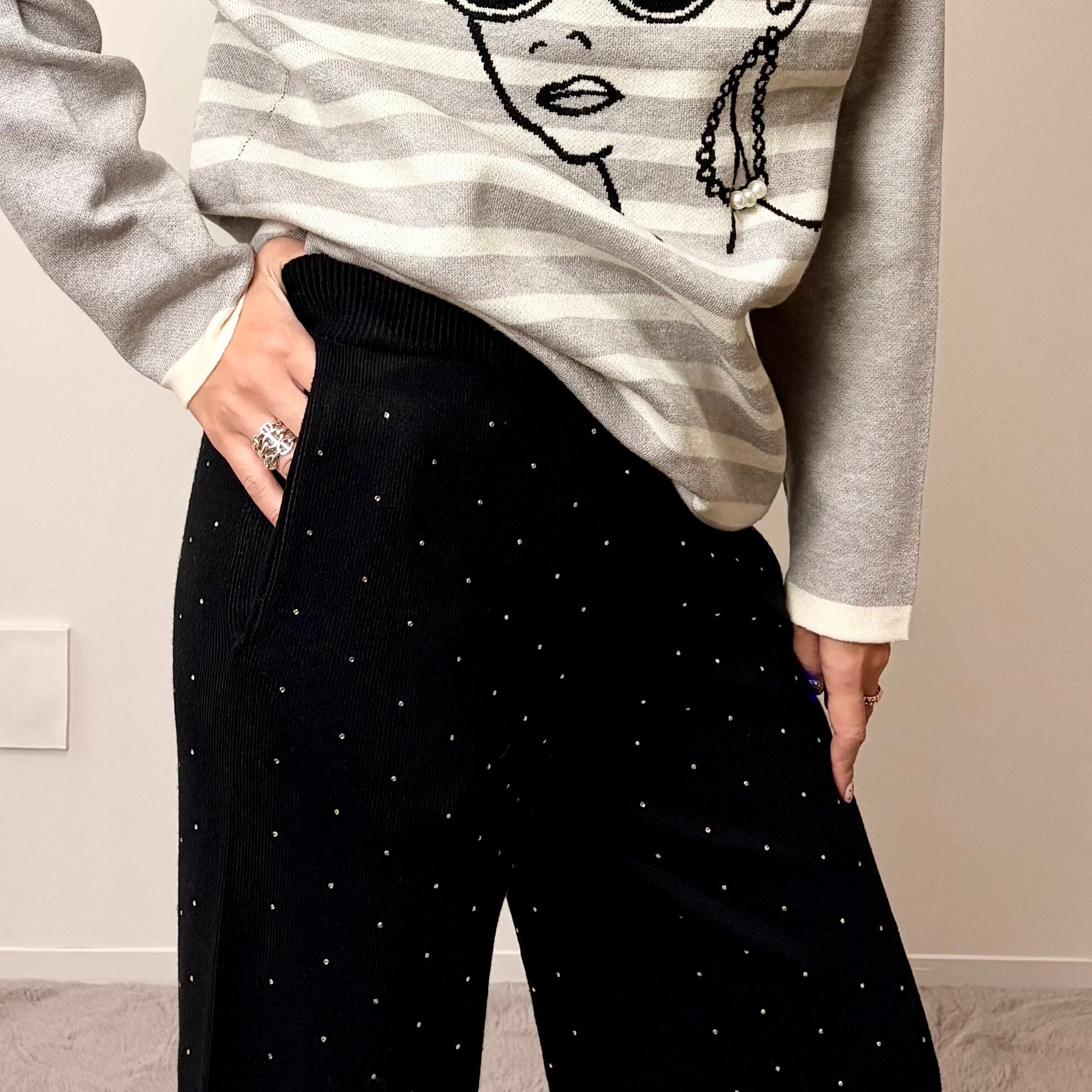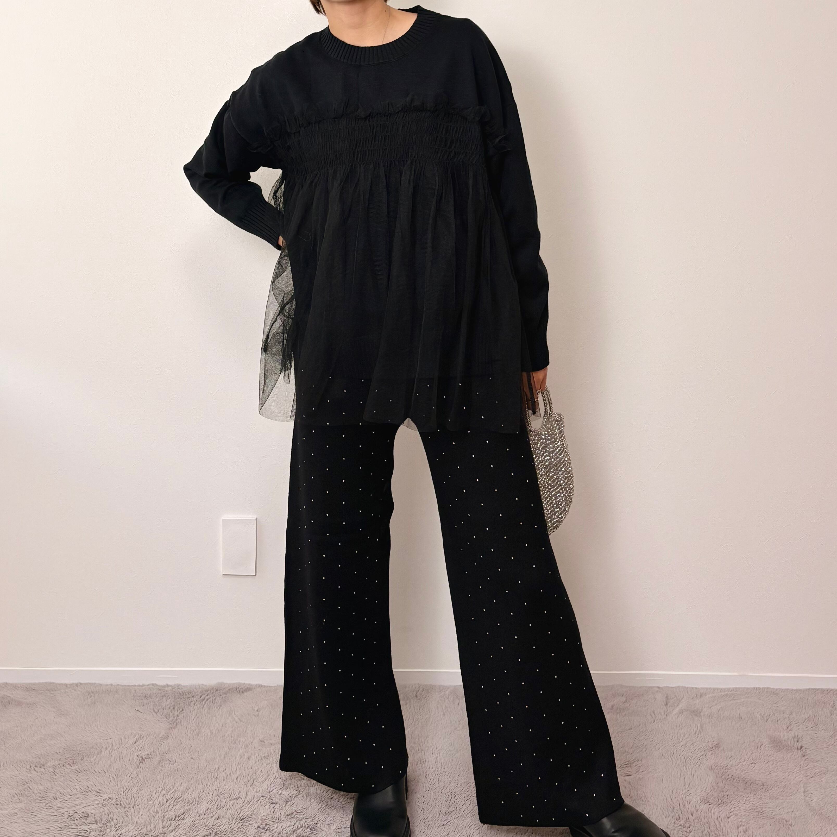 ◇ラインストーンをあしらった華やかなデザインのニットパンツです。ウエストにゴムを使用し、さらに紐で調整も可能。ゆったりリラックスした履き心地でありながらも、おしゃれなワイドパンツ。