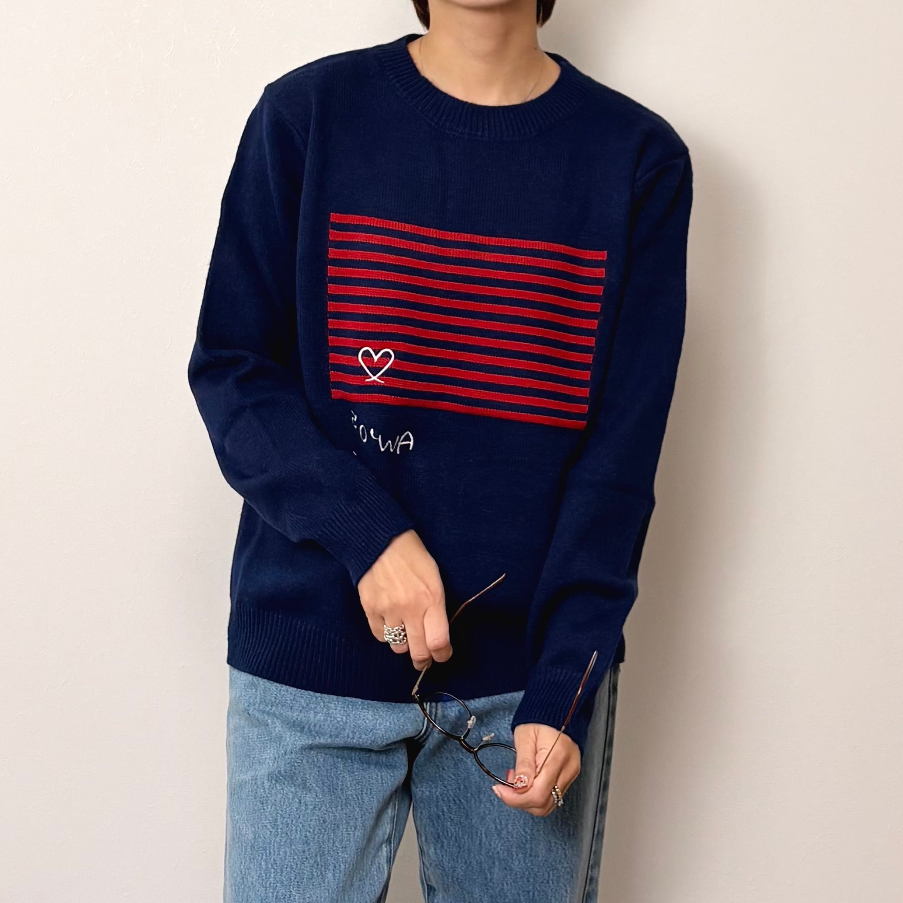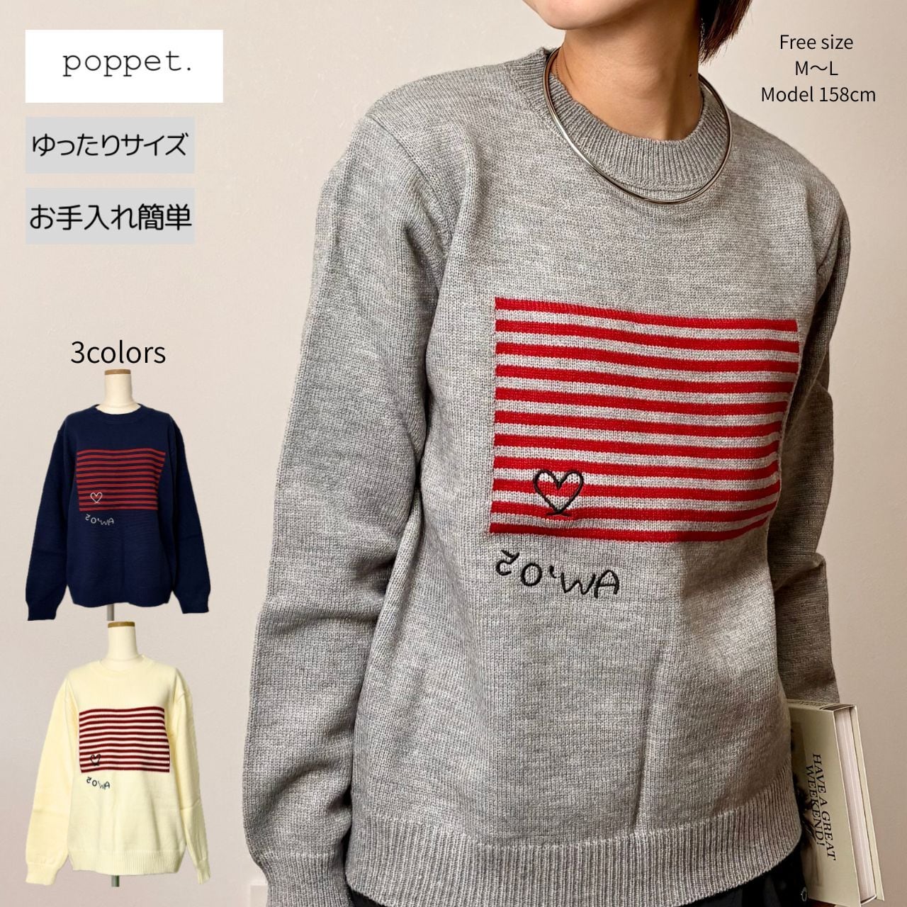 ハートロゴデザインニット / トップス ニット 長袖 赤 レッド ストライプ ハート 刺繍 ロゴ 柄ニット ラウンドネック 丸首 リブ ゆったり 着痩せ 暖かい 伸びる 柔らかい 3カラー ネイビー 紺 ホワイト 白 グレー フリーサイズ M L piacere ピアッチェーレ P35522 | poppet online◇instagramで商品紹介中♪