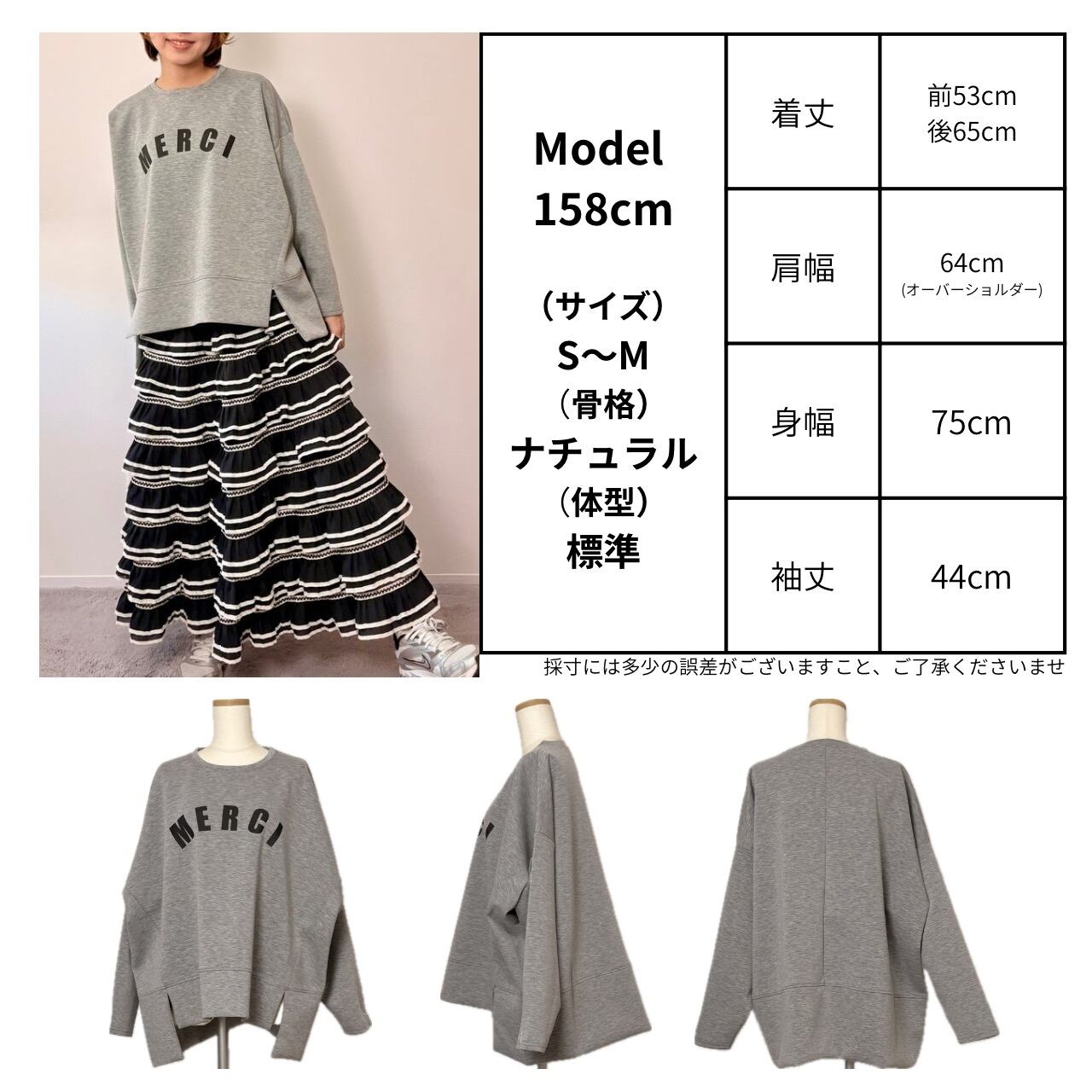 着丈 前53cm後65cm / 肩幅 64cm(オーバーショルダー) / 身幅75cm / 袖丈44cm