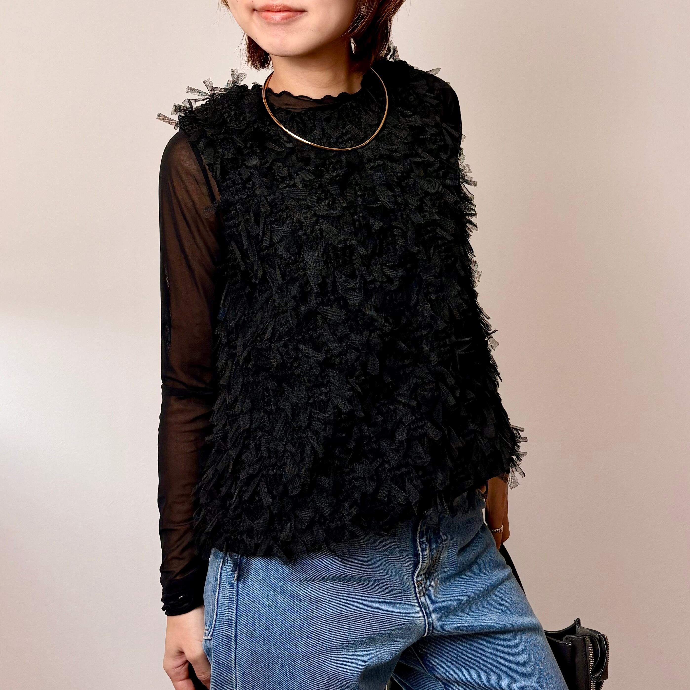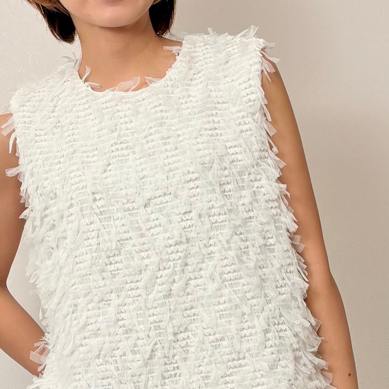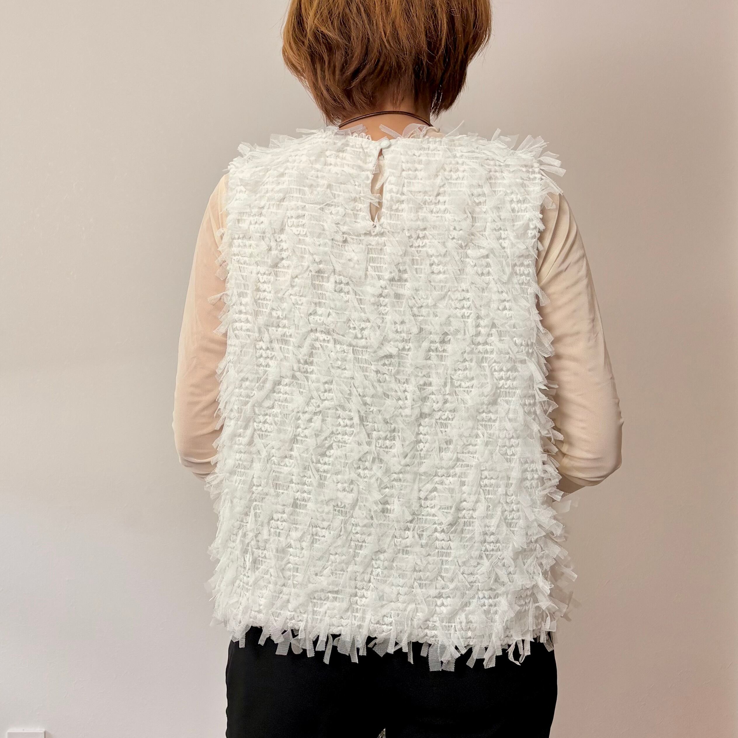 リボンフリンジジャガードトップスベスト / トップス ベスト ノースリーブ 春トップス 春ベスト 華やか きれいめ 立体感 凸凹生地 大人フェミニン 大人 レース 裏地 フリーサイズ 16806