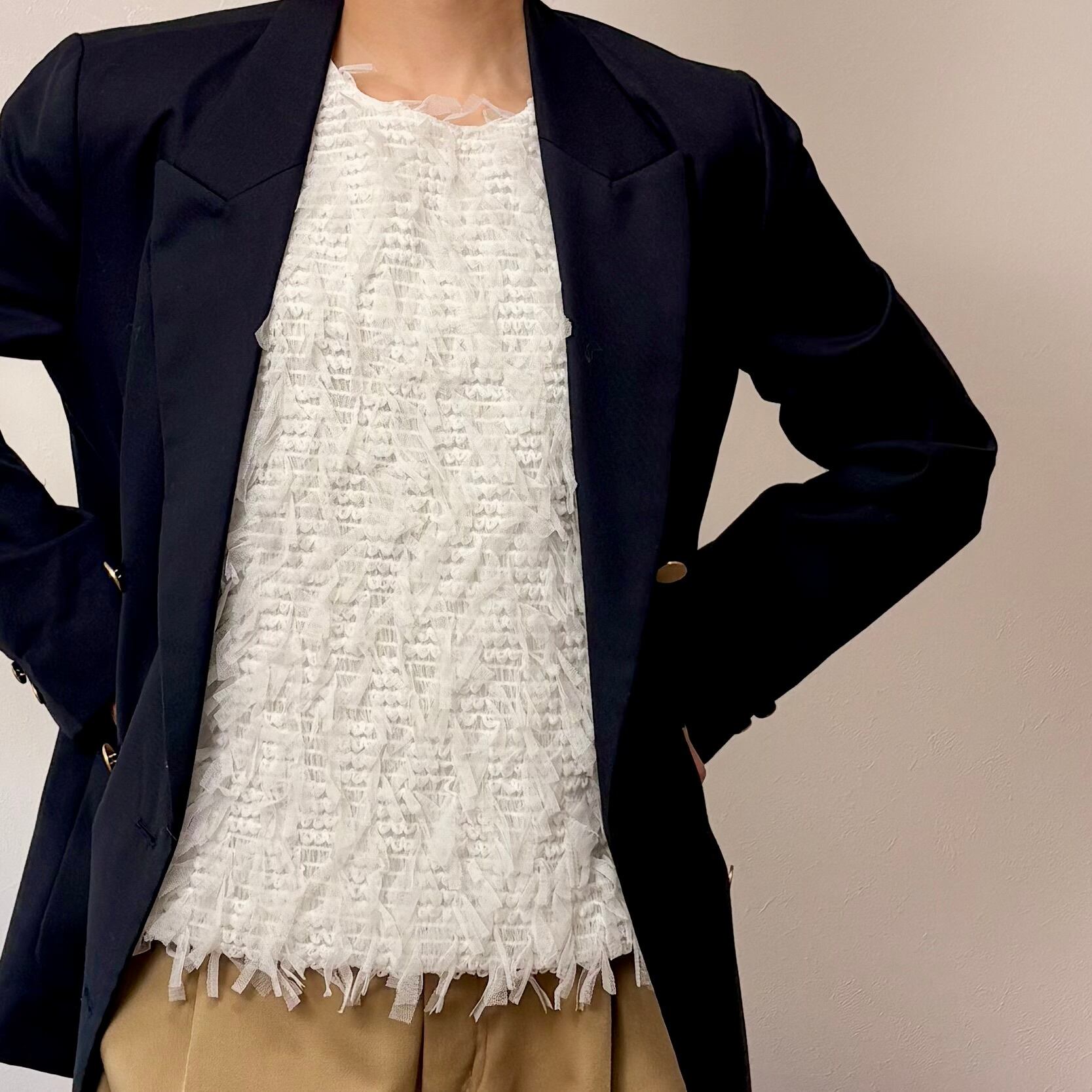 表情のあるフリンジジャガード生地を使用した、存在感たっぷりのトップス。