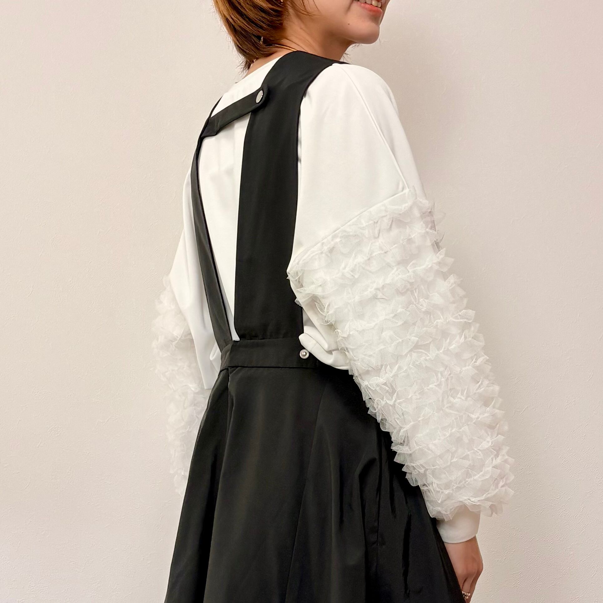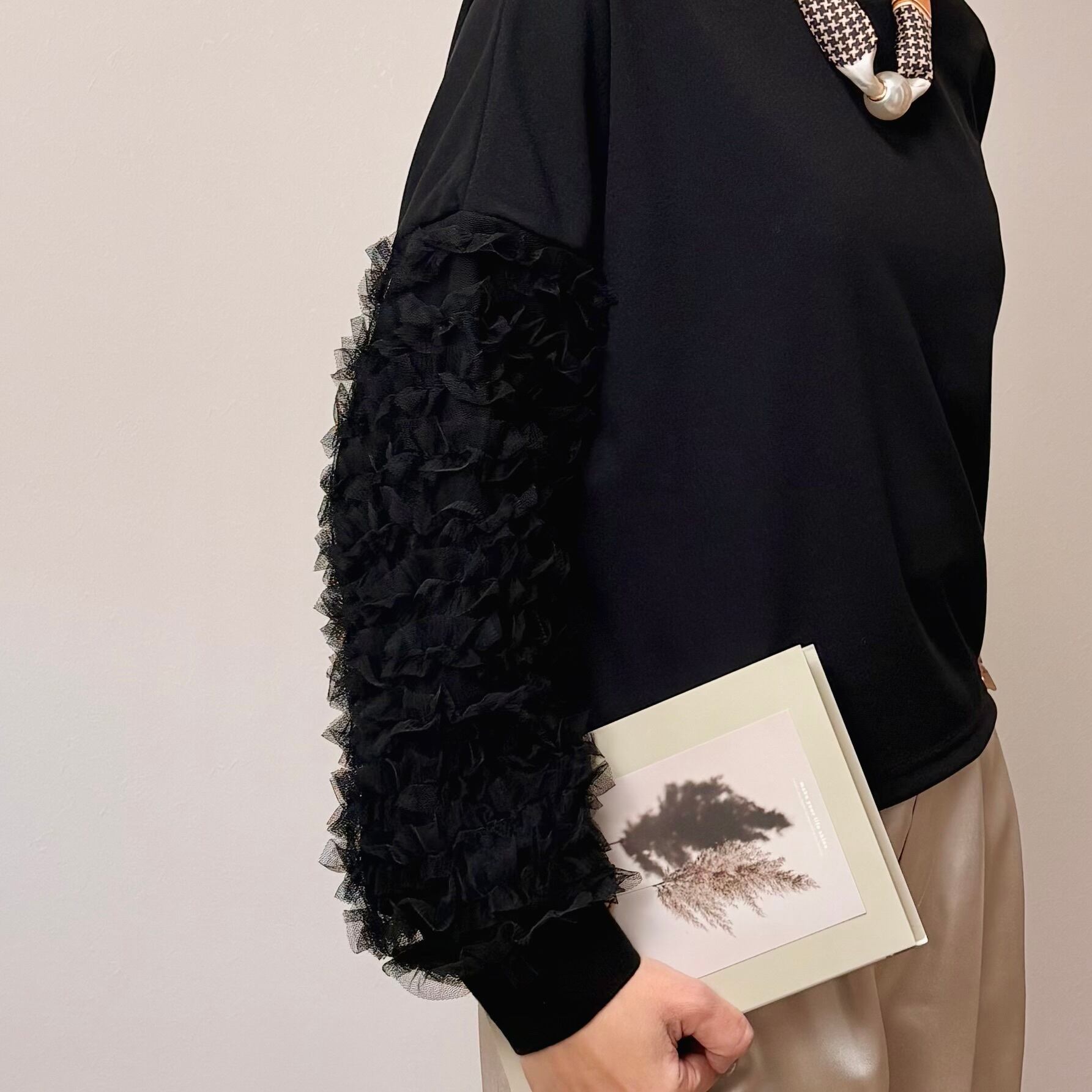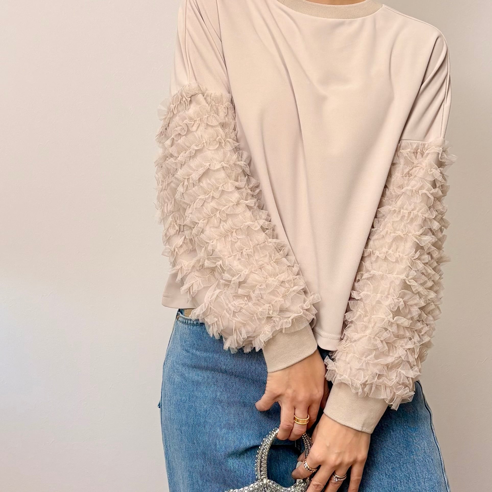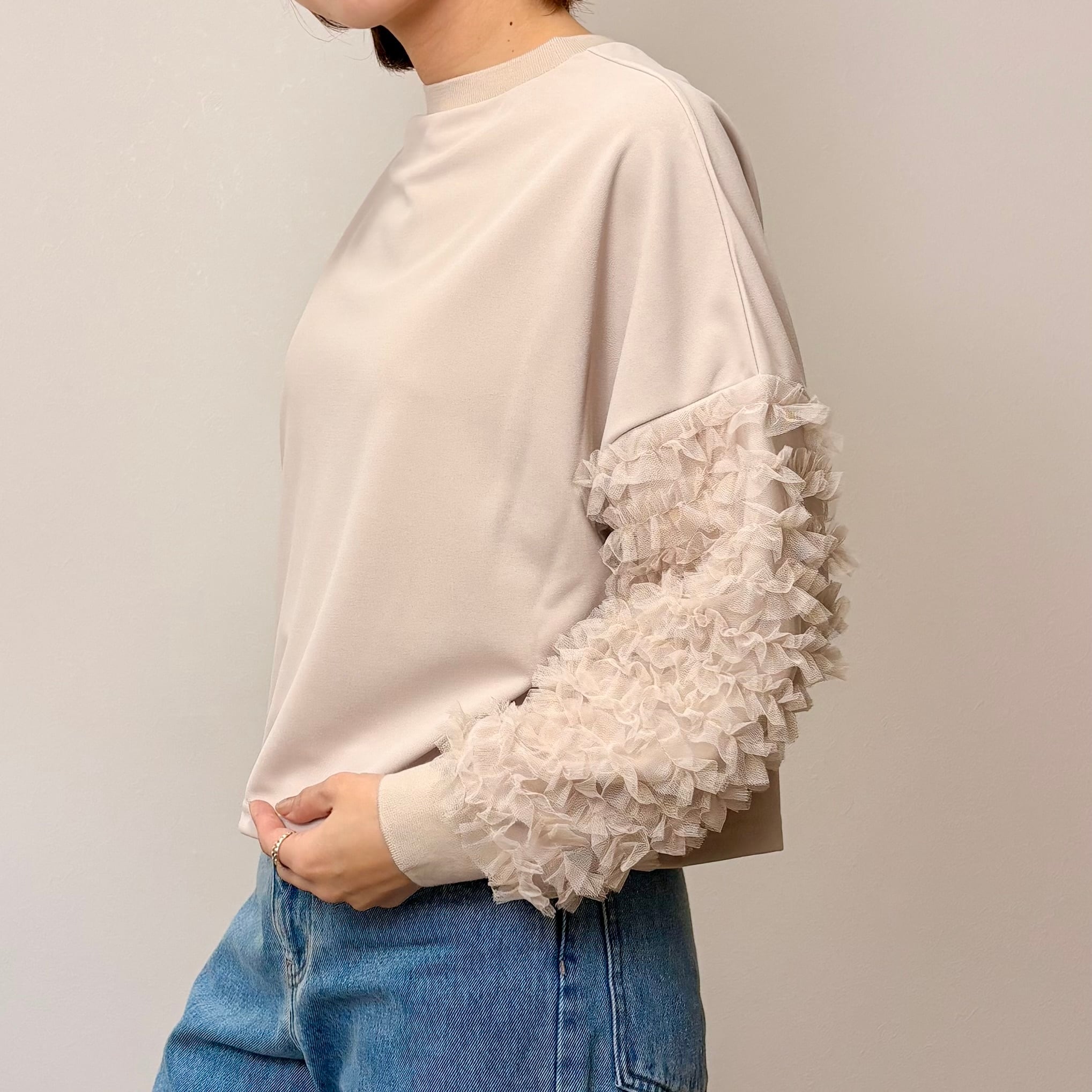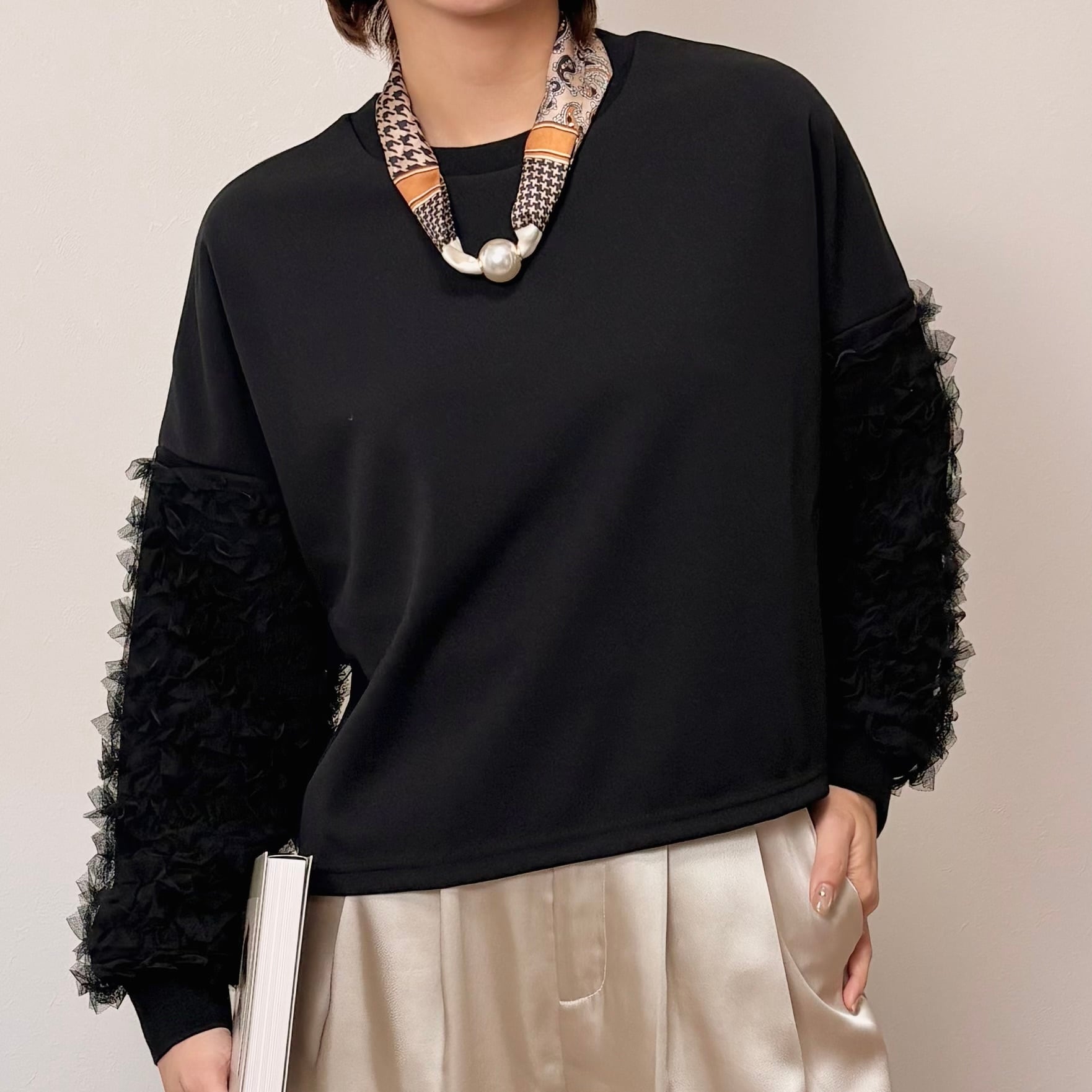 袖にチュールフリルを重ねた、立体感のあるデザインプルオーバー。