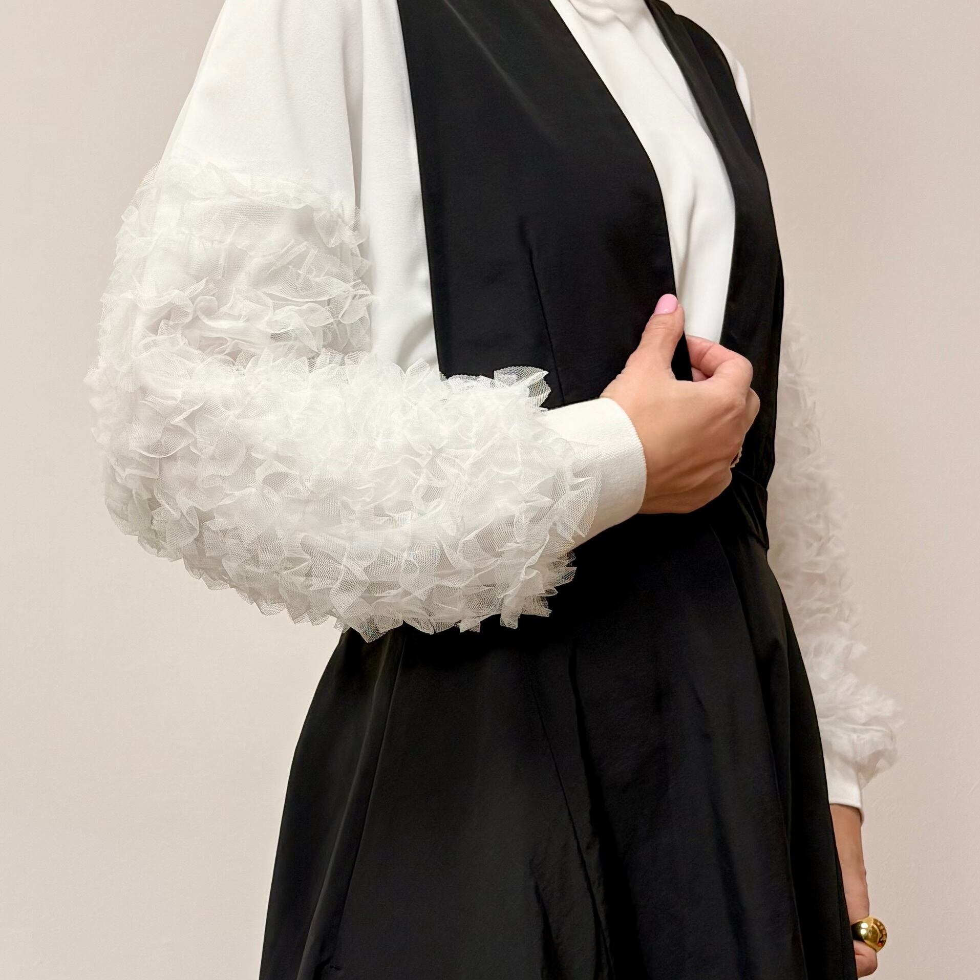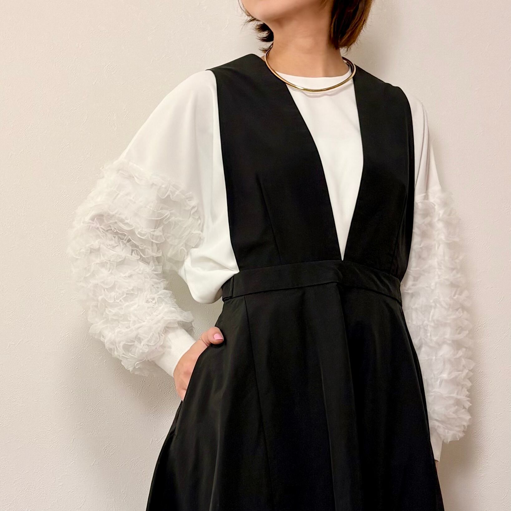 袖部分は軽やかなチュール素材を重ね、異素材のコントラストを楽しめます。