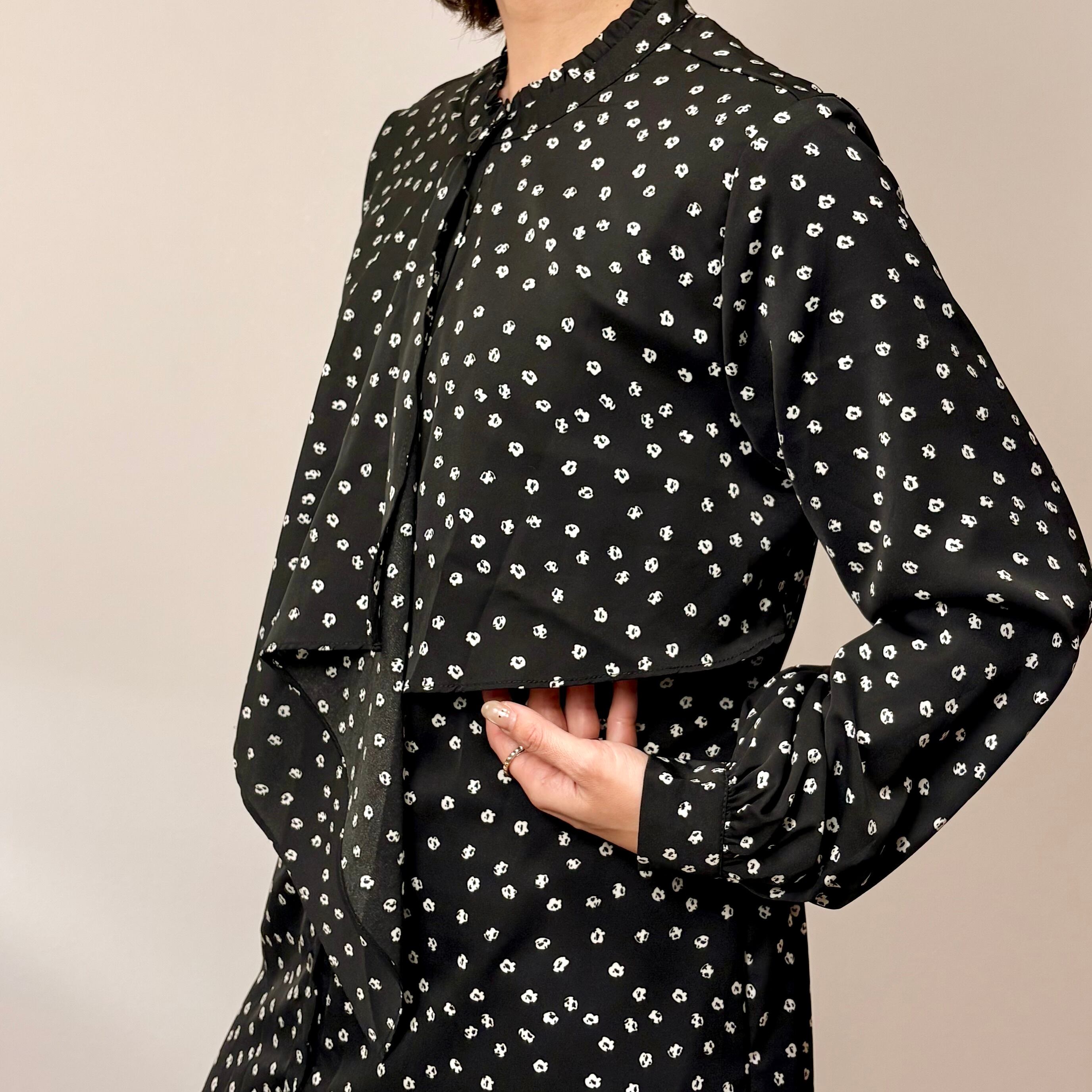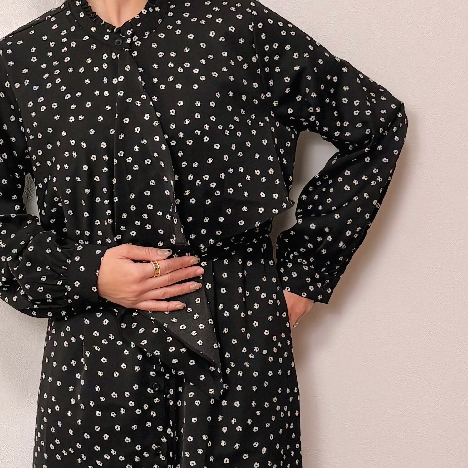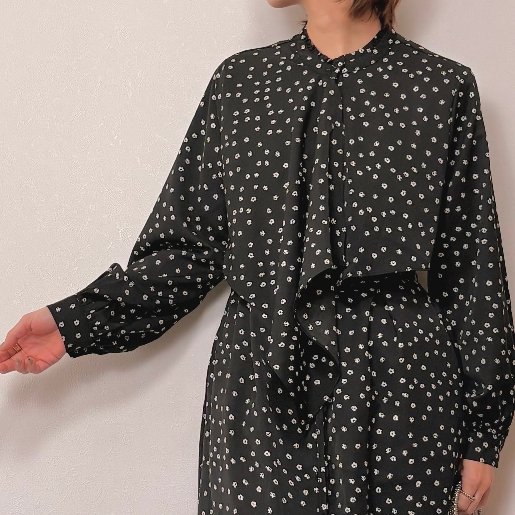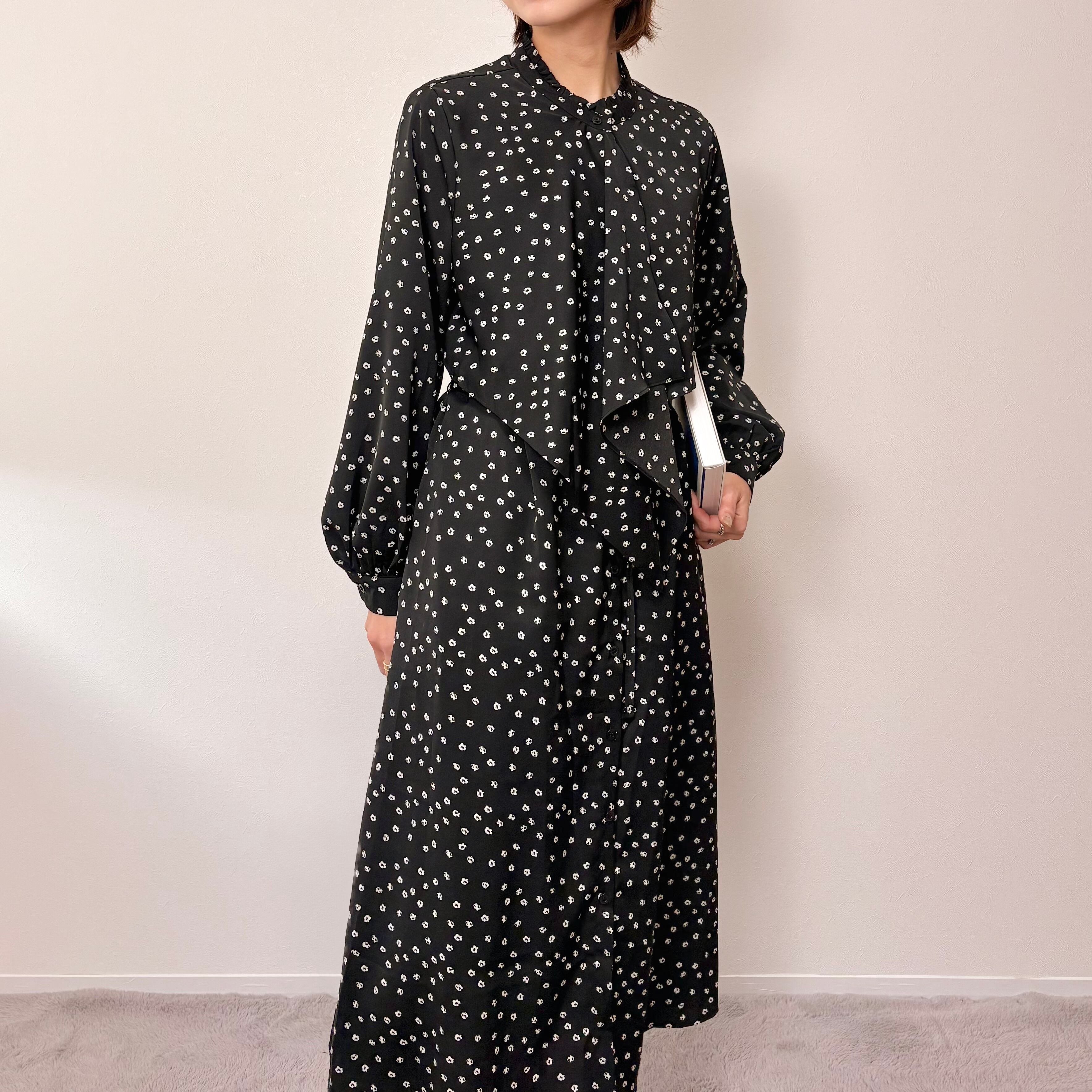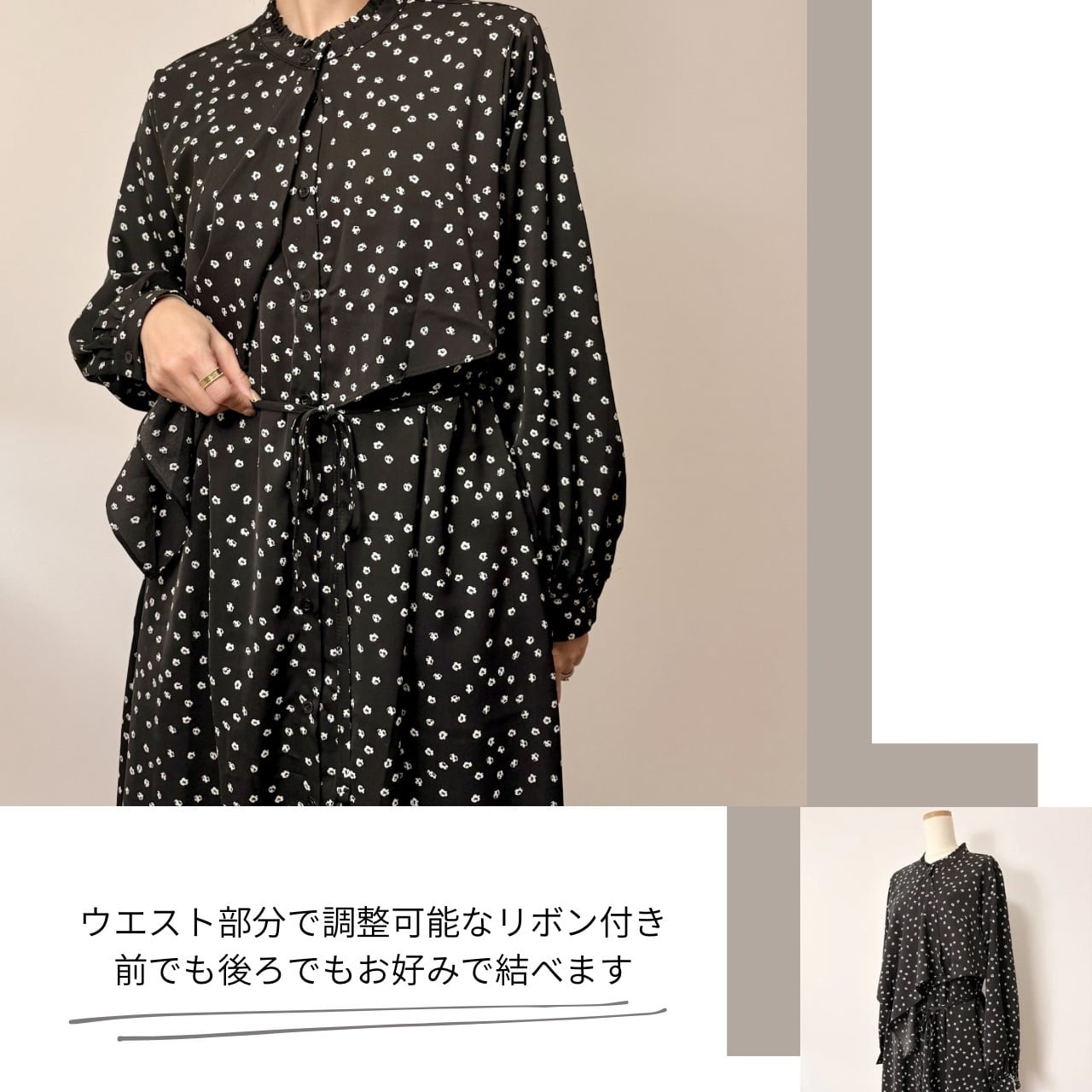 小花柄シャツワンピース / レディース ワンピース 長袖 ロング丈 大人 きれいめ 上品 シンプル スカーフ風 デザイン 総柄 フレアデザイン 春ワンピ フリーサイズ 30代 40代 50代 春 秋 A16804