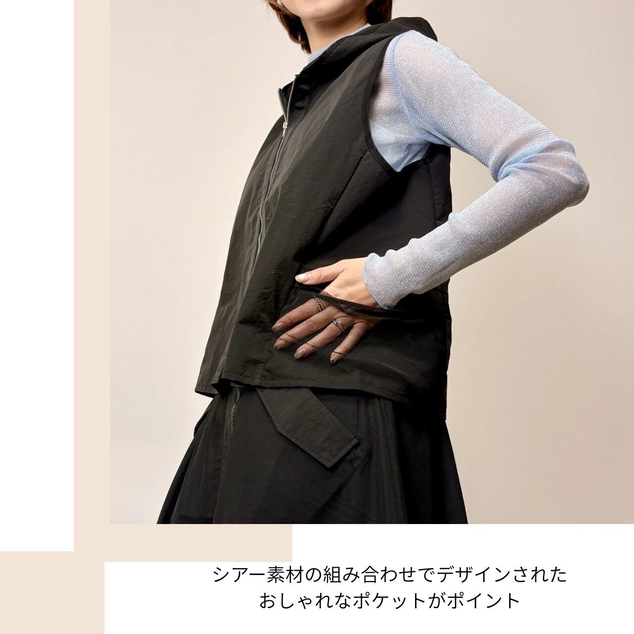 フードジップベスト / 【セットアップ対応】ベスト ナイロンライク 軽量ベスト ゆったり クロップド ショート シアー シースルー カジュアル 大人 フリーサイズ レディース セット コーディネート 上下セット レイヤード A16408