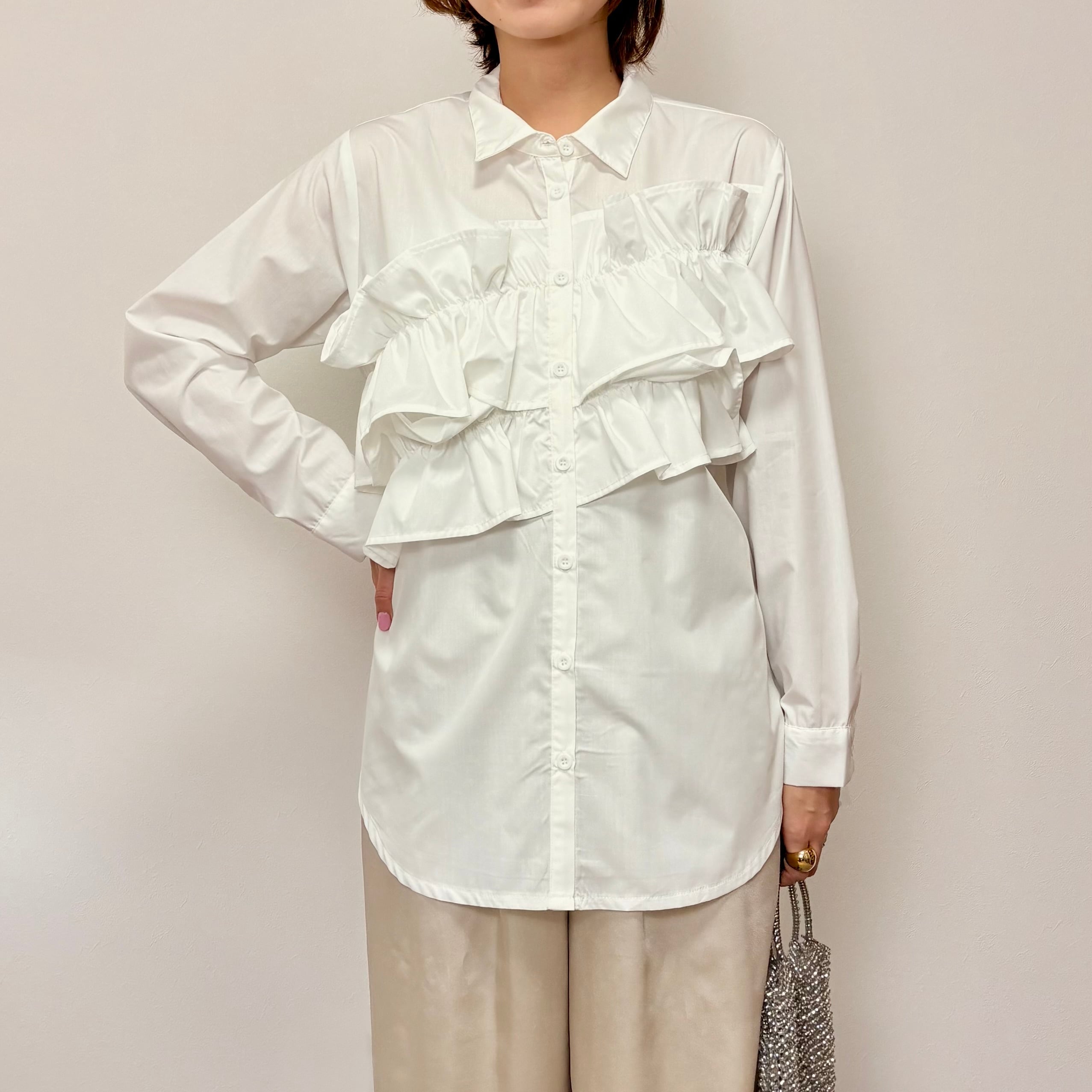 斜めに大胆に入ったアシンメトリーフリルが印象的な一枚。