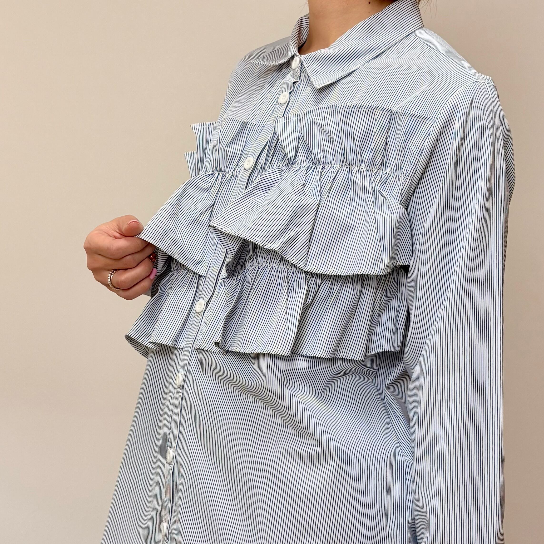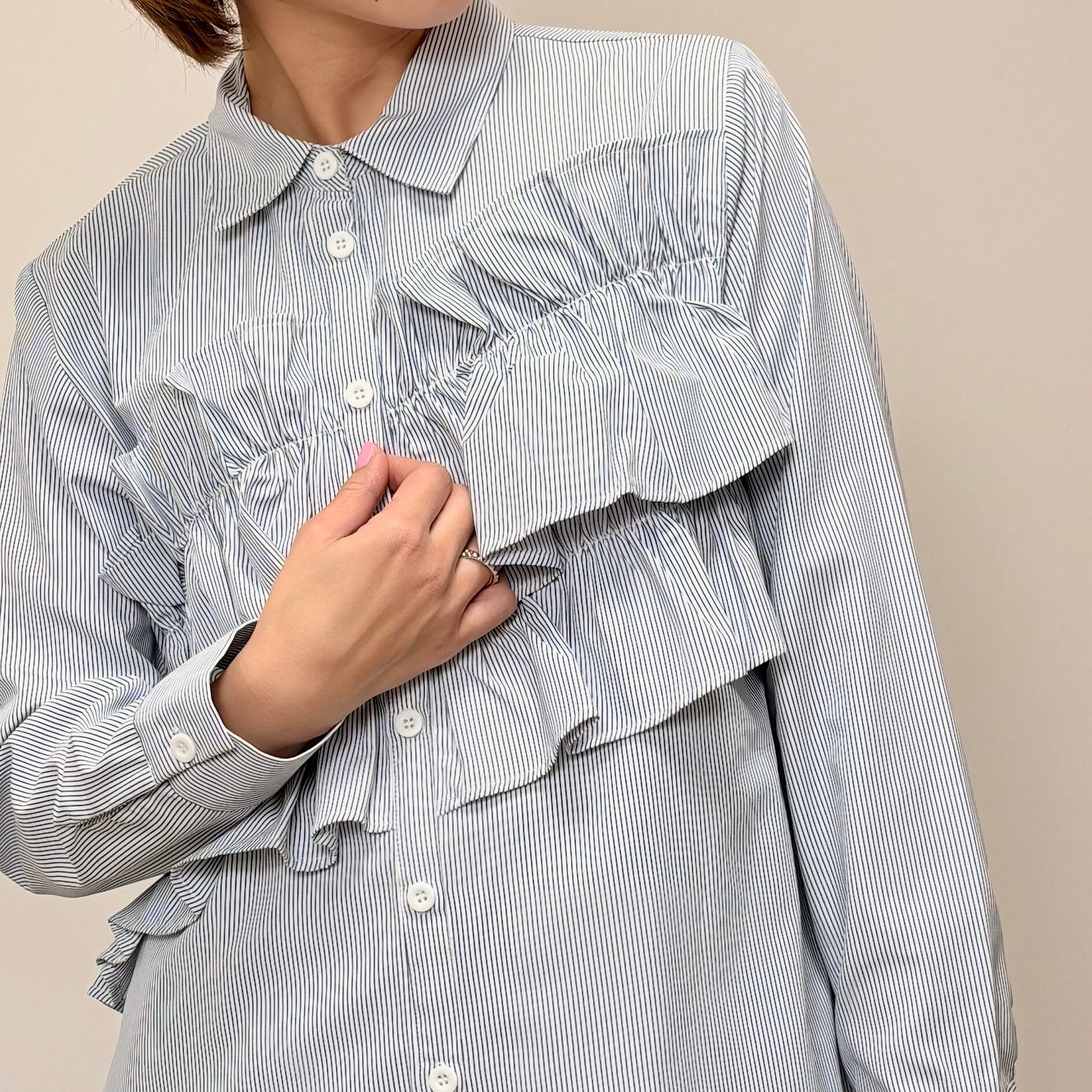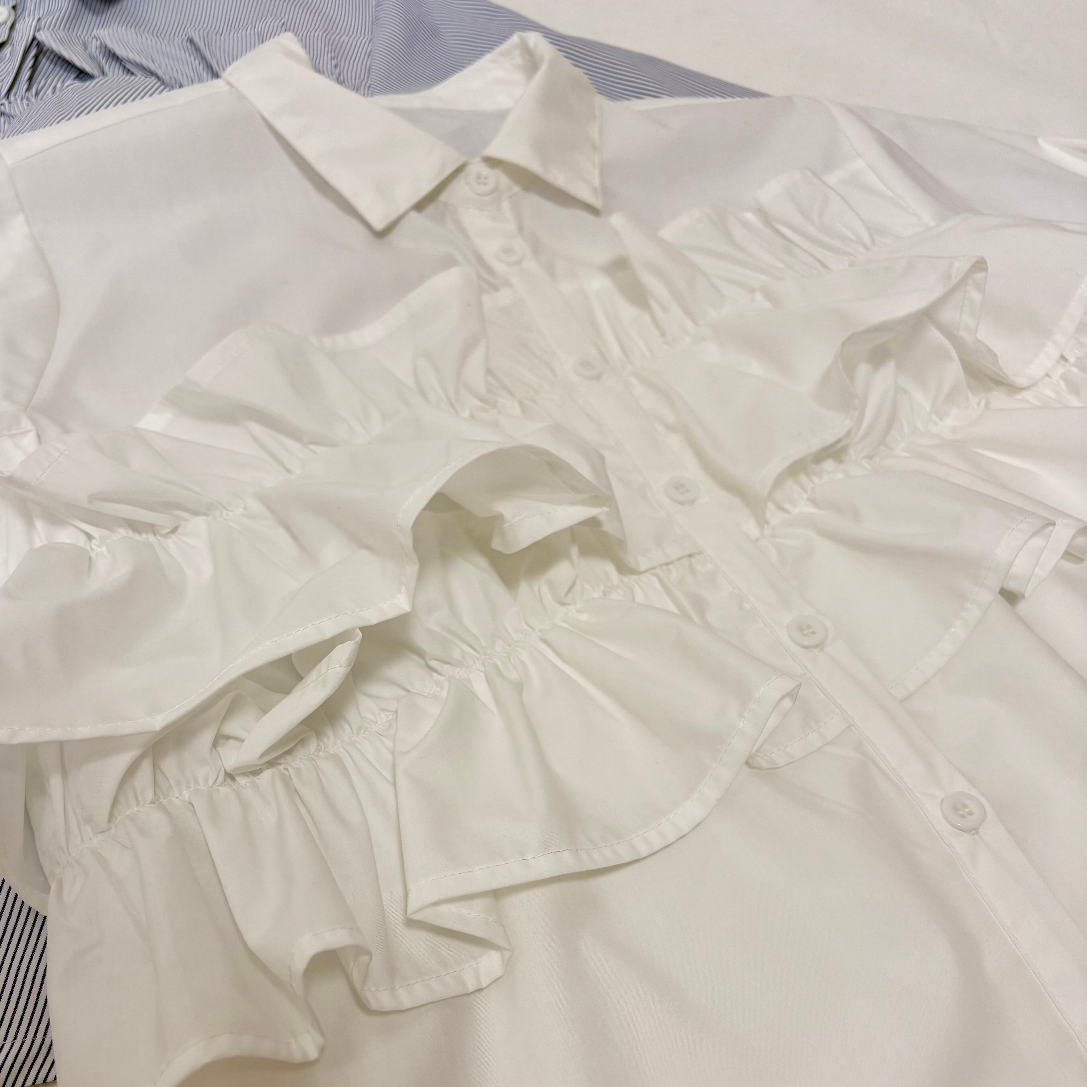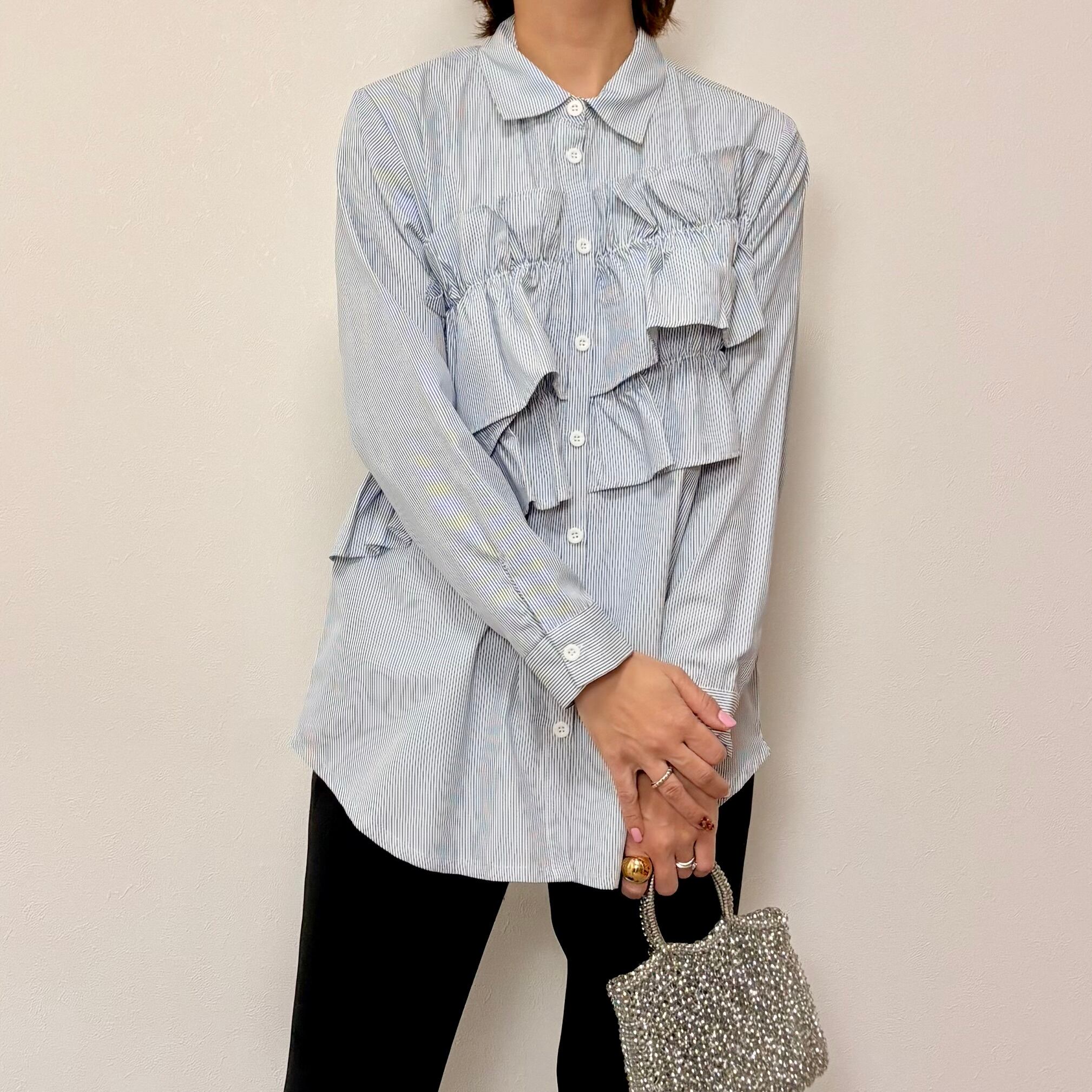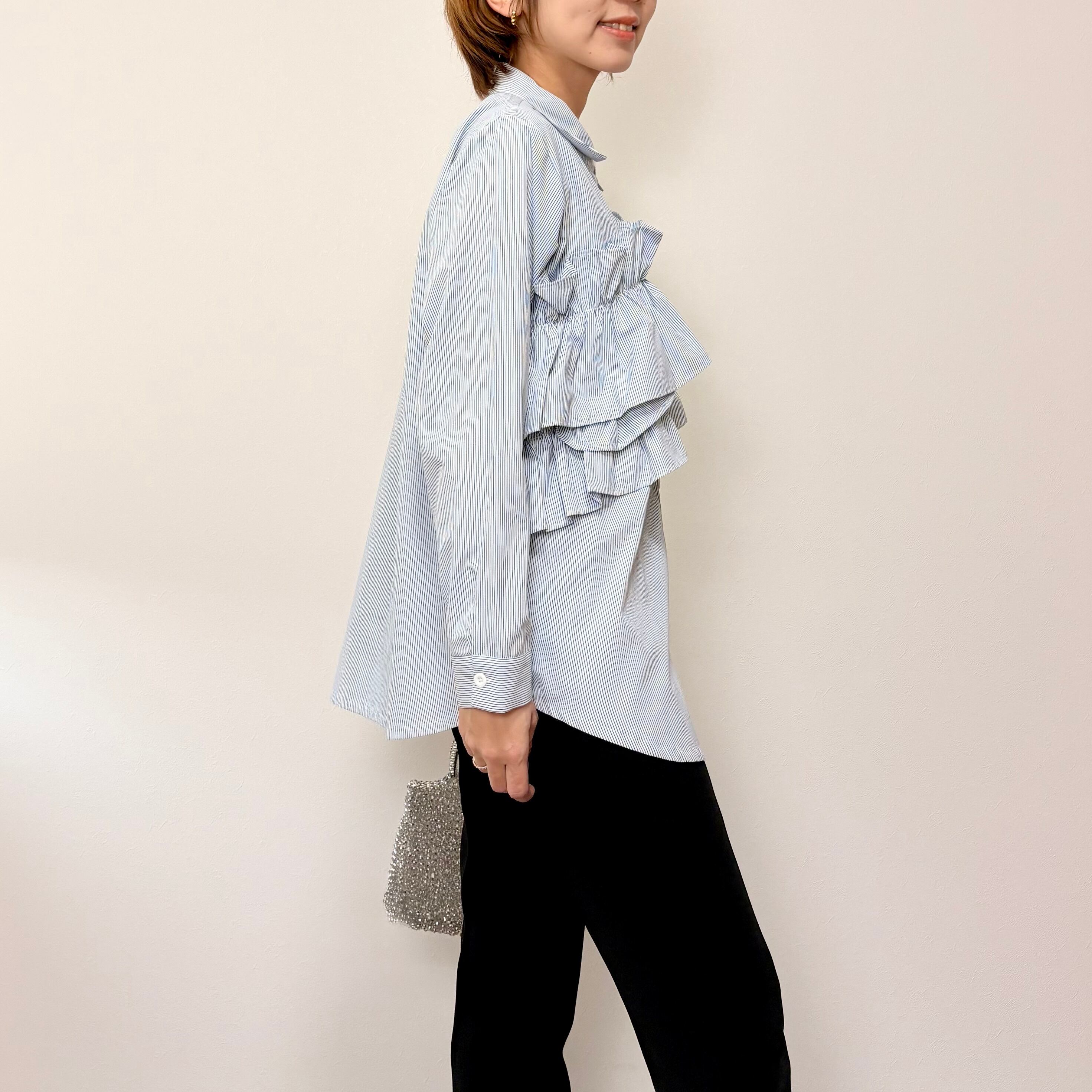 子どもっぽくならない“大人仕様のフリルシャツ”に仕上げました。
