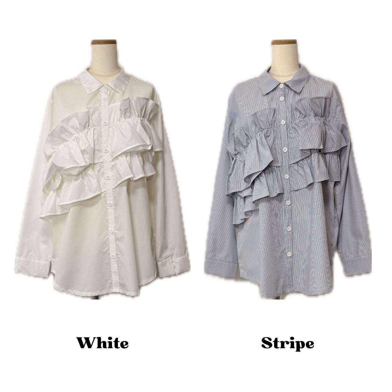 【NEW】アシンメトリーフリルシャツ / piacere ピアッチェーレ レディース トップス ブラウス 立体 ボリュームフリル 長袖 前開き デザインシャツ 大人 きれいめ 華やか 体型カバー トレンド ホワイト ストライプ フリーサイズ 30代 40代 50代 春 秋 P26017