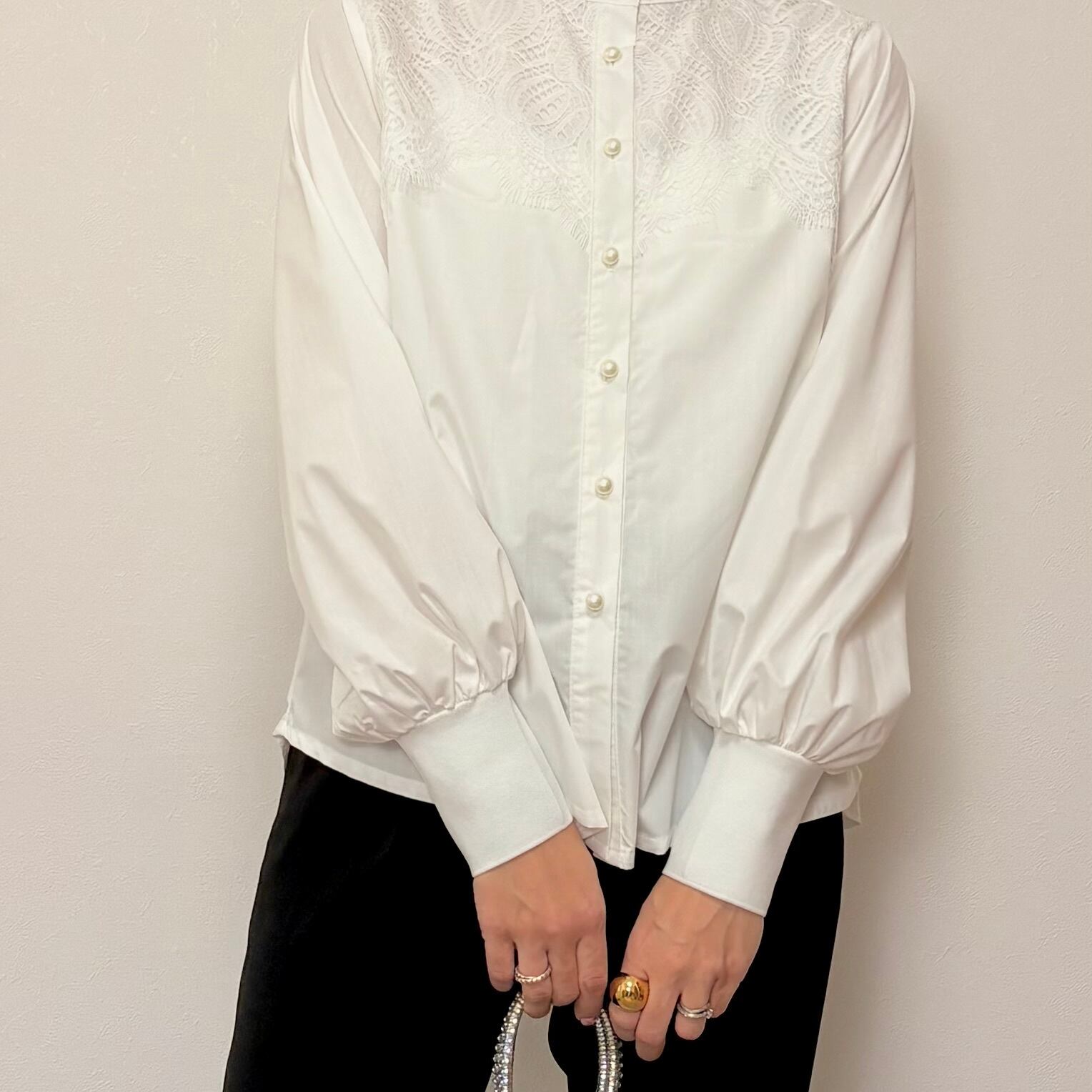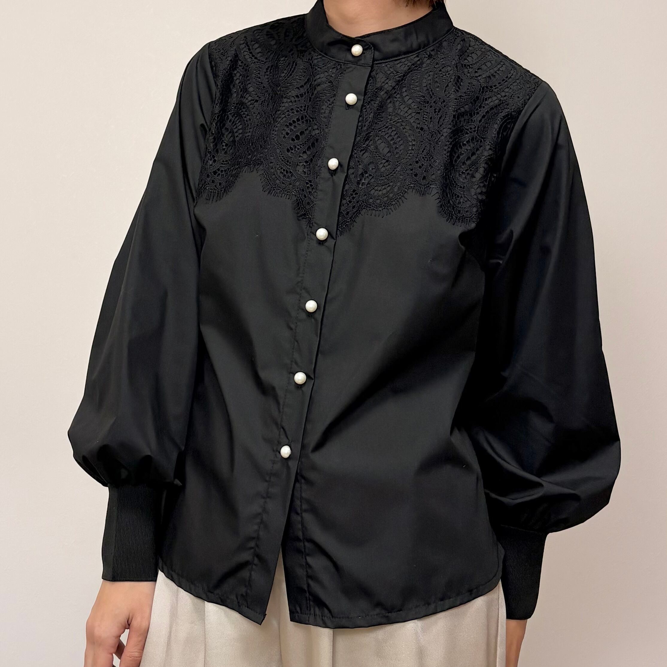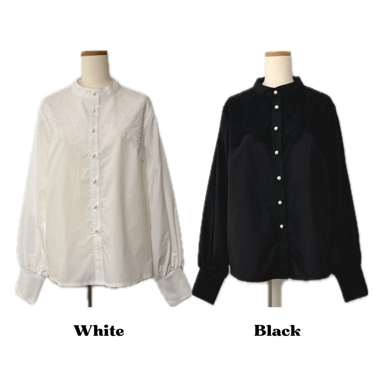 【NEW】ショルダーレースブラウス / piacere ピアッチェーレ レディース トップス ブラウス レース バンドカラー 長袖 前開き デザインシャツ パフスリーブ 袖ゴム 大人 きれいめ 体型カバー オフィス ホワイト ブラック フリーサイズ 30代 40代 50代 春 秋 P26015