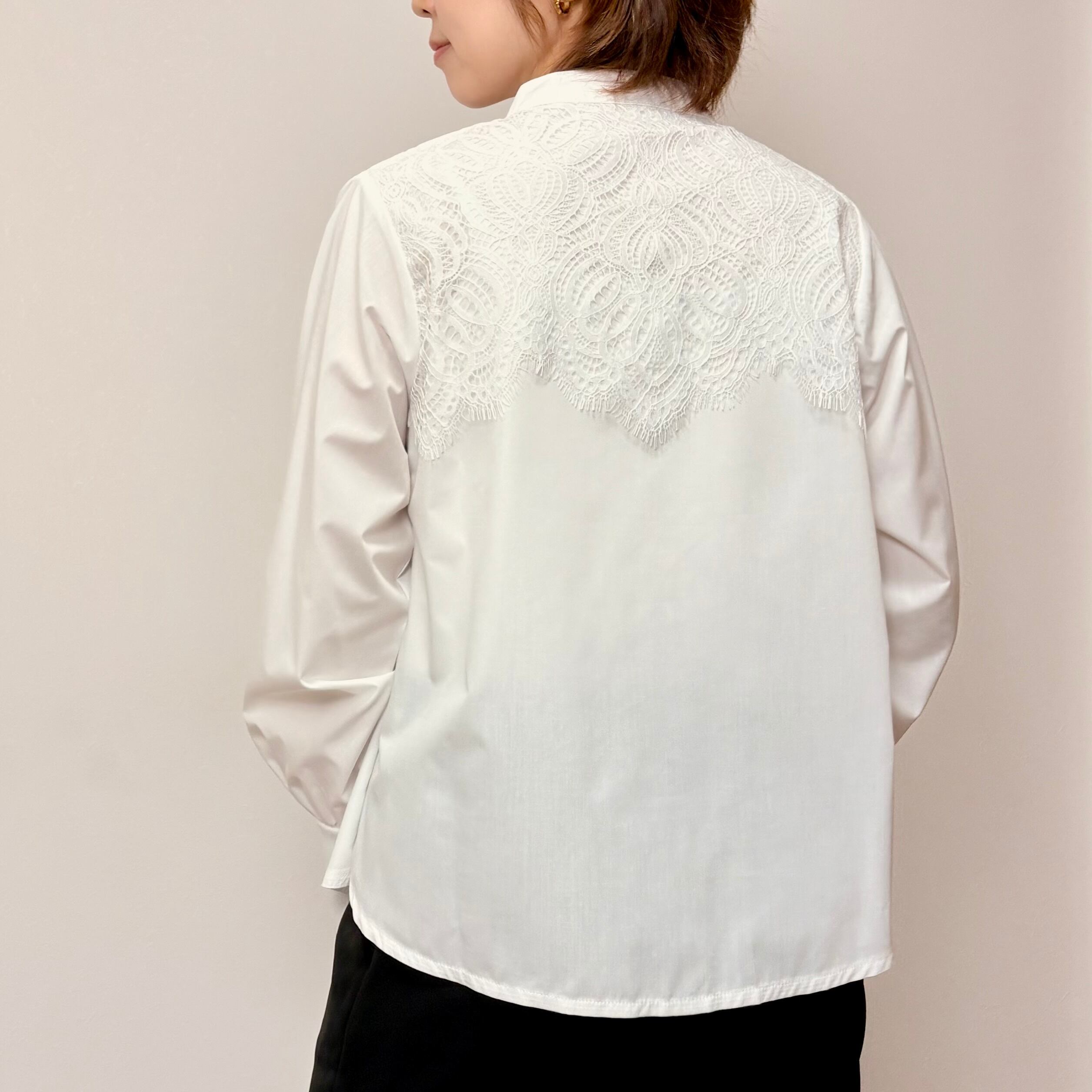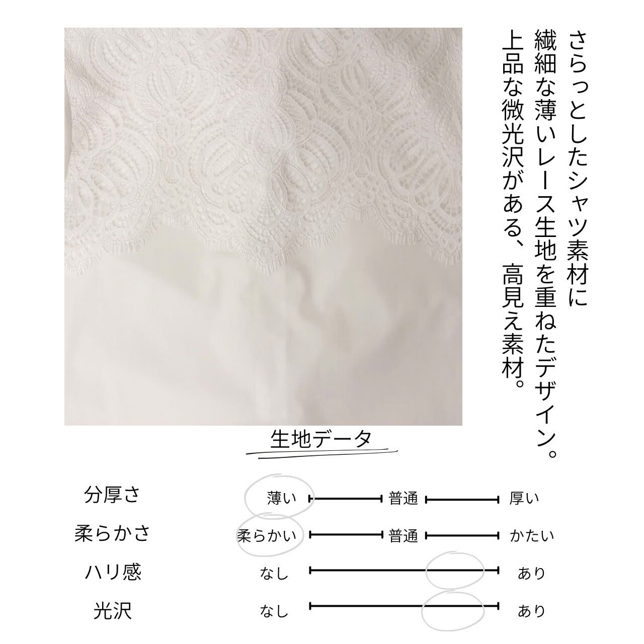 肩から胸元、そして背中まで重ねられたレース切替が印象的な一枚。