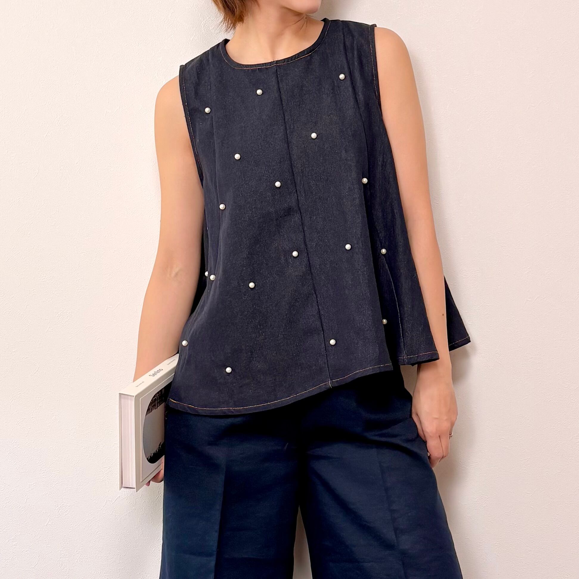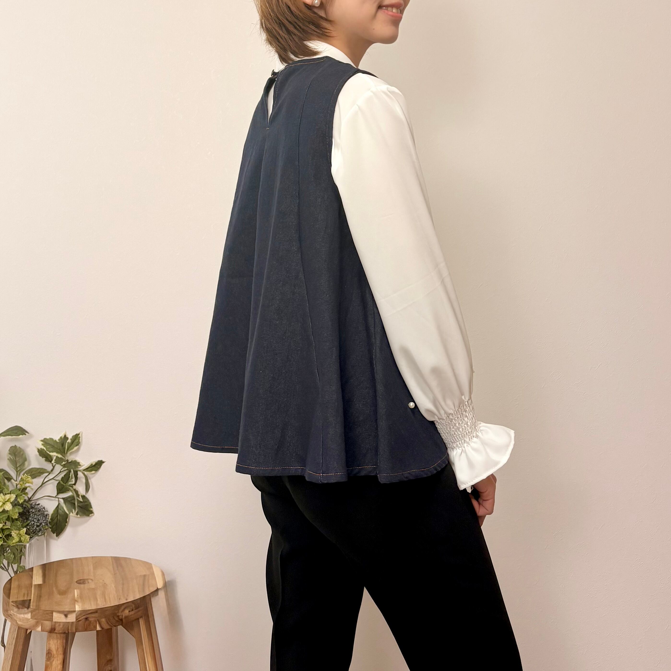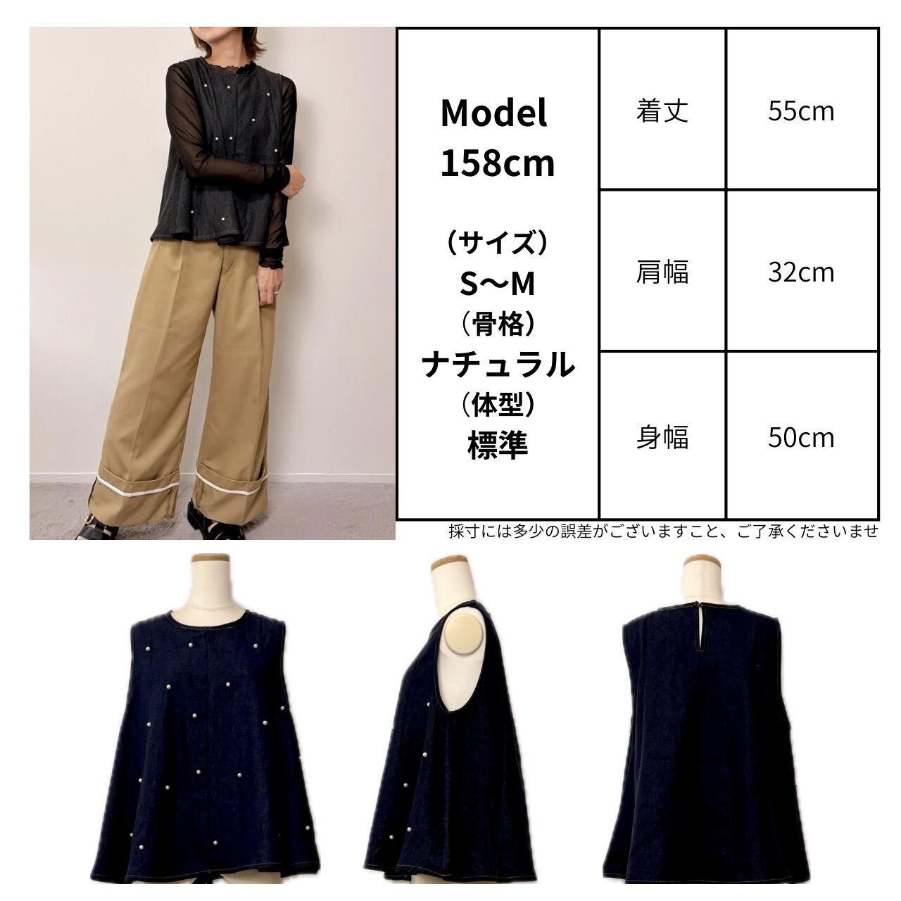 【NEW】パールデザインフレアベスト / トップス ベスト ストレッチ パール フレア ぺプラム 体型カバー ゆったり デニム生地 デニム風 ブルーデニム ブラックデニム 可愛い カジュアル 大人 フリーサイズ レディース レイヤード 重ね着 A16407