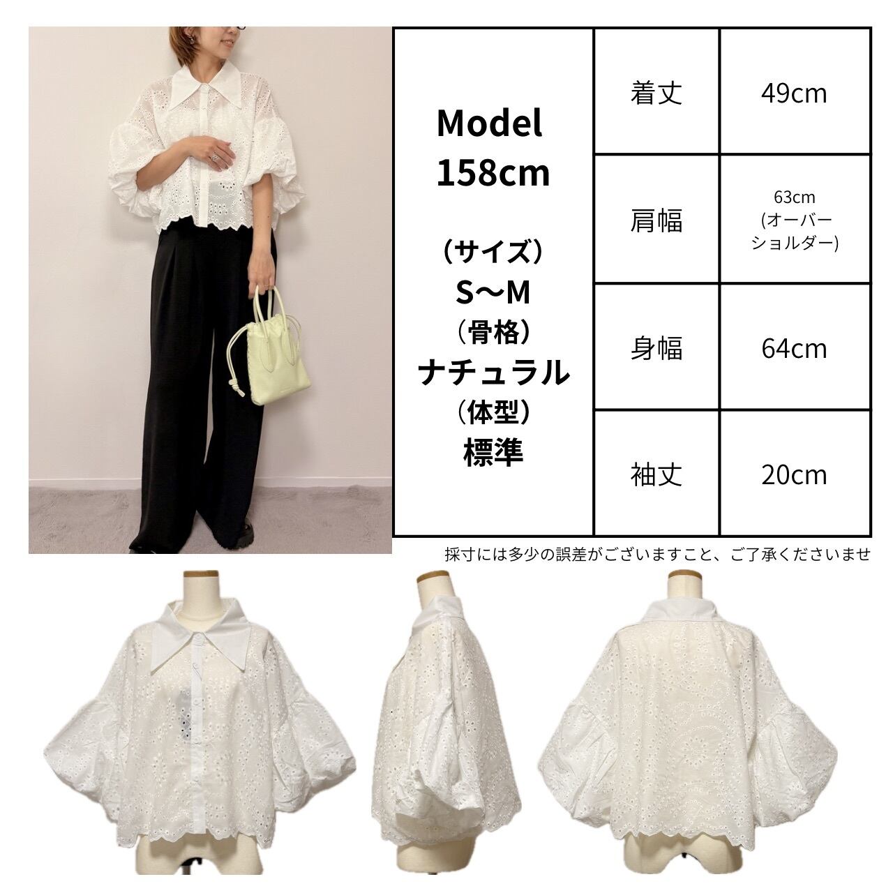 着丈 49cm / 肩幅 63cm(オーバーショルダー) / 身幅 64cm / 袖丈20cm