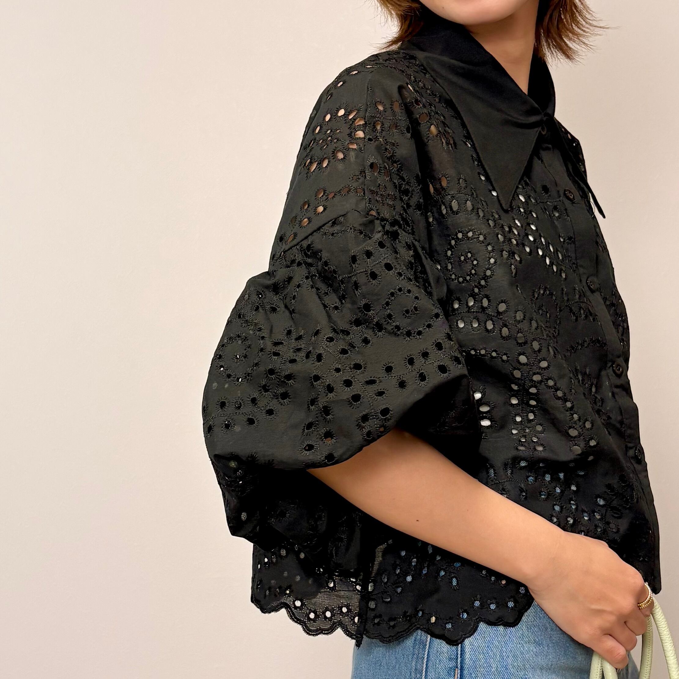 繊細なカットワークレースと、存在感のあるビッグカラー、そしてボリューミーなフレア袖が印象的な一枚。
