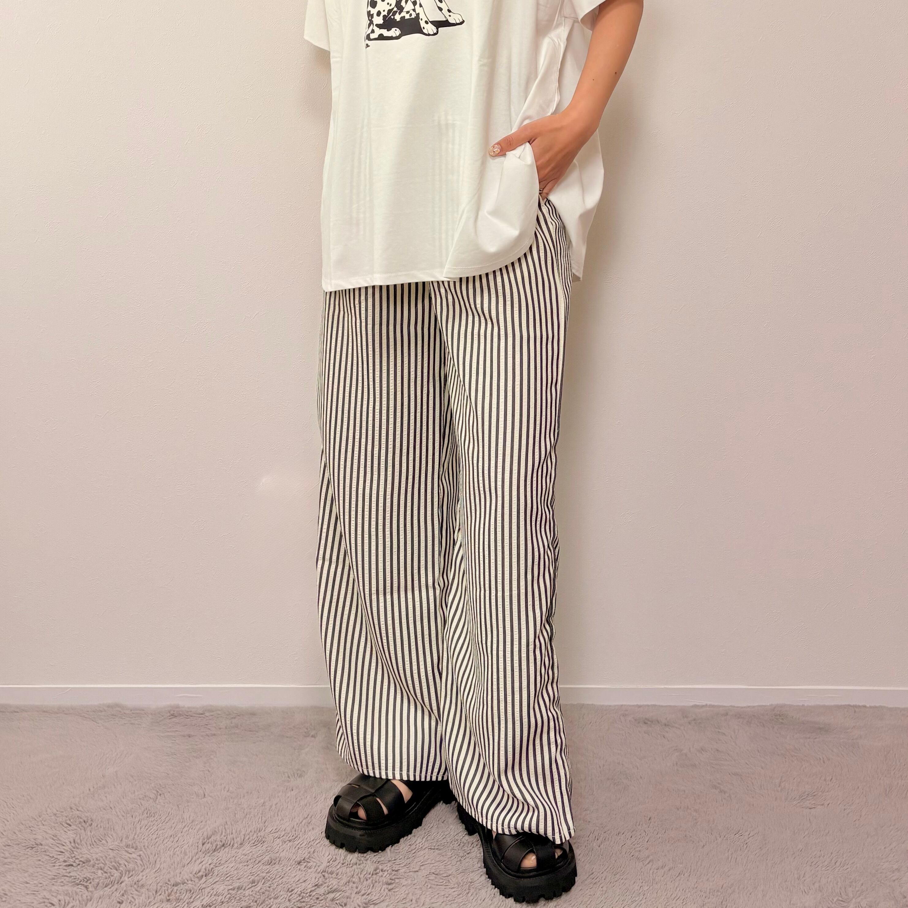 【NEW】ストライプイージーワイドパンツ /ボトム パンツ ズボン ワイドパンツ ロング 軽量 軽い 柔らかい ウエストゴム リラックスパンツ 薄手 涼しい 暑さ対策 ゆったり 体型カバー 細見え 縦ストライプ きれいめ 大人カジュアル シアサッカー サッカー生地 /N26603