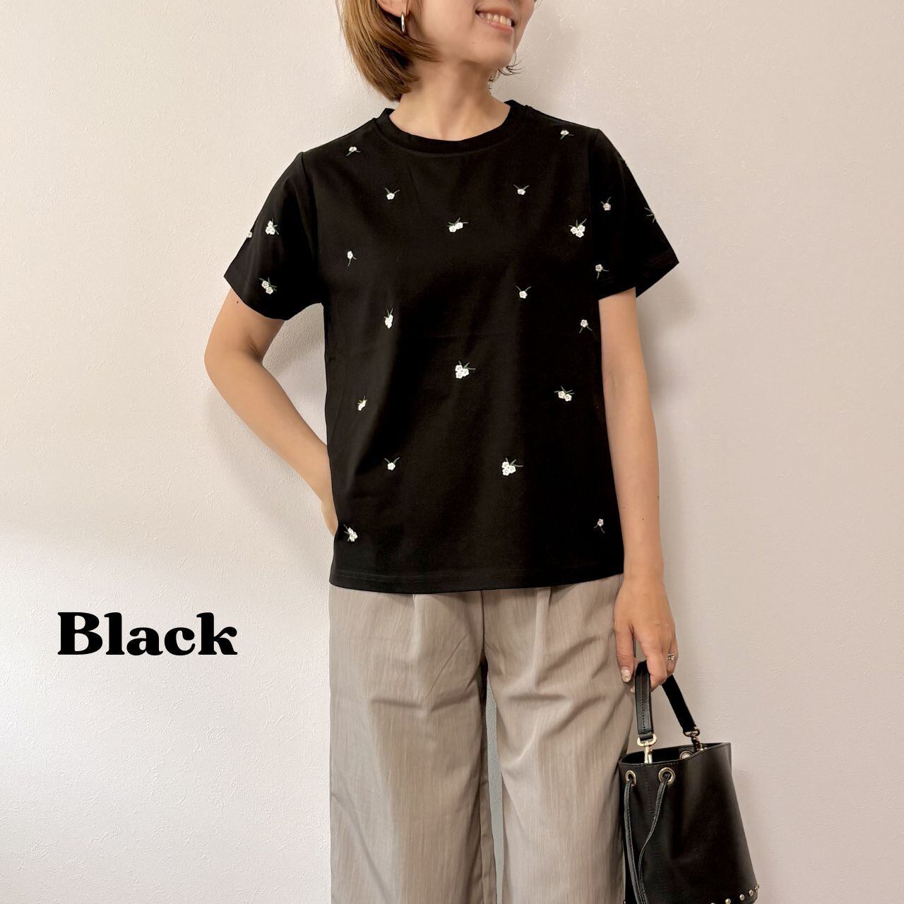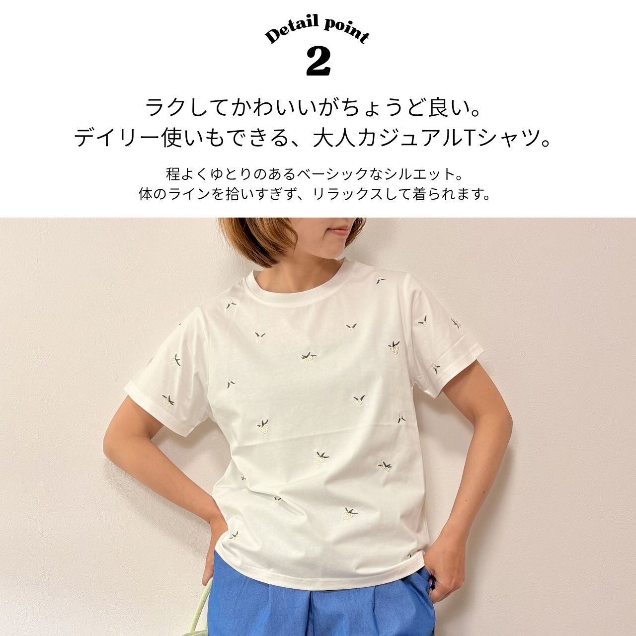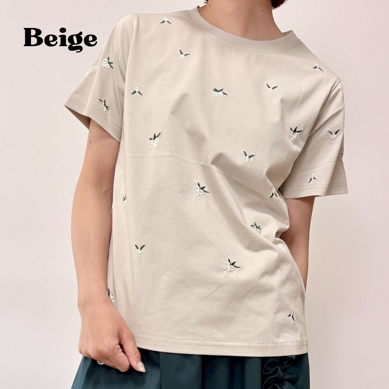 シンプルなTシャツに、小花柄の刺繍を散りばめた上品なデザイン。