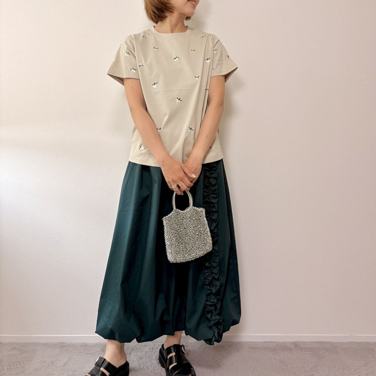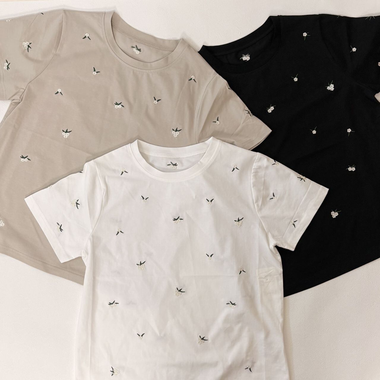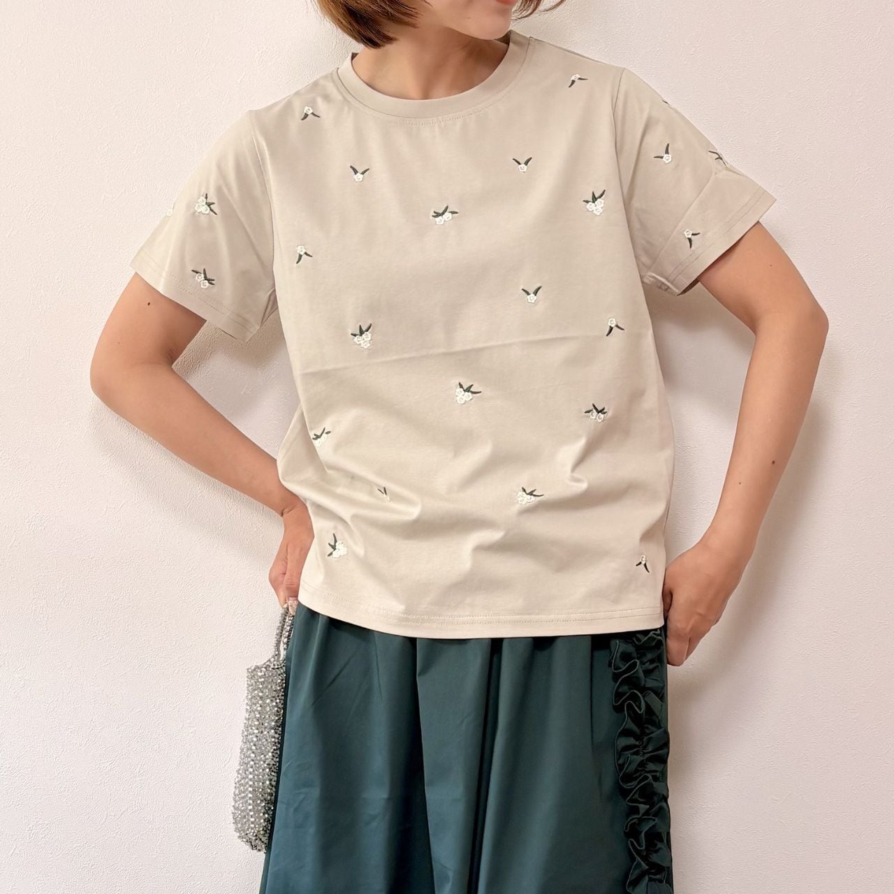 シンプルなTシャツに、小花柄の刺繍を散りばめた上品なデザイン。